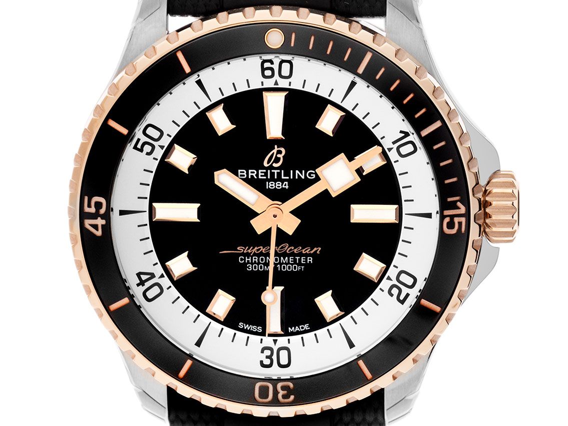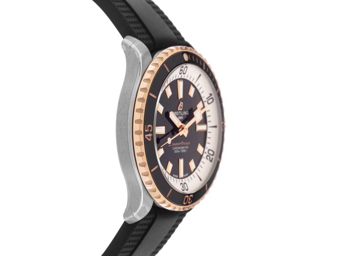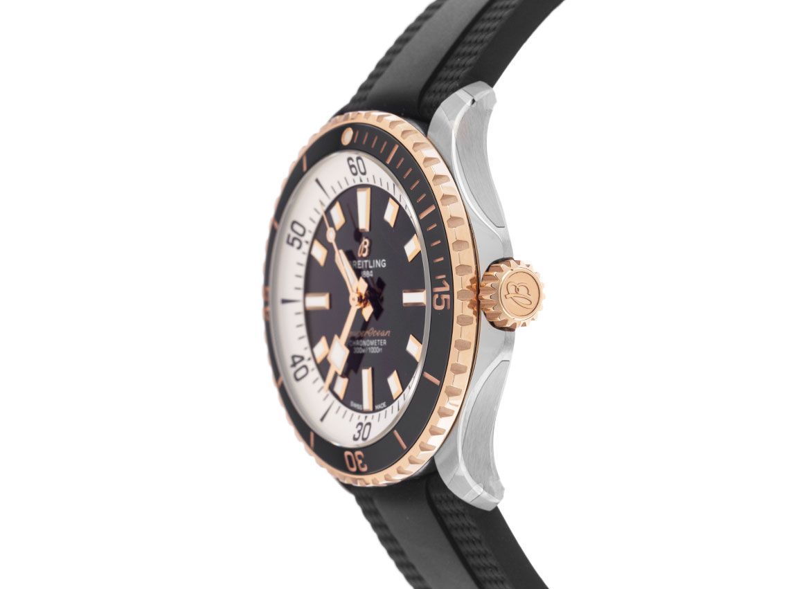 Breitling Superocean Stahl 18kt Roségold vergoldet Automatik Chronometer Armband Kautschuk FaltschließeGehäuse Edelstahl poliert und satiniert, Gehäusedurchmesser ohne Krone 42mm, Gehäusehöhe 12,5mm. Lünette 18kt Roségold geriffelt mit schwarzem Keramik Inlay und 60-Minuten Skala, einseitig drehbar. Armband Kautschuk schwarz, Anstoßbreite 22mm, Sicherheitsfaltschließe Edelstahl mit Hersteller-Logo. Zifferblatt schwarz mit aufgesetzten roségoldenen Leuchtindexen und roségoldenen Leuchtzeigern. Uhrwerk Automatik, Chronometer mit Zeugnis, Kaliber Breitling 17 mit 26 Edelsteinen, Gangreserve ca. 38 Stunden. Anzeige von Stunde, Minute und Sekunde über Zeiger aus der Mitte mit Sekundenstopp zur sekundengenauen Einstellung der Uhrzeit. Saphirglas kratzfest, doppelseitig entspiegelt und bombiert. Krone verschraubbar mit Flankenschutz und Hersteller-Logo. Boden Edelstahl verschraubt und graviert. Gewicht der Uhr inklusive Armband 136g. Wasserdicht bis 30 ATM. Referenznummer: U17375211B1S1, ID: ST116093001225H-7750, Artikelnummer: 10000083983. Original Breitling Box und Garantie Papiere von 2025, Full Set. Ungetragen. Lieferzeit sofort.