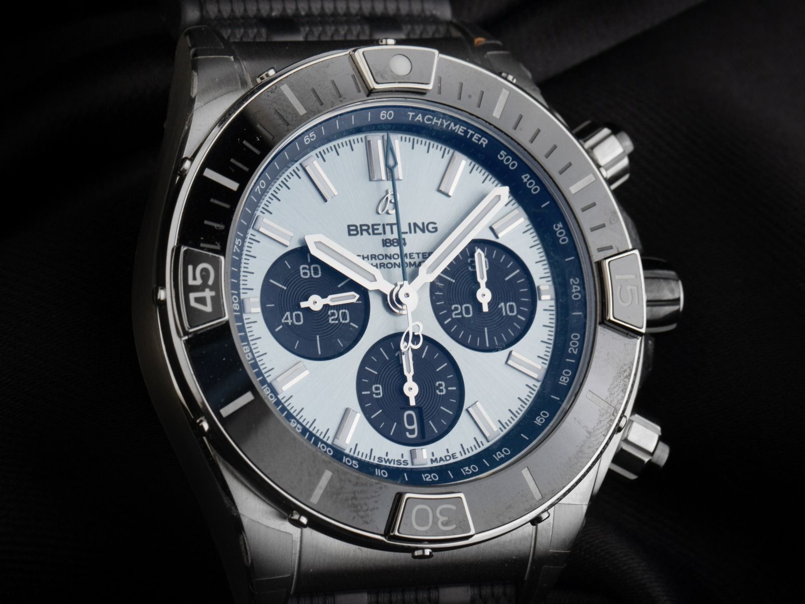 Cassa in acciaio satinato, diametro cassa senza corona 44mm, altezza cassa 14,4mm. Lunetta in acciaio con inserto in ceramica nera e scala dei 60 minuti, con punto luminoso, unidirezionale con blocco. Cinturino Breitling in caucciù blu in stile Rouleaux, larghezza dell'attacco 25mm, chiusura di sicurezza Breitling in acciaio con regolazione a perno e logo del produttore. Quadrante azzurro chiaro con indici luminosi in acciaio applicati e lancette luminose in acciaio. Movimento automatico, cronografo, cronometro con certificato, calibro manifattura Breitling 01 con 47 pietre preziose, riserva di carica di circa 70 ore. Indicazione di ore e minuti tramite lancette centrali, piccolo secondo con fermo secondo per la regolazione precisa dell'ora a 9 ore, indicazione della data con regolazione rapida a 6 ore. Vetro zaffiro antigraffio, antiriflesso su entrambi i lati e bombato. Corona a vite con protezione laterale e logo del produttore. Fondello in acciaio avvitato e inciso con finestra in vetro zaffiro. Peso dell'orologio incluso il cinturino 167g. Impermeabile fino a 20 ATM. Numero di riferimento: PB0136251C1S1, ID: ST1160151801225H-12650, numero articolo: 10000083991. Scatola originale Breitling con confezione esterna e documenti di garanzia del 2025, Full Set. Mai indossato. Tempi di consegna immediati.