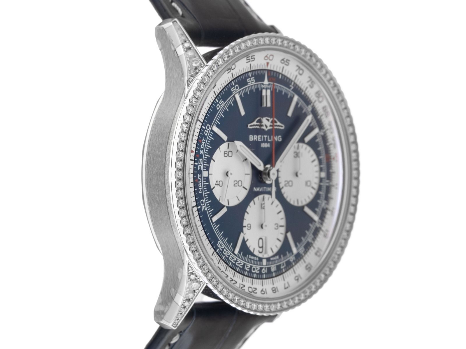 Breitling Navitimer B01 Stahl Automatik Chronograph Armband Krokoleder FaltschließeGehäuse Edelstahl poliert, Anstöße mit Diamanten besetzt, Gehäusedurchmesser ohne Krone 42mm, Gehäusehöhe 13,7mm. Lünette Edelstahl mit Diamanten besetzt, Unterglas Rechenschieber, beidseitig drehbar. Armband Krokoleder blau mit heller Ziernaht, Anstoßbreite 22mm, Breitling Sicherheitsfaltschließe Edelstahl mit Hersteller-Logo. Zifferblatt blau mit aufgesetzten Edelstahl Leuchtindexen und Edelstahl Leuchtzeigern. Uhrwerk Automatik, Chronograph, Chronometer mit Zeugnis, Breitling Manufakturkaliber B01 mit 47 Edelsteinen, Gangreserve ca. 70 Stunden. Anzeige von Stunde und Minute über Zeiger aus der Mitte, kleine Sekunde mit Sekundenstopp zur sekundengenauen Einstellung der Uhrzeit bei 9 Uhr, Datumsanzeige mit Schnellverstellung bei 6 Uhr. Saphirglas kratzfest, doppelseitig entspiegelt und bombiert. Krone mit Hersteller-Logo. Boden Edelstahl verschraubt und graviert mit Saphirglas Sichtfenster. Gewicht der Uhr inklusive Armband 90g. Wasserdicht bis 3 ATM. Referenznummer: AB0139631C1P1, ID: ST6102202201225H-16850, Artikelnummer: 10000084001. Original Breitling Box und Garantie Papiere von 2025, Full Set. Ungetragen. Lieferzeit sofort.