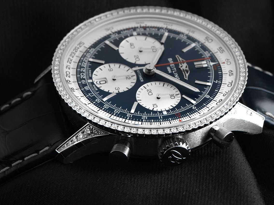 Cassa in acciaio lucido, anse incastonate con diamanti, diametro della cassa senza corona 42mm, altezza della cassa 13,7mm. Lunetta in acciaio con diamanti, regolo calcolatore sotto vetro, girevole su entrambi i lati. Cinturino in pelle di coccodrillo blu con cuciture chiare, larghezza delle anse 22mm, chiusura deployante di sicurezza Breitling in acciaio con logo del produttore. Quadrante blu con indici e lancette in acciaio luminescenti applicati. Movimento automatico, cronografo, cronometro con certificato, calibro manifattura Breitling B01 con 47 pietre preziose, riserva di carica di circa 70 ore. Indicazione di ore e minuti tramite lancette centrali, piccolo secondo con fermo secondo per la regolazione precisa dell'ora a ore 9, indicazione della data con regolazione rapida a ore 6. Vetro zaffiro antigraffio, antiriflesso su entrambi i lati e bombato. Corona con logo del produttore. Fondello in acciaio avvitato e inciso con finestra in vetro zaffiro. Peso dell'orologio incluso il cinturino 90g. Impermeabile fino a 3 ATM. Numero di riferimento: AB0139631C1P1, ID: ST6102202201225H-16850, numero articolo: 10000084001. Scatola originale Breitling e documenti di garanzia del 2025, Full Set. Mai indossato. Tempi di consegna immediati.