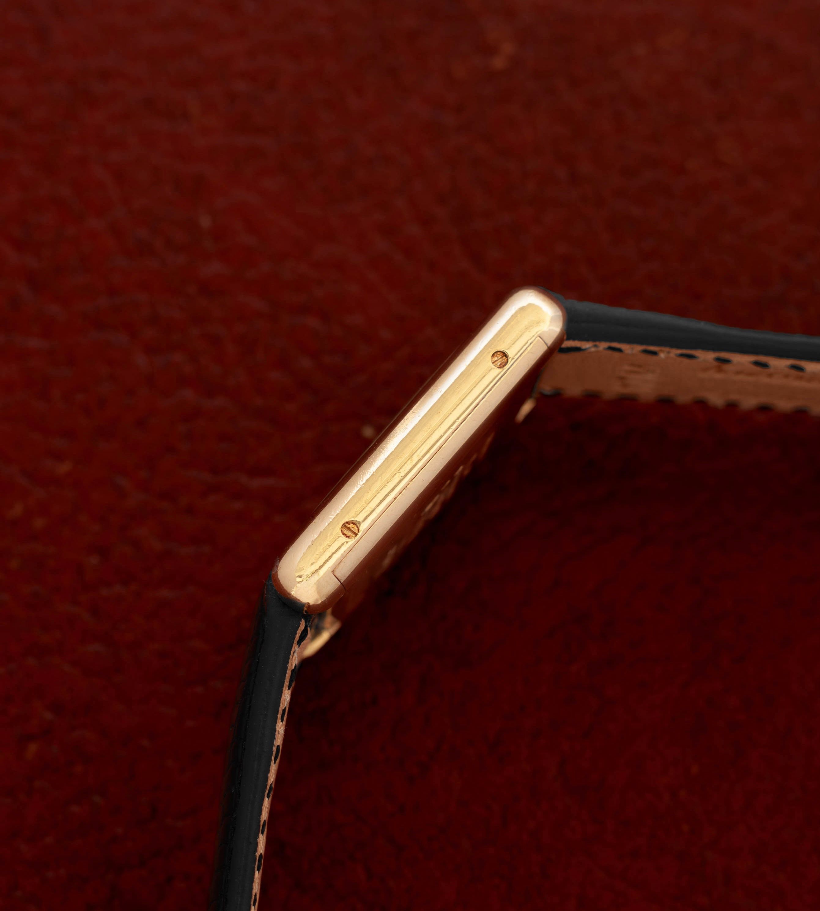 Caratteristico è che gli orologi Must Cartier Tank sono dotati di una cassa in argento, dorata in oro. Questo modello è di grande dimensione, noto anche come LM (Large Model), con dimensioni di 23 x 30 mm. Spesso vediamo che la doratura su orologi di questo tipo tende a usurarsi nel tempo, con gli angoli che diventano particolarmente più chiari. Tuttavia, la cassa di questo Tank Must rimane in buone condizioni vintage, mostrando una leggera scoloritura sugli angoli, che non è visivamente distraente. Si prega di notare che le nostre fotografie sono scattate in alta risoluzione, il che può far apparire alcune imperfezioni più pronunciate nelle immagini rispetto alla realtà.