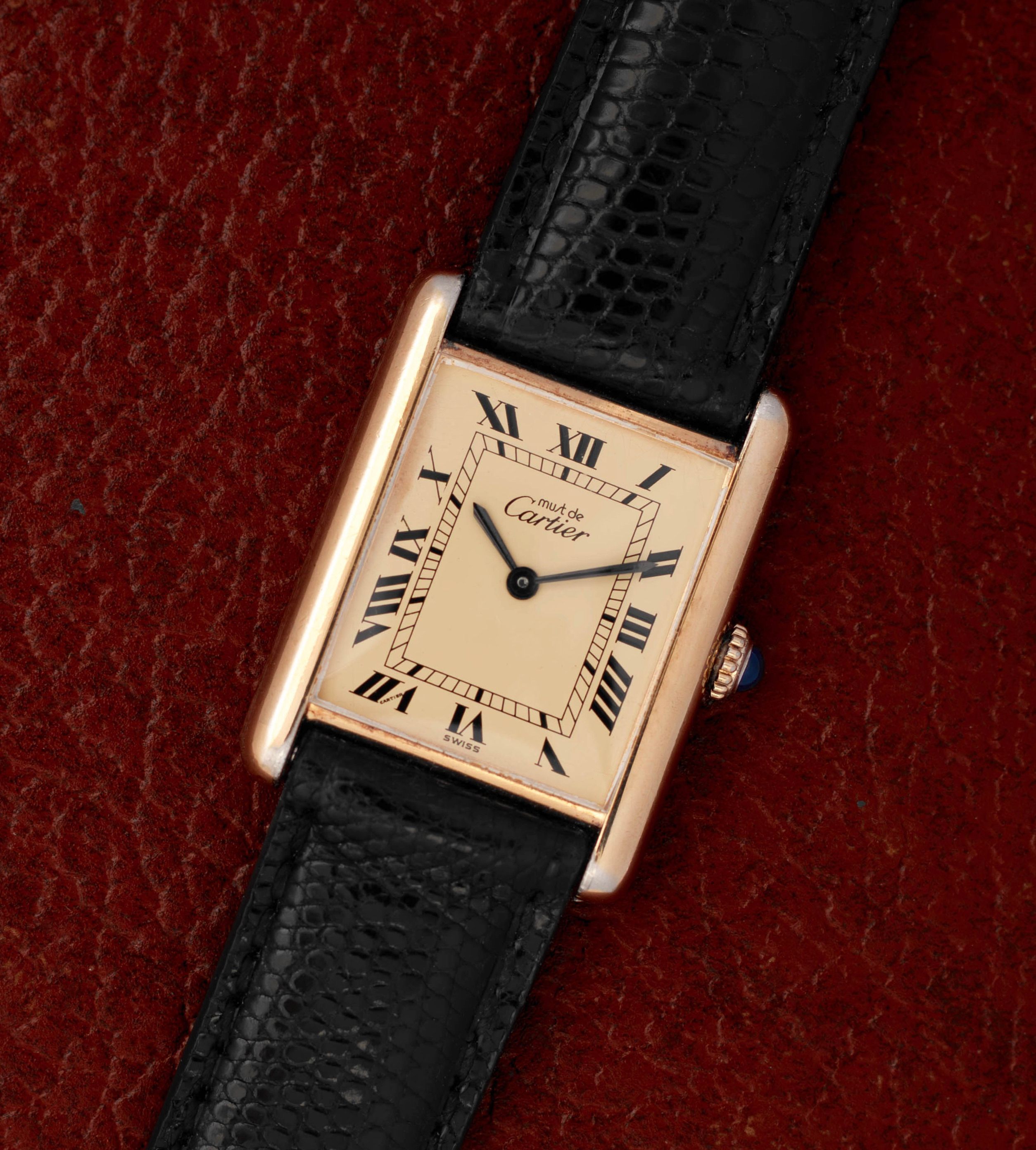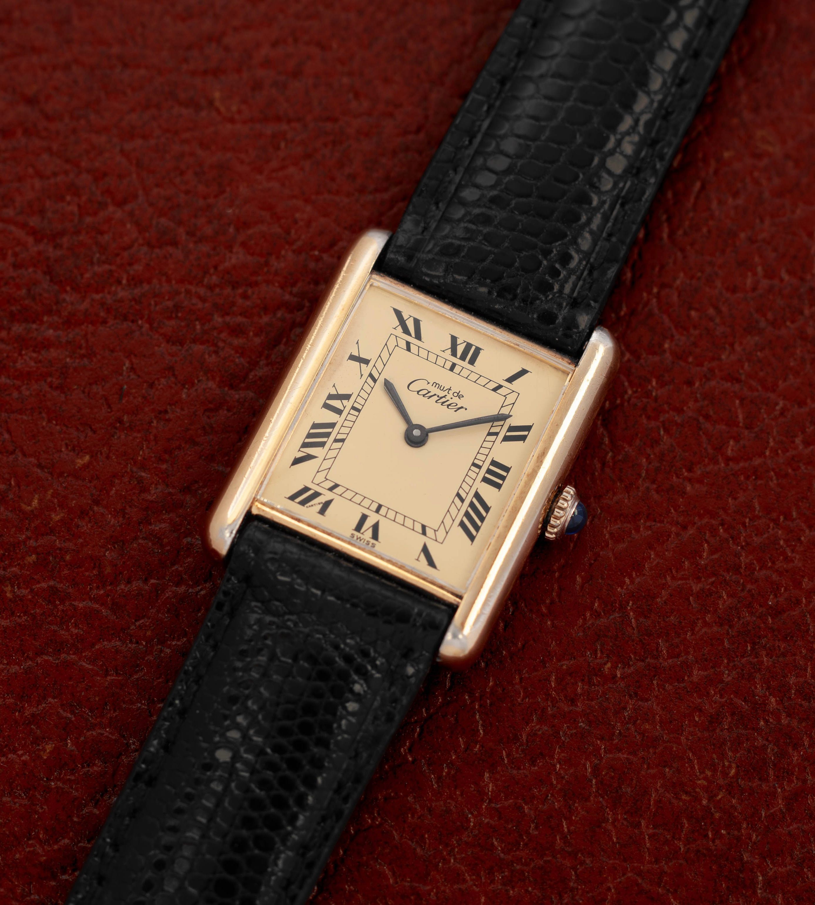 The Must de Cartier Tank watch that we present here is equipped with the so called lemon Roman dial. The name refers to the beige/light orange color in combination with the Roman hour markers. This ensures that the dial contains all the characteristic features that a vintage Cartier Tank should have. This type of dials was made with a kind of lacquer layer, which gives a porcelain like appearance.Characteristic is that the Must Cartier Tank watches are equipped with a silver case, gilded with gold. This model concerns the large size, also known as LM (Large Model), with dimensions of 23 x 30 mm. We often see that the gold plating on watches of this type tends to wear over time, with the corners in particular becoming lighter. However, the case of this Tank Must remains in good vintage condition, showing slight discolouration on the corners, which is not visually distracting. Please note that our photographs are taken in high resolution, which can make certain imperfections appear more pronounced in images than they do in real life.