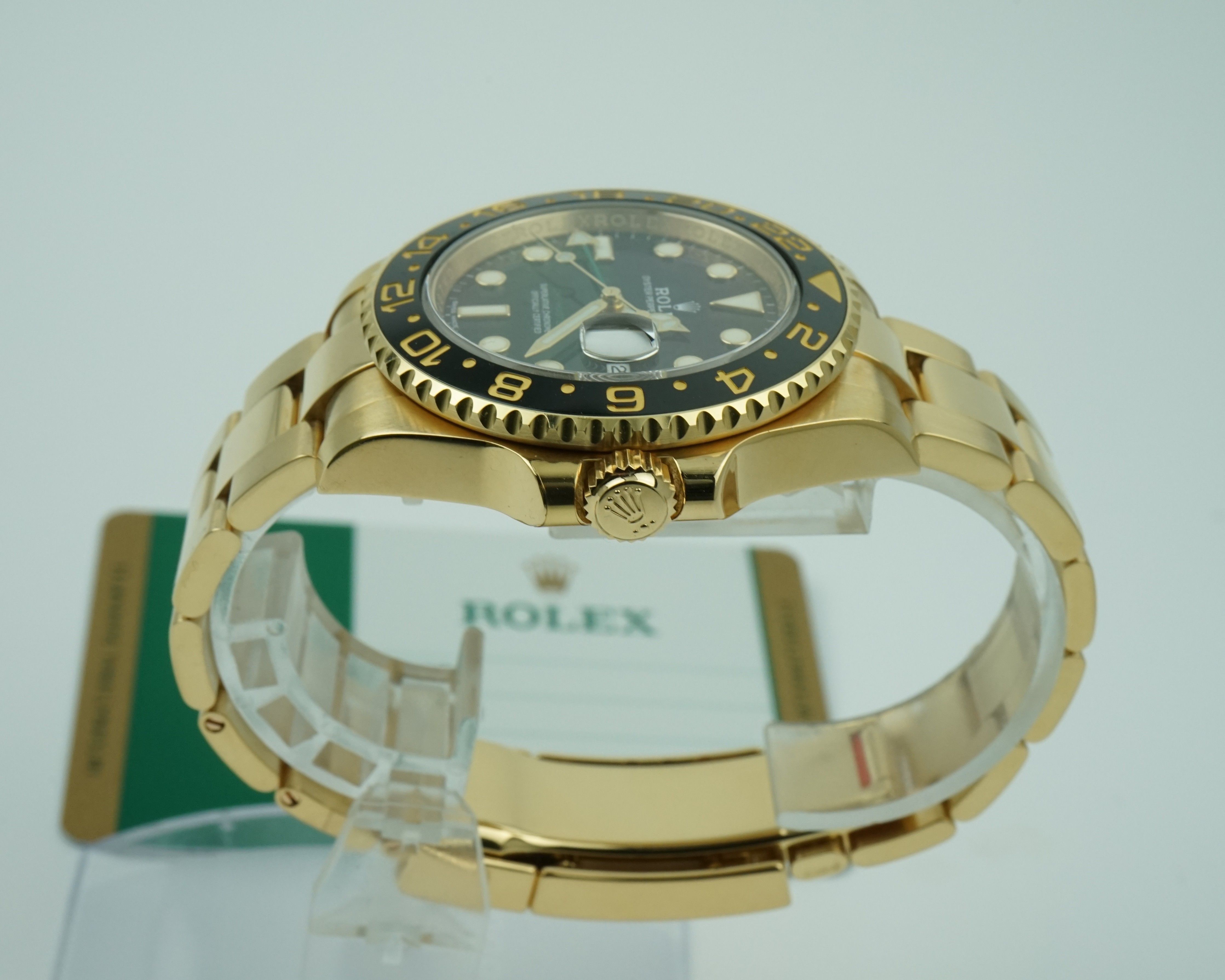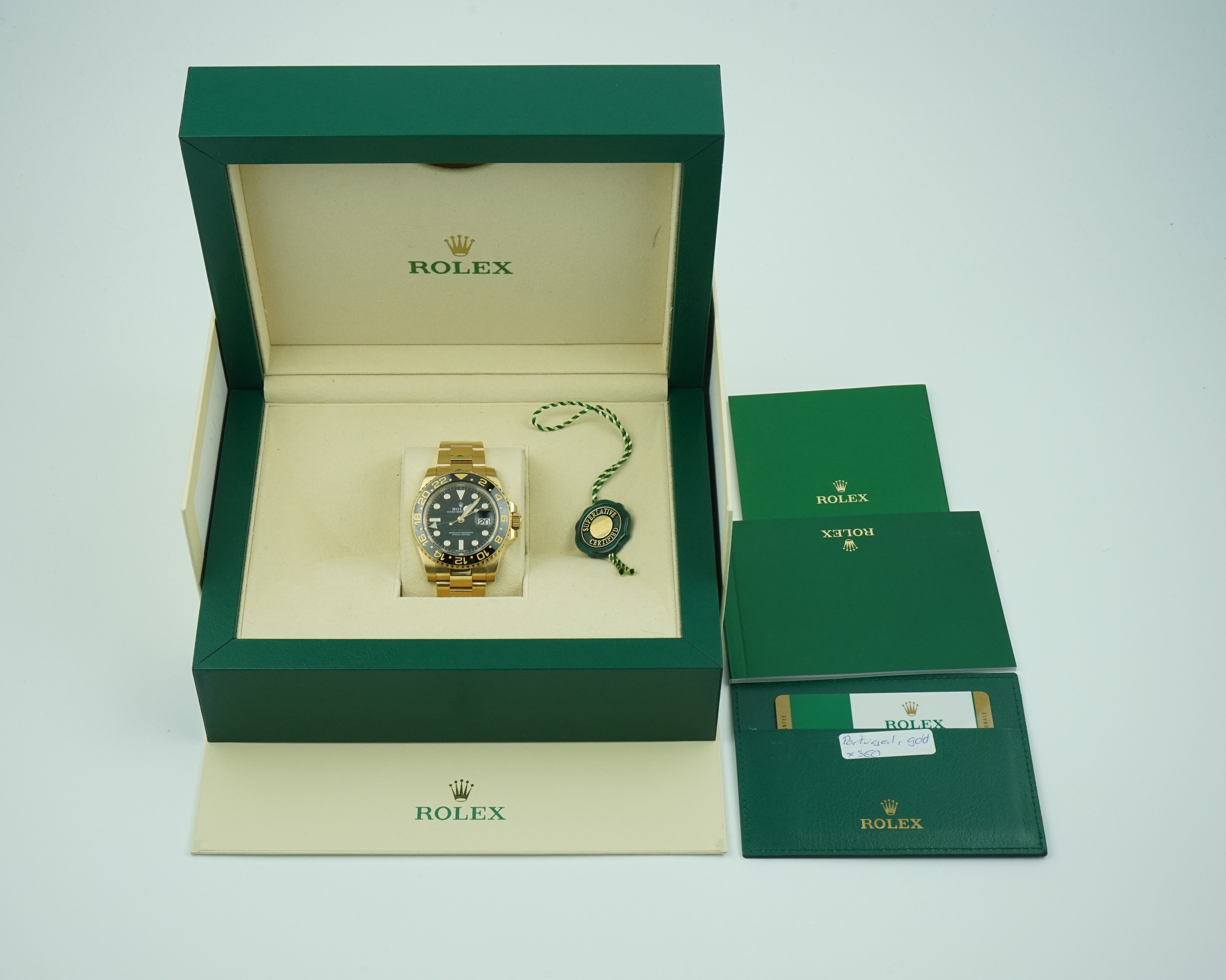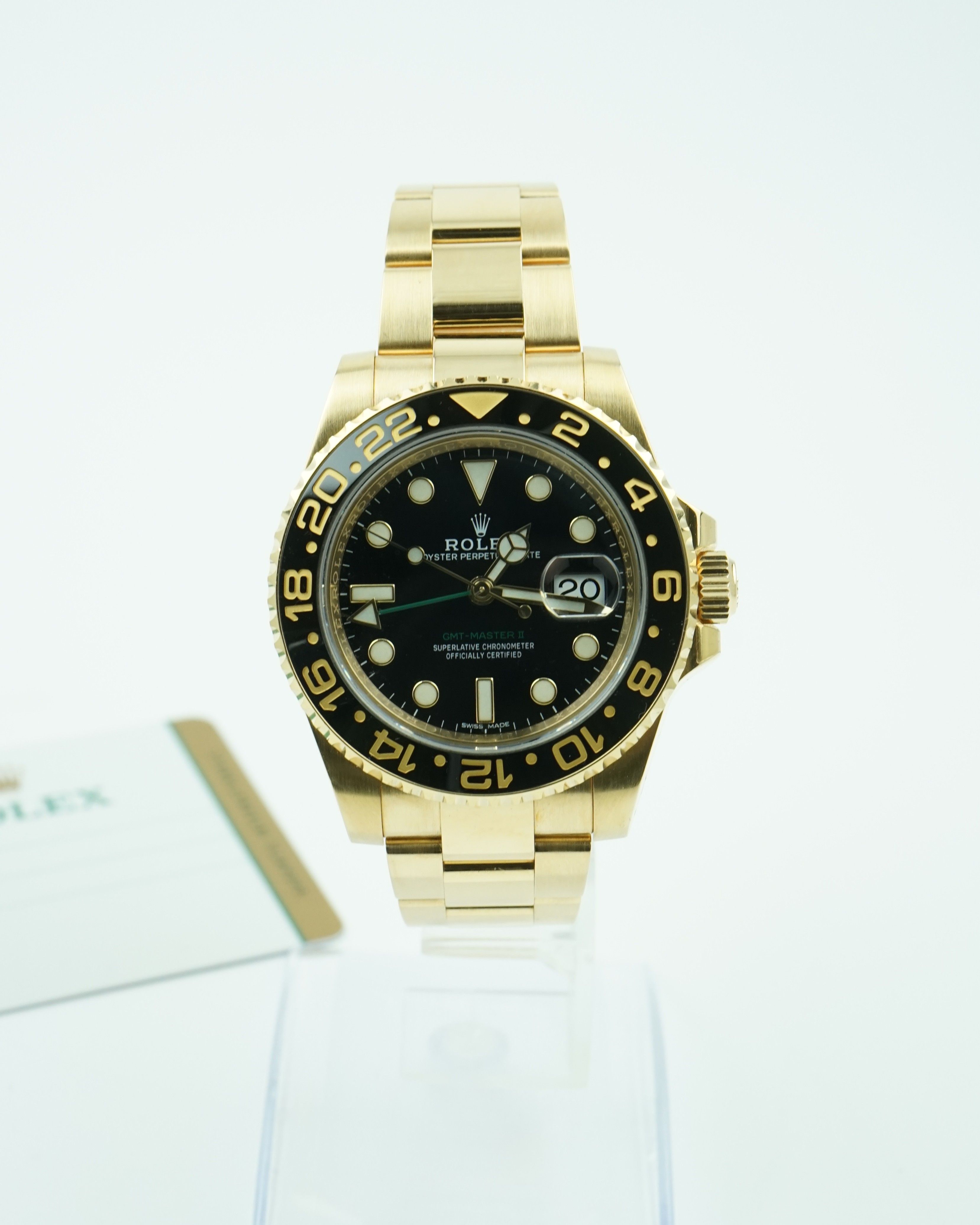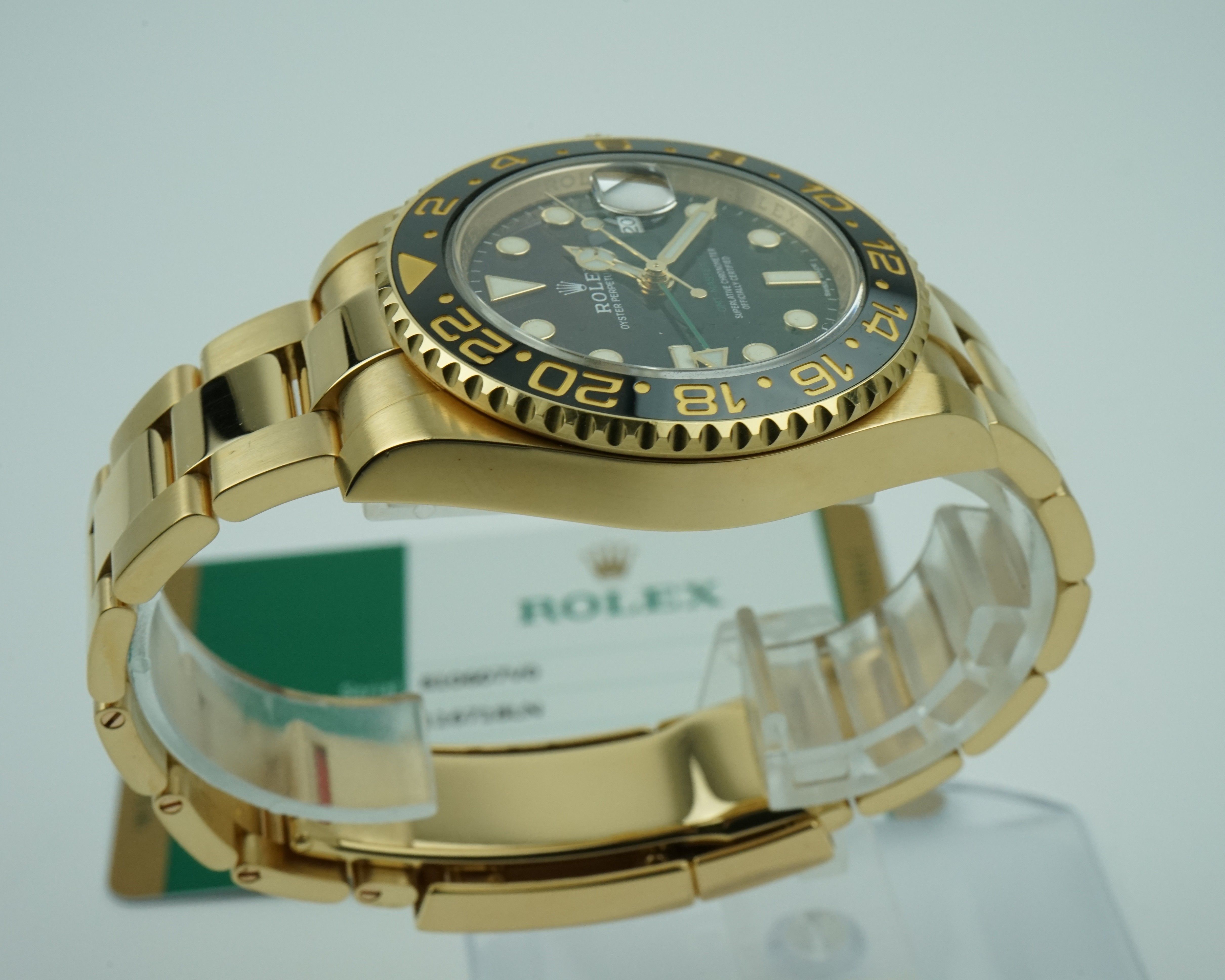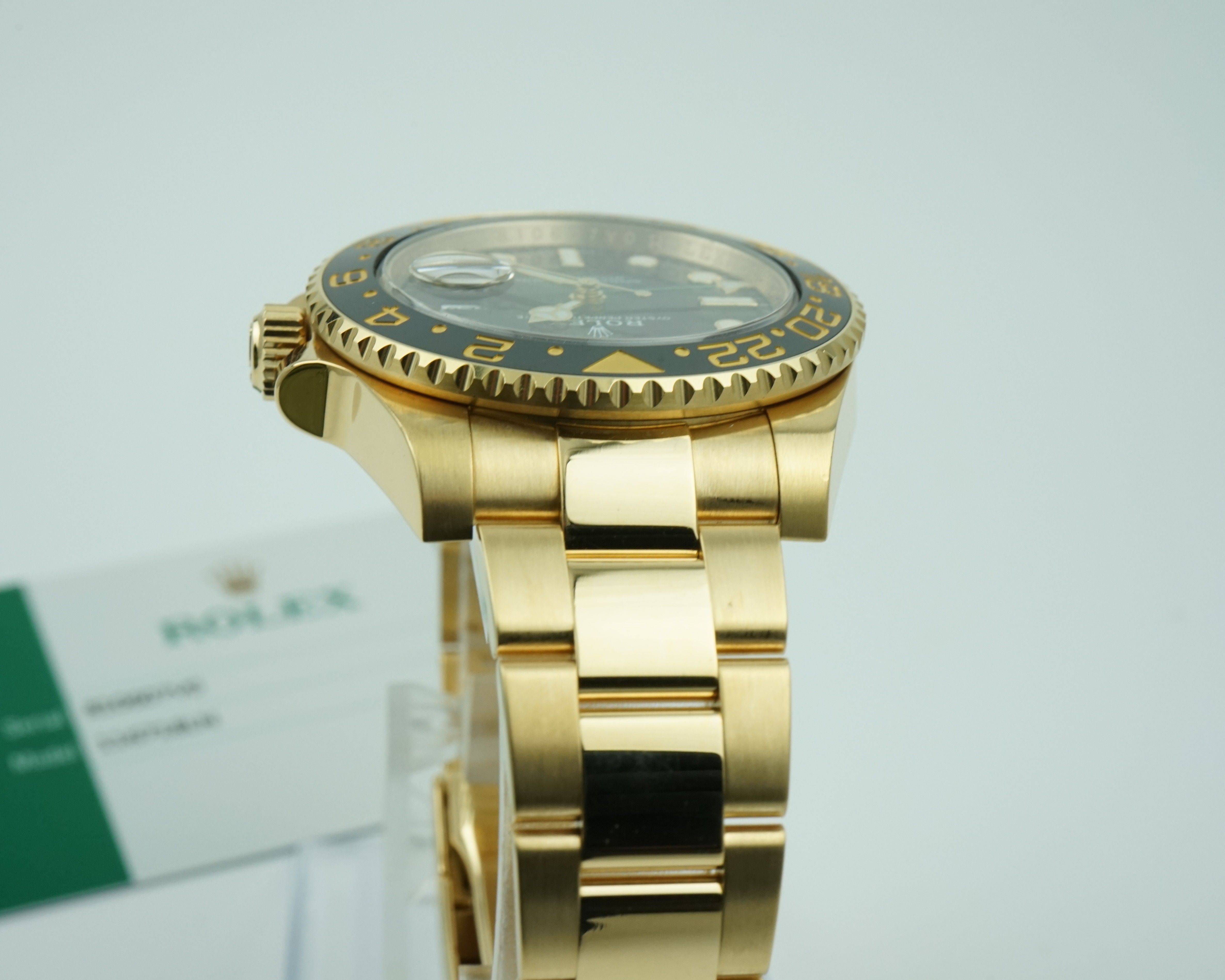 Wir von G-Watches freuen uns, euch eine außergewöhnliche Rolex GMT-Master II 116718LN präsentieren zu dürfen.Dieses ikonische Modell aus 18 Karat Gelbgold überzeugt mit seinem sportlich-luxuriösen Design, der markanten schwarzen Cerachrom-Keramiklünette und dem tiefschwarzen Zifferblatt mit Chromalight-Leuchtindizes, das perfekt mit dem Oyster-Gehäuse harmoniert.