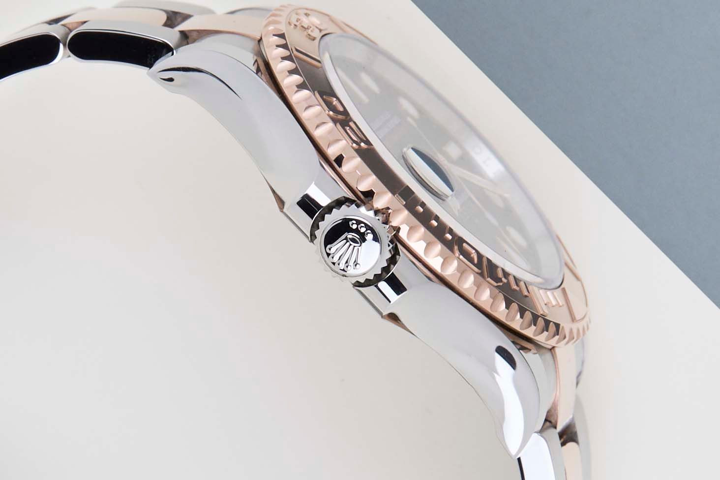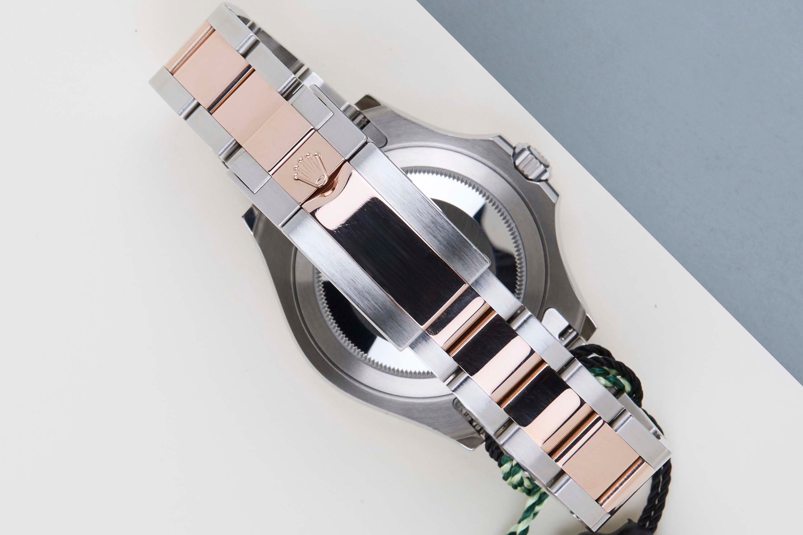 Questo Yacht-Master 40 è realizzato in una combinazione di oro rosa 18k e acciaio inossidabile ed è dotato di un bracciale Oyster, equipaggiato con l'Easylink. Questa estensione consente all'indossatore di allungare o accorciare il bracciale di 5 millimetri, migliorando la vestibilità e l'usabilità dell'orologio.