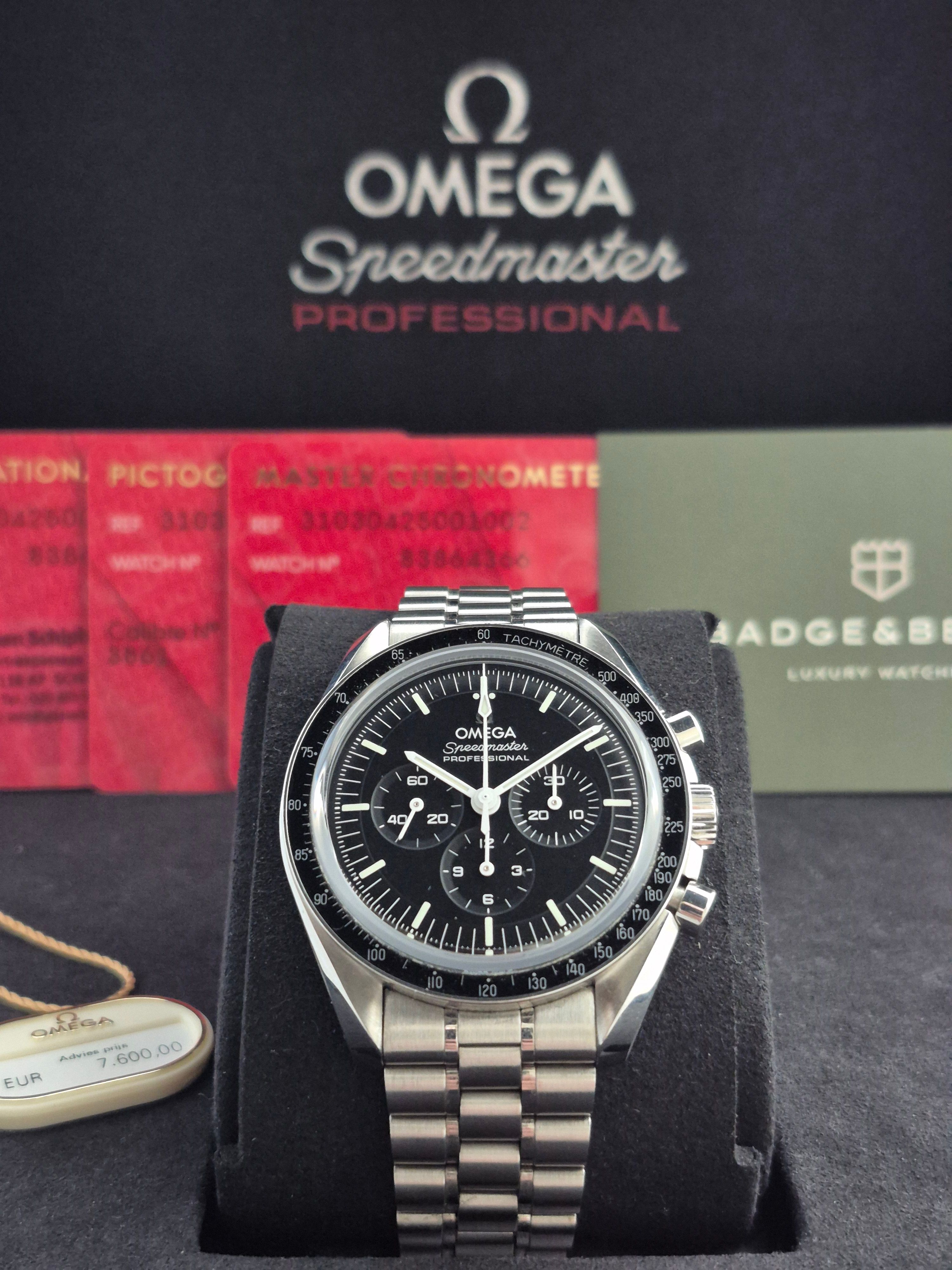 Omega Speedmaster Professional Moonwatch Sapphire (2022)The legendary Moonwatch with a modern touch. This Speedmaster Sapphire features the iconic black dial, sapphire crystal, and exhibition caseback showcasing the calibre 3861.