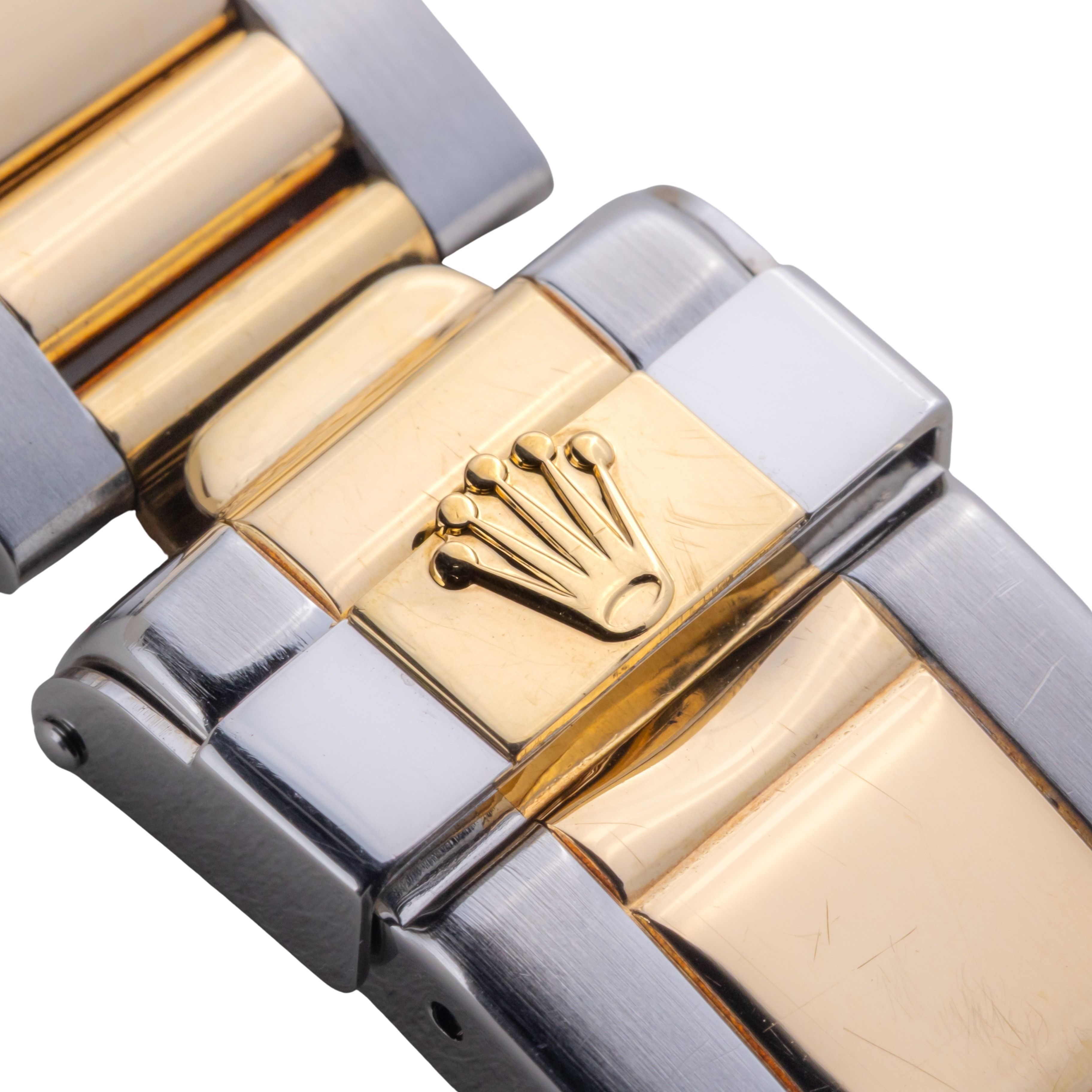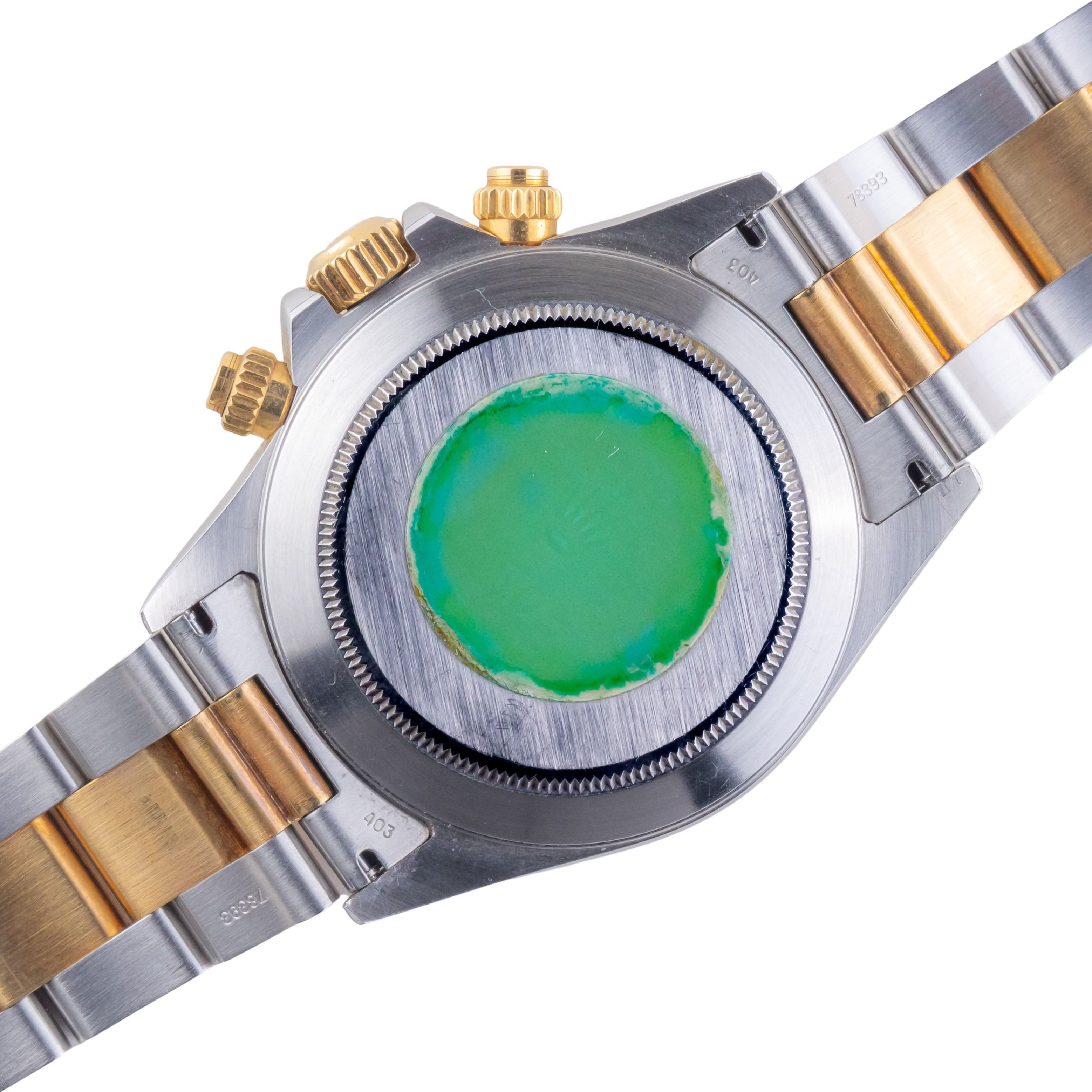 Rolex Daytona 16523 con quadrante nero del 1995. Il Rolex Daytona riferimento 16523 ha una cassa in acciaio inossidabile da 40 mm, un bracciale Oyster in acciaio inossidabile e oro giallo 18k e una lunetta tachimetrica in oro giallo 18k. Il Daytona 16523 è alimentato da un movimento automatico calibro 4030 e presenta un vetro zaffiro antigraffio.