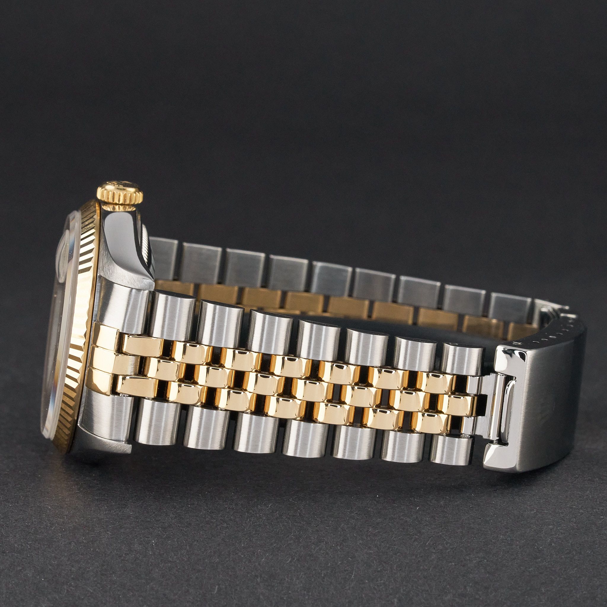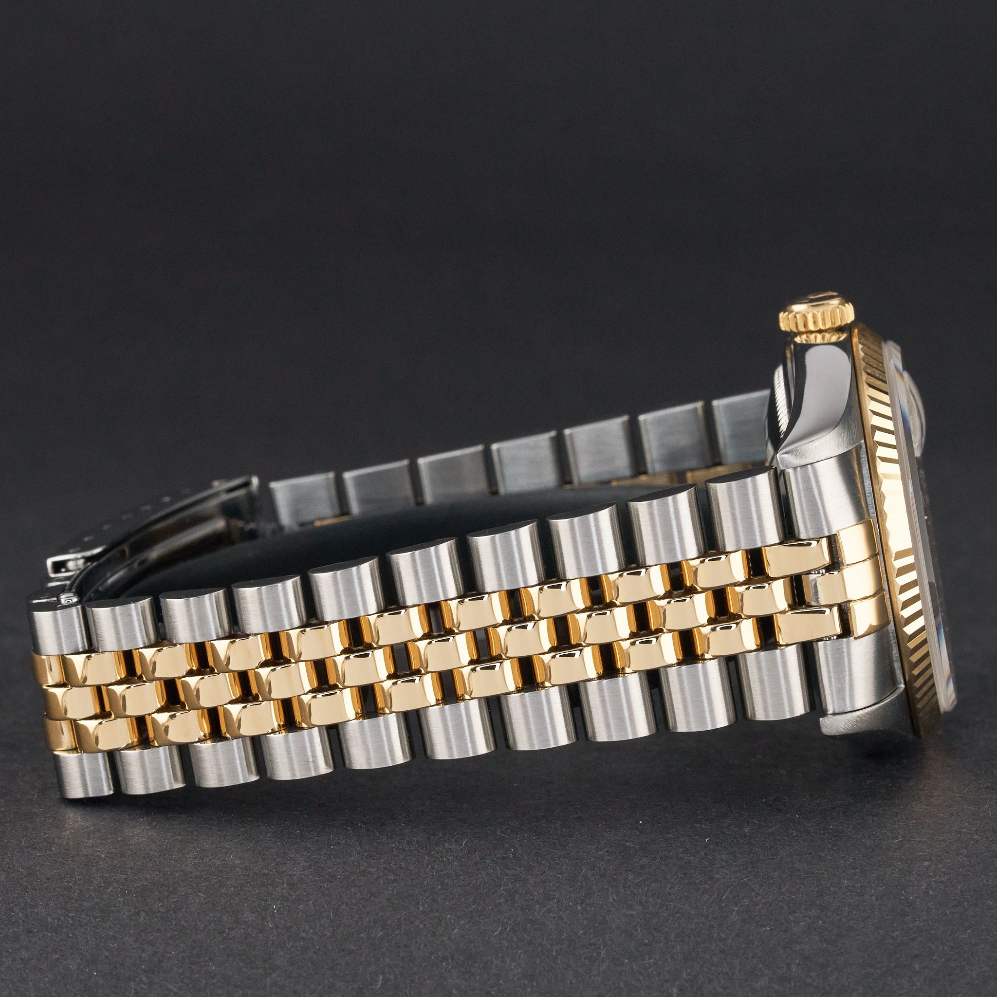Questo Rolex Datejust 16233 presenta un quadrante grande con diamanti in giubileo color champagne ed è realizzato in oro giallo 18K e acciaio inossidabile, con anno di produzione 1995.