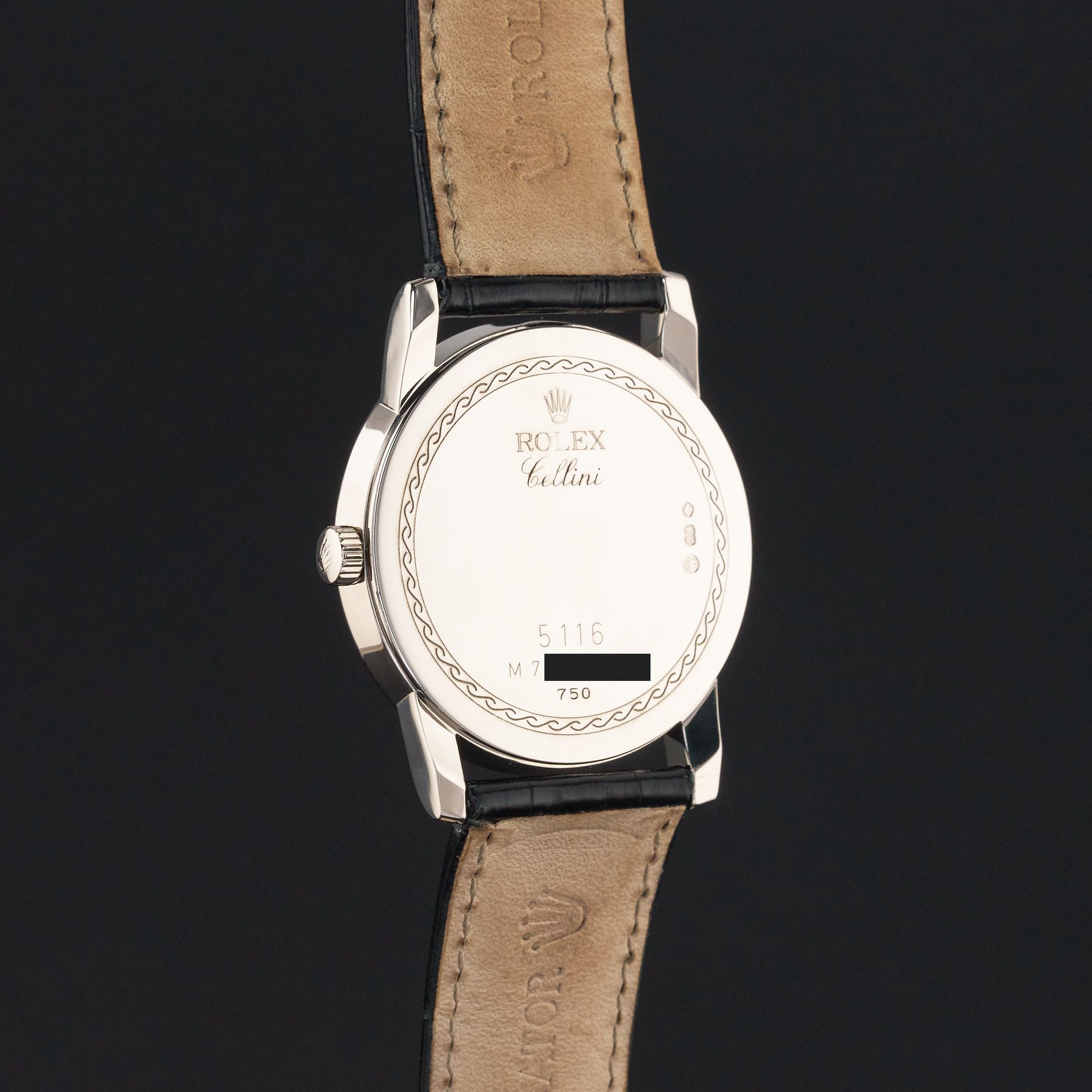 This Rolex Cellini 5116/9 features a Black Roman dial and is crafted from 18K white gold, with a production year of 2008.Case No: M76XXXX