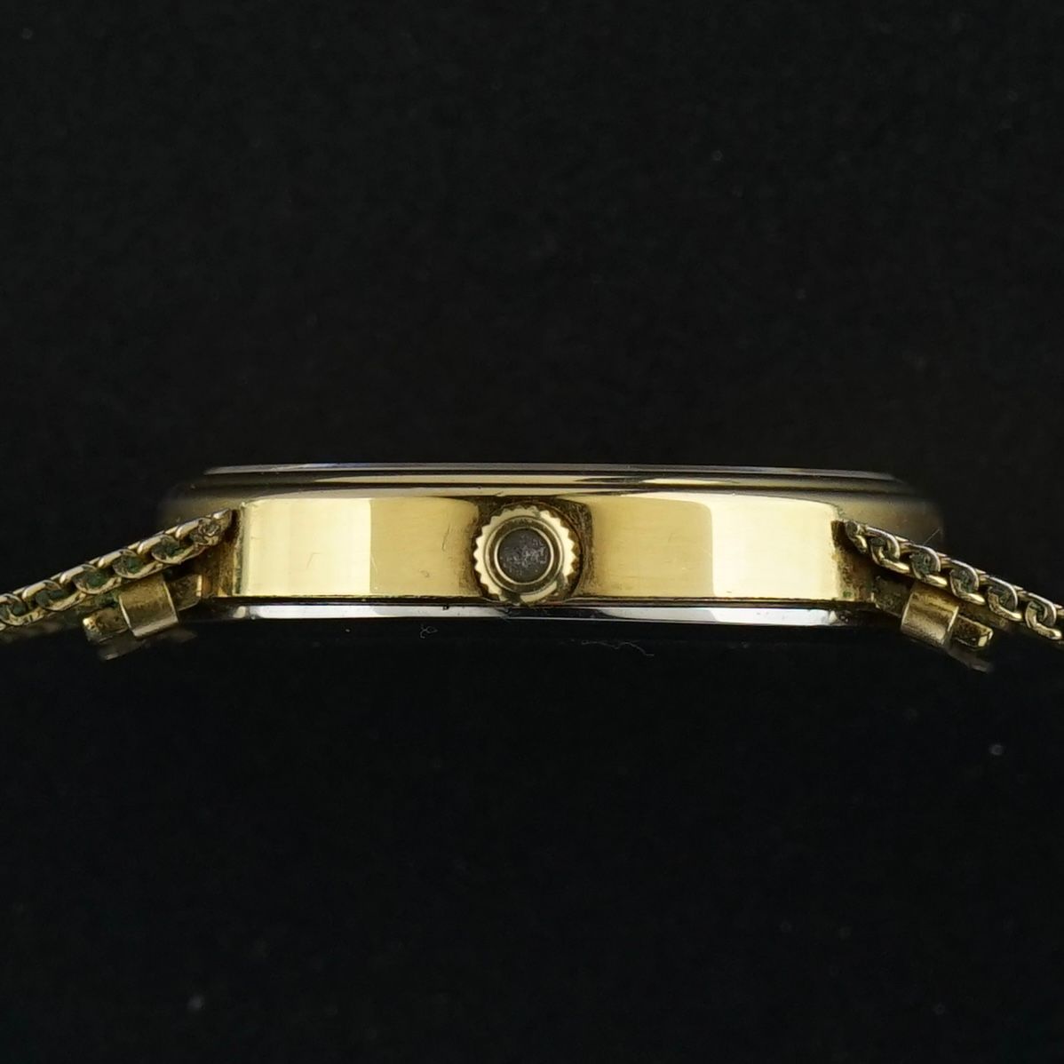 This Vintage Omega De Ville from 1978 features a golden cross-motif linen dial that changes under different light angles, giving it a beautiful effect. The watch is entirely gold-colored, including the dial, case, and original integrated Milanese bracelet, which is in great shape and fully adjustable for very small to very large wrists.Inside is a Caliber 1330 quartz movement, overhauled in December 2025 and currently running and functioning excellently. The crown features a push function: pressing the center of the crown with a tool (a toothpick works well) advances the minute hand, which stops and resumes normal operation when released. Pulling the crown out one position allows adjustment of the hour hand.