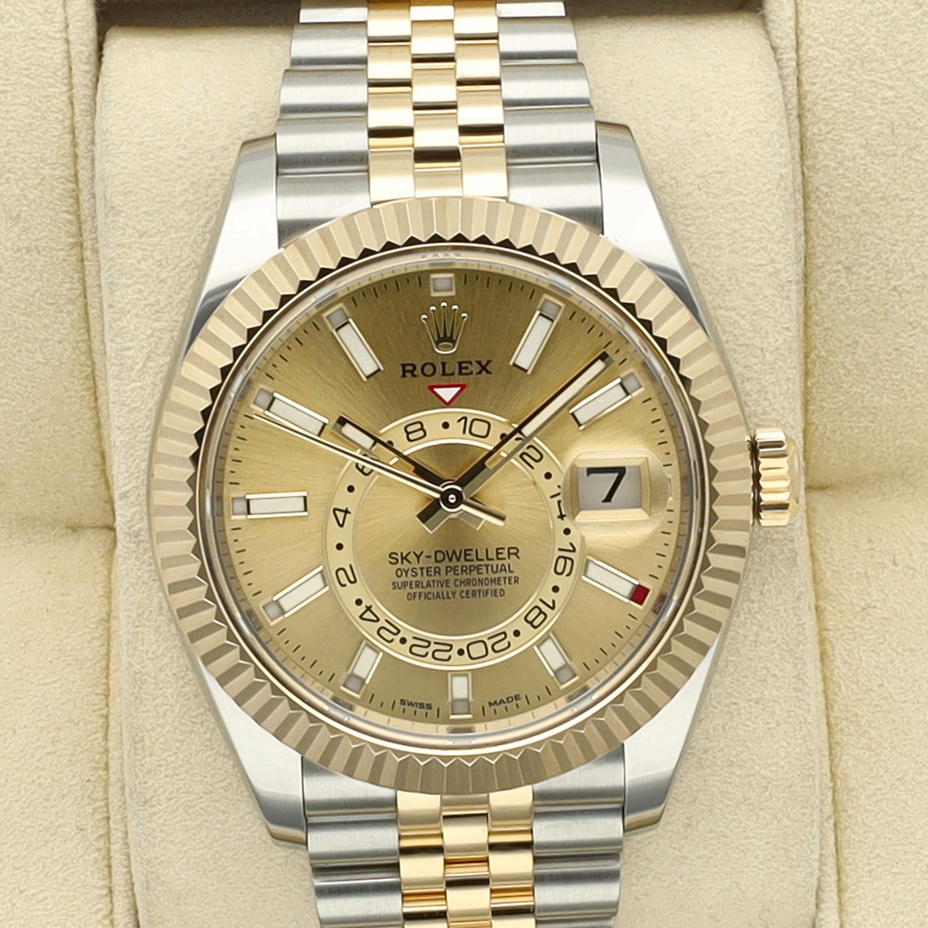 The Rolex Sky-Dweller, reference 326933, from 2023 is in like new condition and offered as a Full Set, including the original box, papers, and accessories. As one of Rolex’s most sophisticated models, the Sky-Dweller seamlessly combines technical innovation with unmistakable elegance. The 42 mm case is crafted from Oystersteel and 18-carat yellow gold, finished with a striking yellow gold fluted bezel. Beyond its aesthetic appeal, the bezel is part of Rolex’s patented Ring Command system, enabling intuitive adjustment of the annual calendar and dual-time functions directly via the crown.Inside beats the advanced automatic Caliber 9001, one of Rolex’s most complex in-house movements. It offers exceptional precision, a 72-hour power reserve, and the ingenious annual calendar, which automatically differentiates between 30- and 31-day months, requiring correction only once per year.