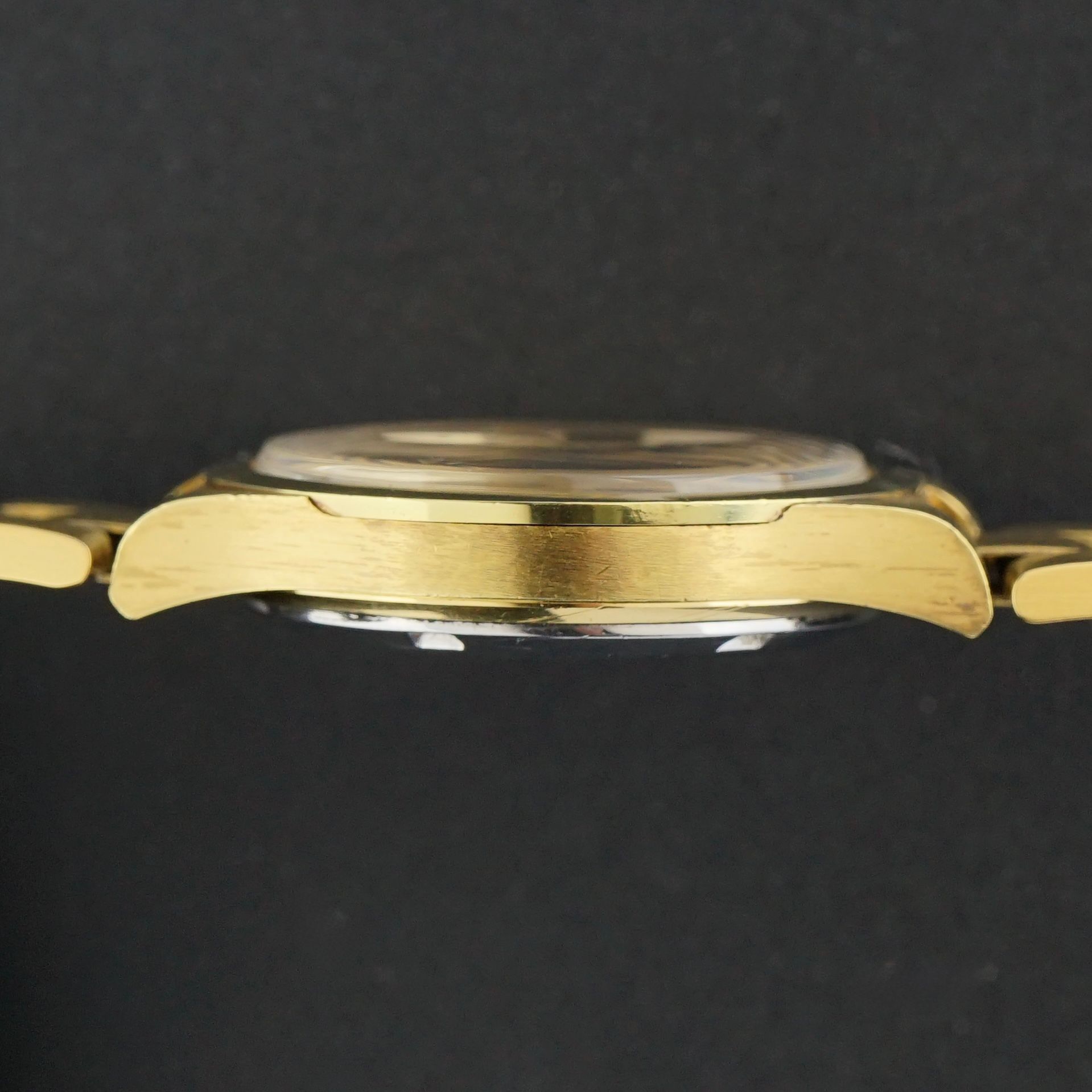 Omega Genève Automatic vintage del 1973. Presenta un quadrante color oro con una finitura spazzolata verticale, abbinato a una cassa in tono oro che mantiene la sua lucidatura originale. Anche il bracciale placcato oro conserva la lucidatura originale, anche se su alcuni bordi dei link si nota una leggera usura dell'acciaio, difficile da percepire con un uso normale.