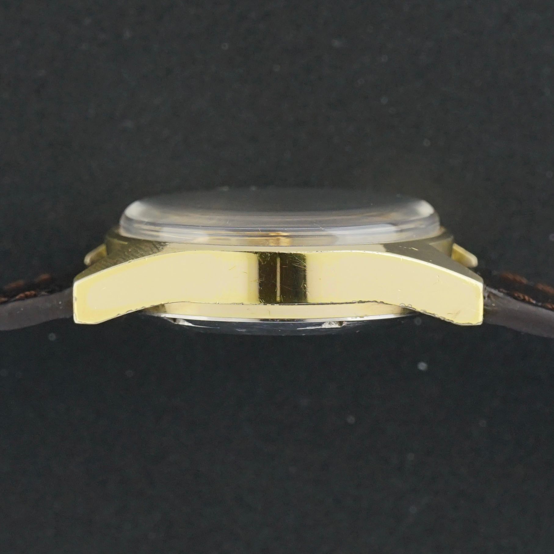 Il caso misura 35mm (escludendo la corona). Sebbene il caso sia in buone condizioni, mostra segni di usura sulla parte inferiore.
