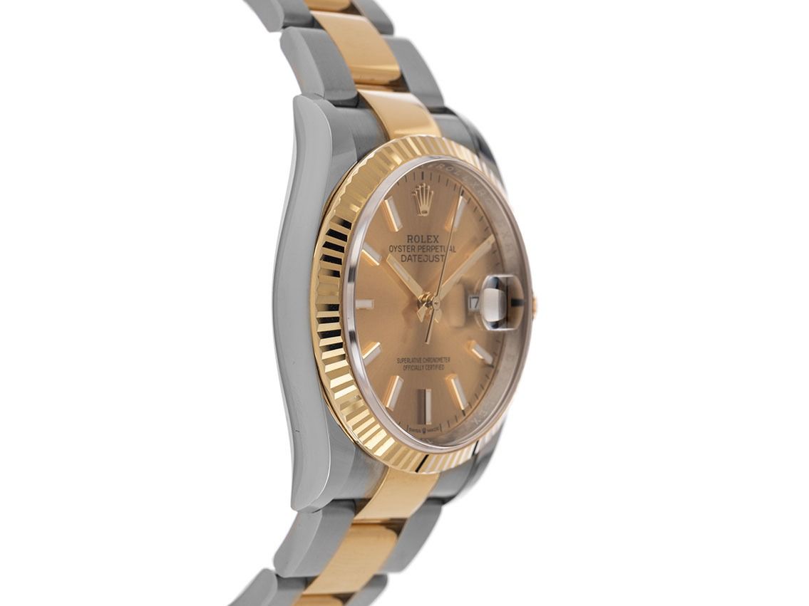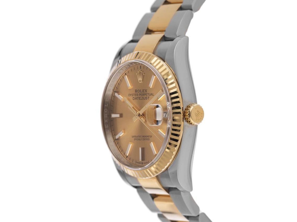 Rolex Datejust Stahl 18kt Gelbgold Automatik Armband OysterGehäuse Edelstahl poliert und satiniert, Gehäusedurchmesser ohne Krone 36mm, Gehäusehöhe 11,6mm. Lünette 18kt Gelbgold poliert und geriffelt. Armband Oyster Edelstahl / 18kt Gelbgold poliert und satiniert, Faltschließe Edelstahl / 18kt Gelbgold mit Hersteller-Logo. Zifferblatt champagnerfarben mit aufgesetzten gelbgoldenen Indexen und gelbgoldenen Zeigern. Uhrwerk Automatik, Chronometer mit Zeugnis, Rolex Manufakturkaliber 3235 mit 31 Edelsteinen. Anzeige von Stunde, Minute und Sekunde über Zeiger aus der Mitte mit Sekundenstopp zur sekundengenauen Einstellung der Uhrzeit, Datumsanzeige mit Schnellverstellung unter Glaslupe bei 3 Uhr. Saphirglas kratzfest. Krone verschraubbar mit Hersteller-Logo. Boden Edelstahl verschraubt. Gewicht der Uhr inklusive Armband 132g, Länge des Armbandes inklusive Gehäuse 175mm. Referenznummer: 126233, Gehäusenummer: 4V603XXX, ID: P2082219801225H-14500/13550, Artikelnummer: 10000083741. Mit Gangkontrolle und kompletter äußerlicher Aufarbeitung von Dezember 2025. Original Rolex Box mit Umkarton und Garantie Papiere von Oktober 2019, LC 386 / Türkei sowie Beschreibung, Ledermäppchen und Rolex Chronometer-Siegel sowie Watchregister Auszug von Dezember 2025, The Watch Register Zertifikat / ohne Eintrag (Internationale Datenbank für verlorene oder gestohlene Uhren), Full Set. Superschnäppchen, Kapitalanlage mit Wertsteigerungspotential, sehr seltenes Sammlerstück, fast nicht getragen. Wie Neu. Lieferzeit sofort.