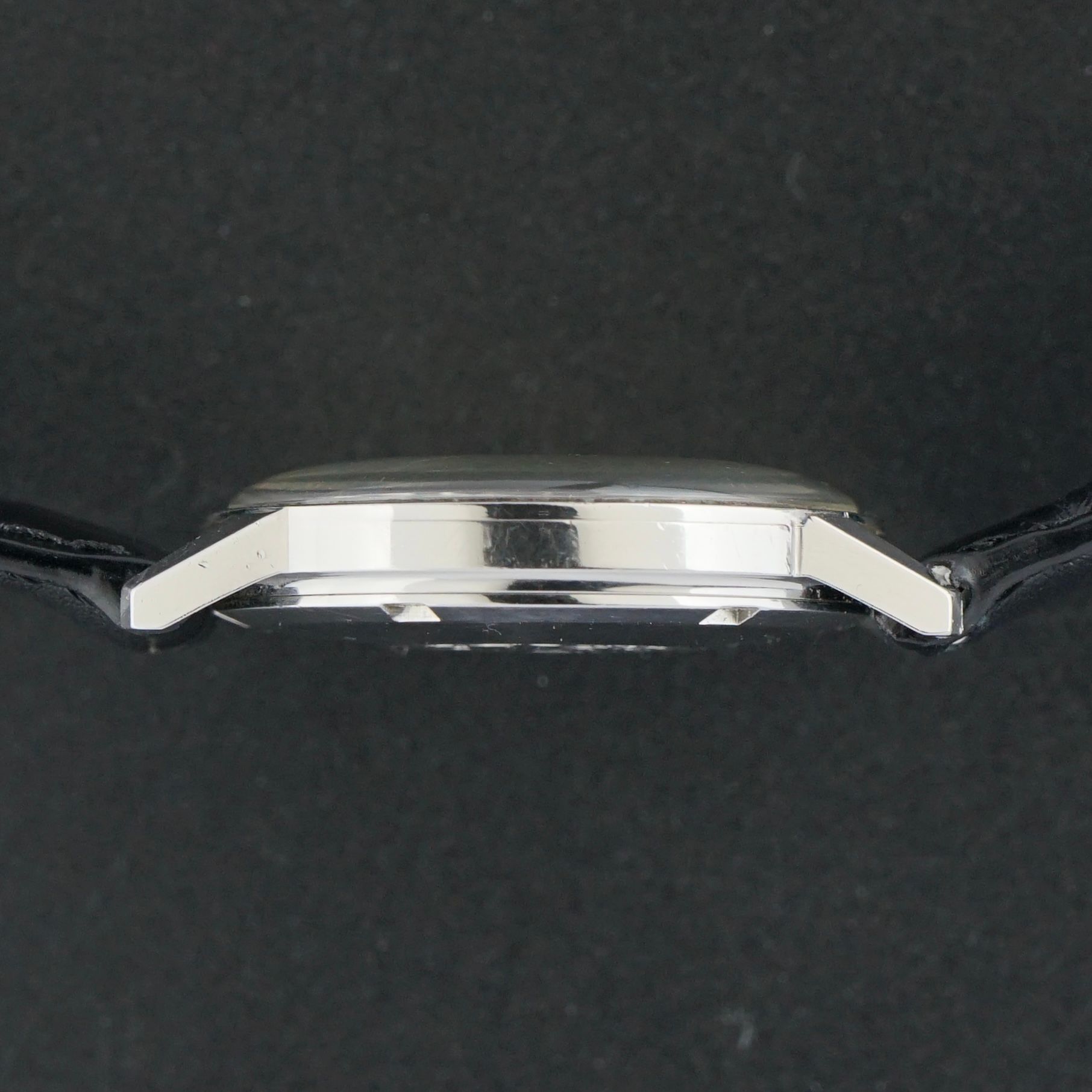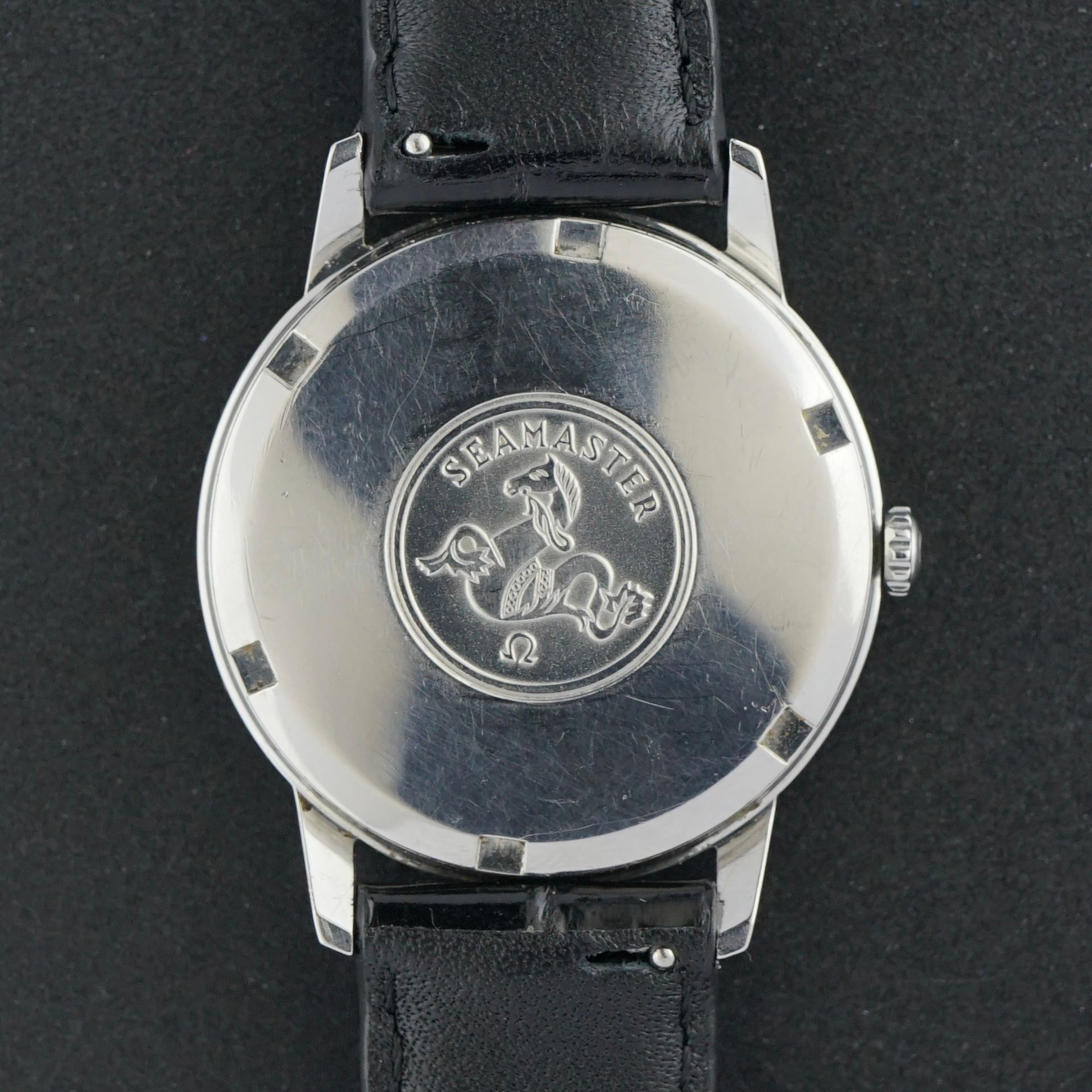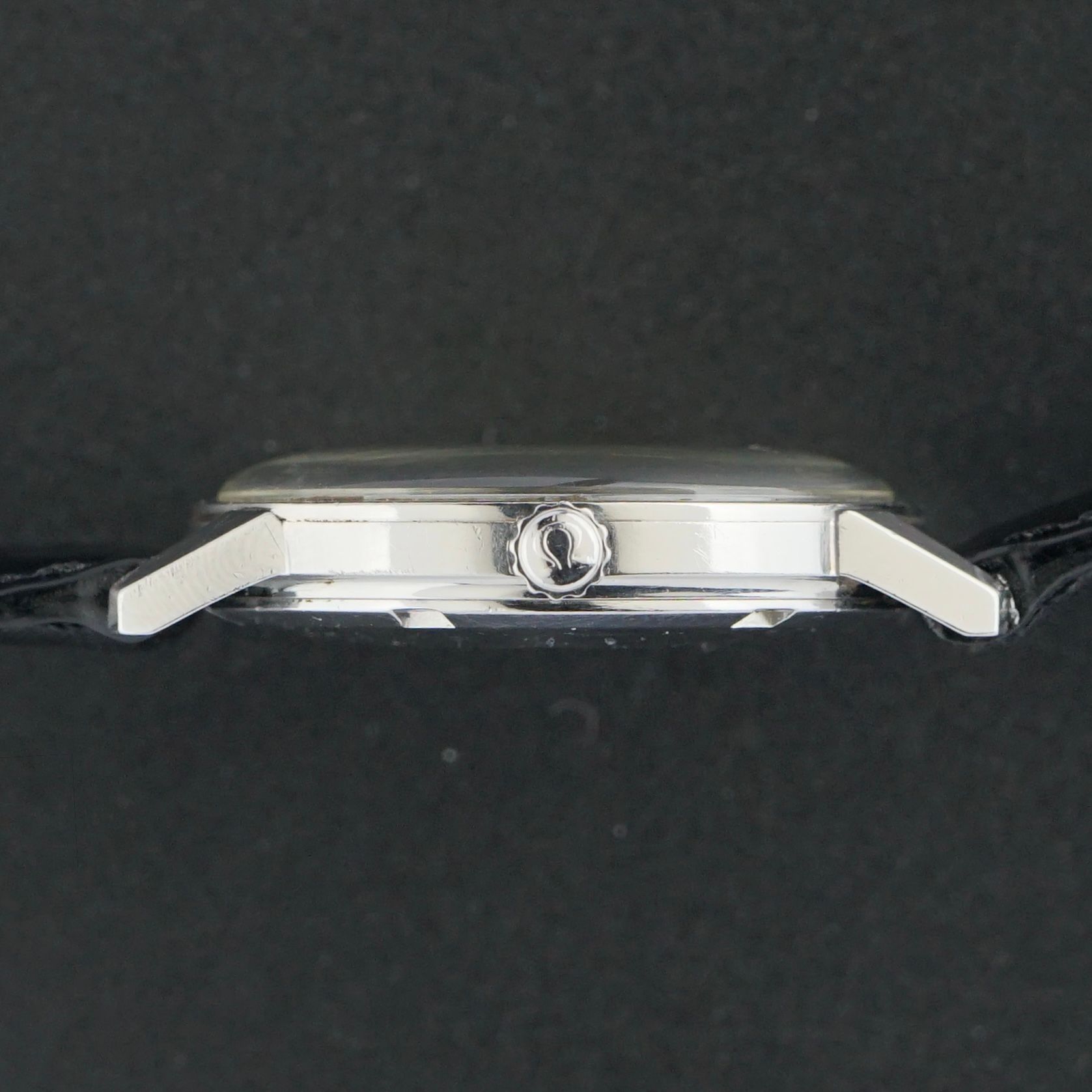 Vintage Omega Genève from 1968, correctly produced as a Genève Seamaster. This reference features “Genève” on the dial and a Seamaster caseback, which is original and correct. The dial has a vertically brushed finish with light patina specks and remains in very good overall condition. The stainless steel case houses the automatic caliber 552 movement, serviced in January 2025 and currently running and functioning excellently. The watch is paired with a new top-grain black leather strap with a crocodile-grain pattern and light gloss. Overall condition is excellent; aside from the new strap, the watch is entirely original.Year of production: 1968