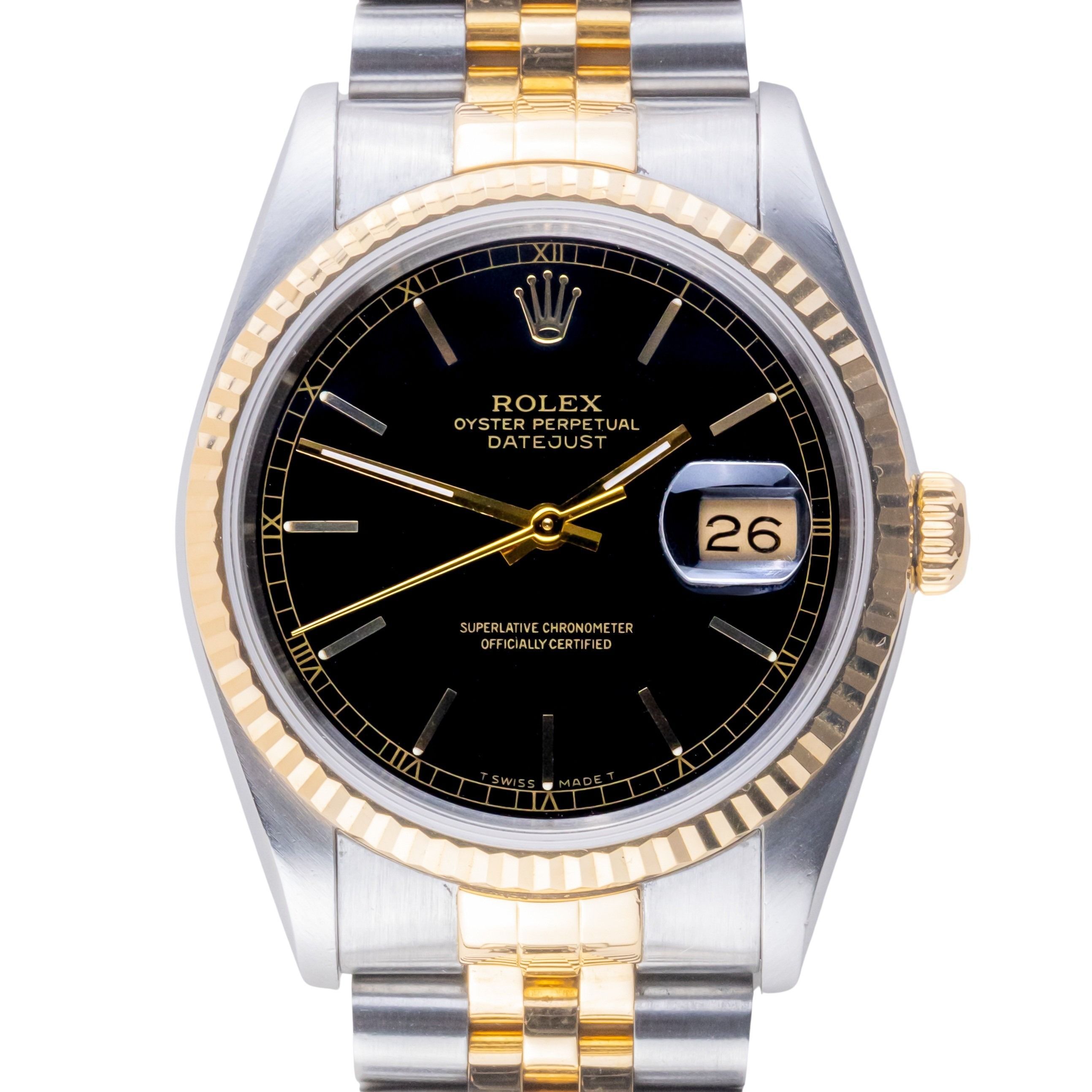 Rolex Oyster Perpetual Datejust reference 16233 from 1991 including full set. The Datejust 16233 measures a 36mm gold and stainless steel case, two-tone Jubilee bracelet and fluted 18k gold bezel. This Datejust 16233 features an automatic movement caliber 3135 with a quickset date function, a scratch resistance sapphire crystal and a black dial with tritium hands.Every watch sold by Langedyk Vintage Watches is included with a LVW watch box, Authenticity report and free worldwide (insured) shipment. In addition, every pre-owned watch is offered with our 12-month warranty from the date of purchase.