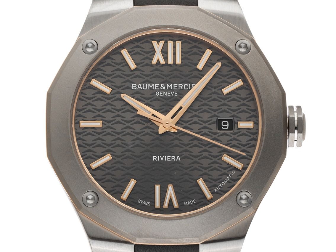 Baume & Mercier Riviera Date Stahl Titan Automatik Armband Kautschuk FaltschließeGehäuse Edelstahl satiniert, Gehäusedurchmesser ohne Krone 42mm, Gehäusehöhe 10,6mm. Lünette Titan satiniert und 4-fach verschraubt. Armband Kautschuk schwarz, Doppelsicherheitsfaltschließe Edelstahl mit Hersteller-Logo. Zifferblatt grau mit aufgesetzten roségoldenen Leuchtindexen, römischen Ziffern und roségoldenen Leuchtzeigern. Uhrwerk Automatik, Kaliber Sellita SW200 mit 26 Edelsteinen, Gangreserve ca. 38 Stunden. Anzeige von Stunde, Minute und Sekunde über Zeiger aus der Mitte mit Sekundenstopp zur sekundengenauen Einstellung der Uhrzeit, Datumsanzeige mit Schnellverstellung bei 3 Uhr. Saphirglas kratzfest. Krone mit Hersteller-Logo. Boden Edelstahl 4-fach verschraubt und graviert mit Saphirglas Sichtfenster. Gewicht der Uhr inklusive Armband 110g. Wasserdicht bis 10 ATM. Referenznummer: M0A10660, ID: P217626000126H-3300, Artikelnummer: 10000084136. Original Baume & Mercier Box mit Umkarton und Garantie Papiere von September 2025 sowie Beschreibung und Watchregister Auszug von Januar 2026, The Watch Register Zertifikat / ohne Eintrag (Internationale Datenbank für verlorene oder gestohlene Uhren), inkl. Erstkaufrechnung, Full Set. Ungetragen. Lieferzeit sofort.