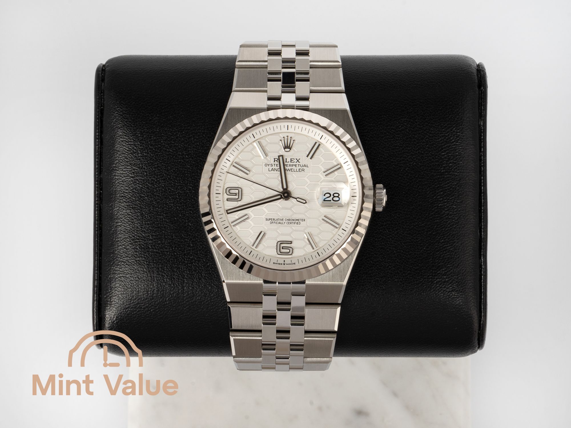 Realizzato in Oystersteel con una lunetta scanalata in oro bianco, l'orologio presenta un distintivo quadrante bianco a nido d'api, che aggiunge profondità, texture e un tocco contemporaneo. Il Land-Dweller non è una reinterpretazione del passato — è Rolex che guarda decisamente al futuro.