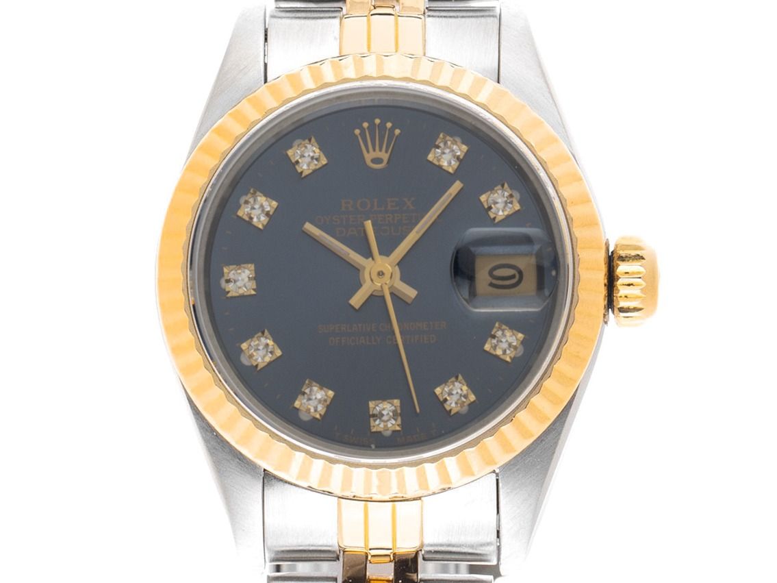Cassa in acciaio lucido e satinato, diametro cassa senza corona 26mm, altezza cassa 10,5mm. Lunetta in oro giallo 18kt lucido. Bracciale Jubilé in acciaio / oro giallo 18kt lucido e satinato, chiusura pieghevole in acciaio con logo del produttore. Quadrante blu con 10 indici in diamante applicati e lancette in oro giallo. Movimento automatico, cronometro con certificato, calibro Rolex Manifattura 2135 con 29 rubini. Indicazione di ore, minuti e secondi tramite lancette centrali con fermo secondi per la regolazione precisa dell'ora, indicazione della data con regolazione rapida sotto lente di ingrandimento alle 3, open 6/9 (sei e nove aperti nell'indicazione della data). Vetro zaffiro antigraffio. Corona a vite con logo del produttore. Fondello in acciaio avvitato. Peso dell'orologio incluso il bracciale 53g, lunghezza del bracciale incluso la cassa 150mm. Numero di riferimento: 69173, numero di cassa: S203XXX, anno di produzione: 1993, ID: P204998001225H-8900, numero articolo: 10000083616. Con controllo del movimento e completa rifinitura esterna di dicembre 2025. Scatola originale Rolex con imballaggio e documenti di garanzia di febbraio 1994, LC 400 / Hong Kong, oltre a descrizione, libretto di traduzione, astuccio in pelle, sigillo cronometro Rolex e estratto dal Watch Register di dicembre 2025, certificato The Watch Register / senza registrazione (database internazionale per orologi smarriti o rubati), Full Set. Pezzo da collezione molto raro, di prima mano. Ottime condizioni. Tempi di consegna immediati.