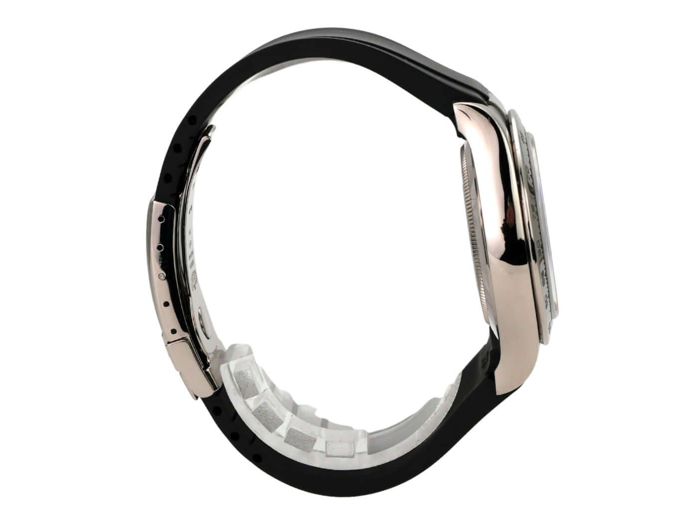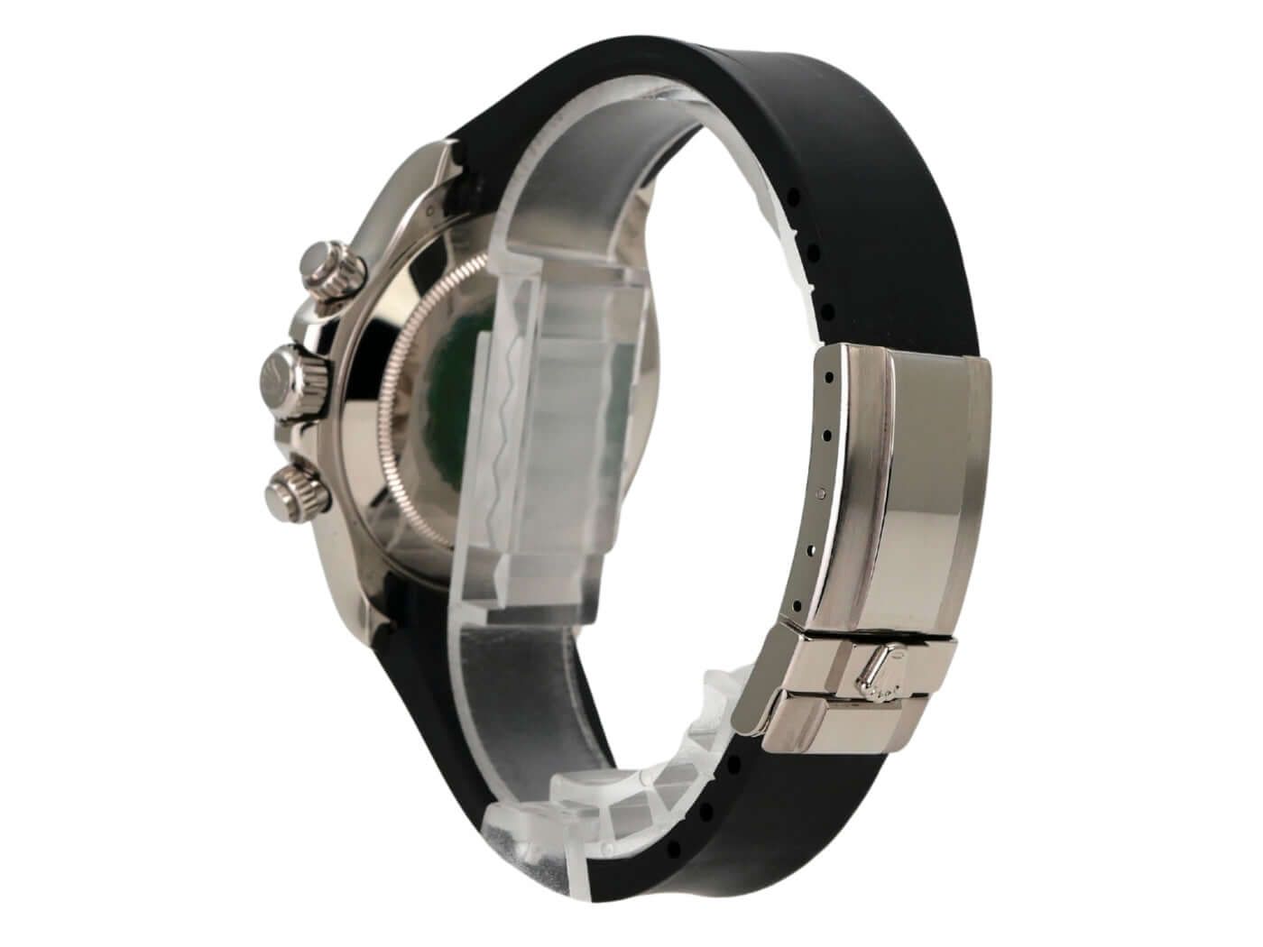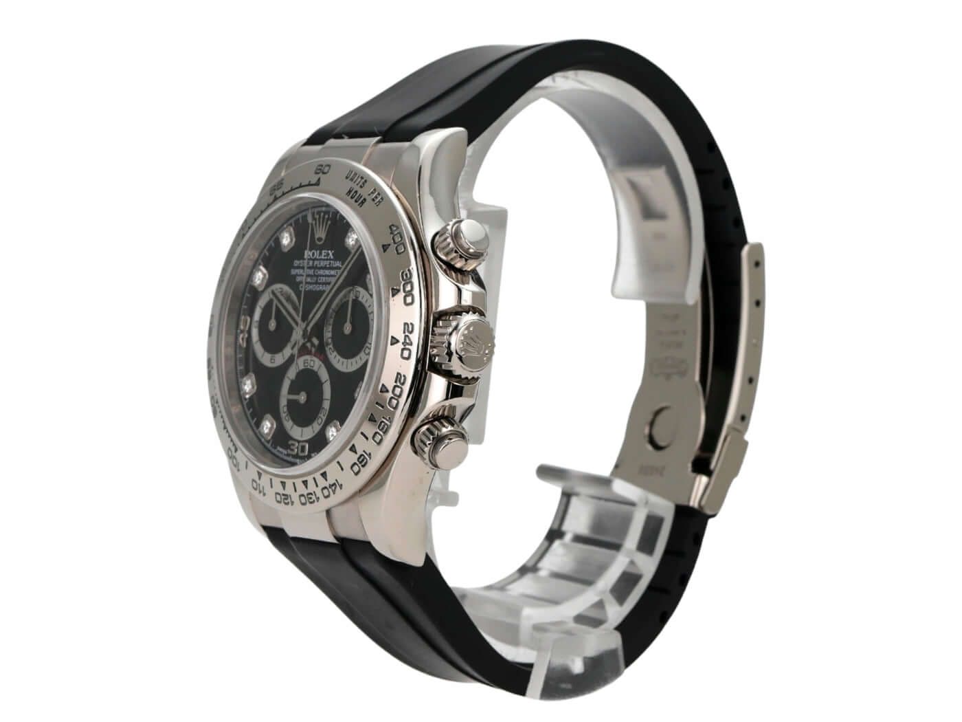 Rolex Cosmograph Daytona White Gold Ref. 116519 Black DiamondCase made of 18 kt white gold, polished and satin-finished, case diameter 40mm, bezel made of 18 kt white gold polished with engraved tachymeter scale, black rubber strap with 18 kt white gold folding clasp, black dial with diamonds, automatic movement, Rolex manufacture caliber 4130 with 44 jewels, frequency 28,800 A/h, power reserve of approx. 72 hours, chronometer, scratch-resistant sapphire crystal, screwed 18 kt white gold case back, water-resistant up to 10 bar.