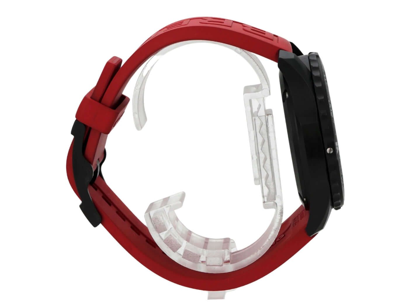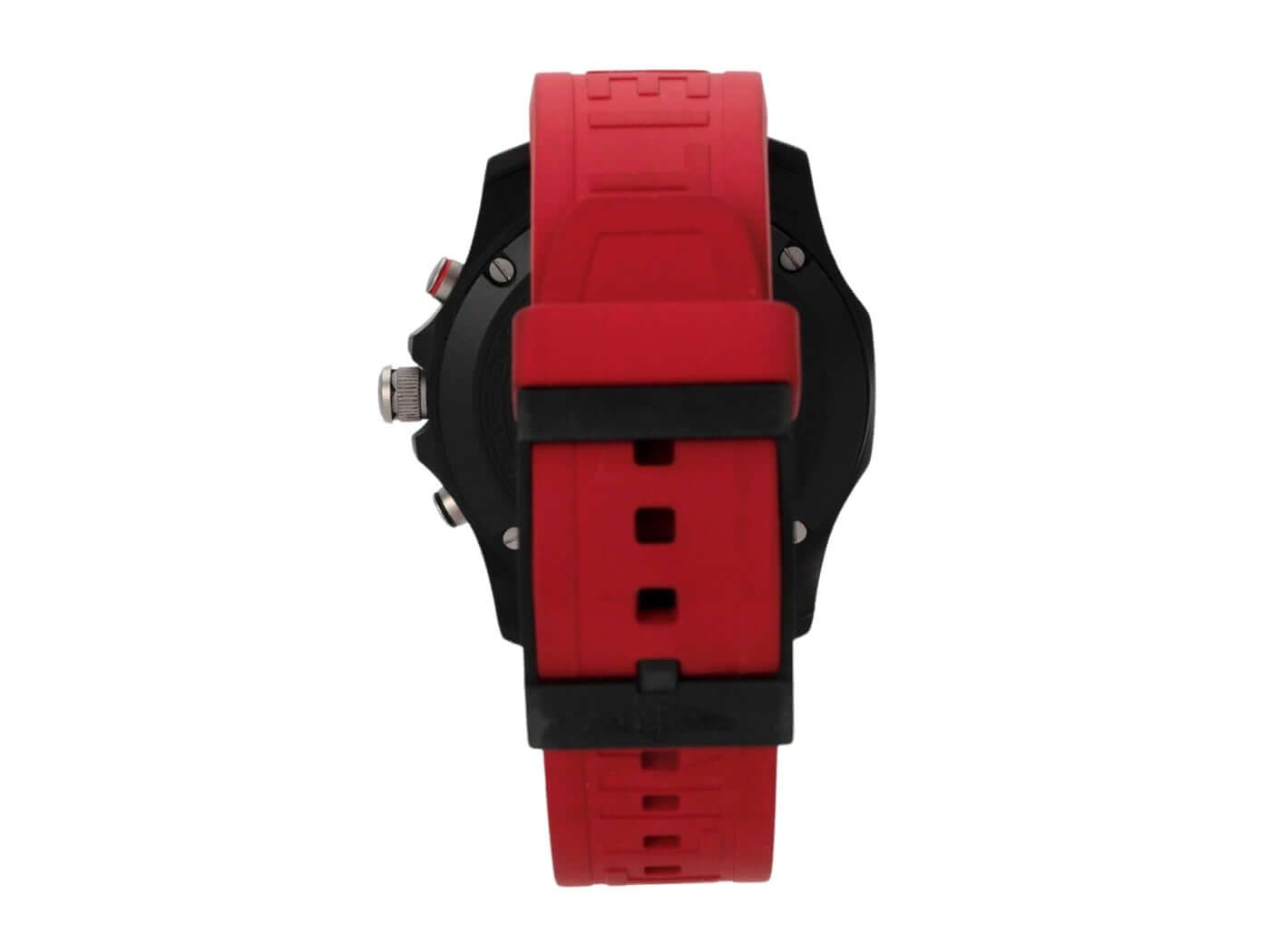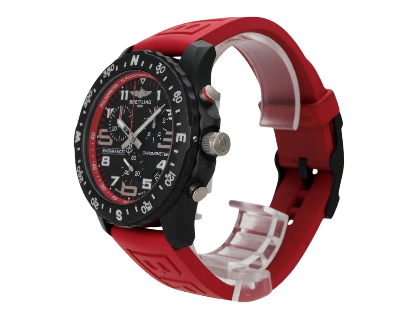 Breitling Endurance Pro X82310D91B1S1Case made of Breitlight, case diameter 44 mm, case height 12.5 mm, Breitlight bezel bi-directional rotating, red rubber strap with pin buckle, black dial with applied luminous numerals and luminous hands, quartz movement, Breitling 82, date display, chronograph, chronometer, sapphire crystal double anti-reflective coating, Breitlight case back, water-resistant up to 10 bar.