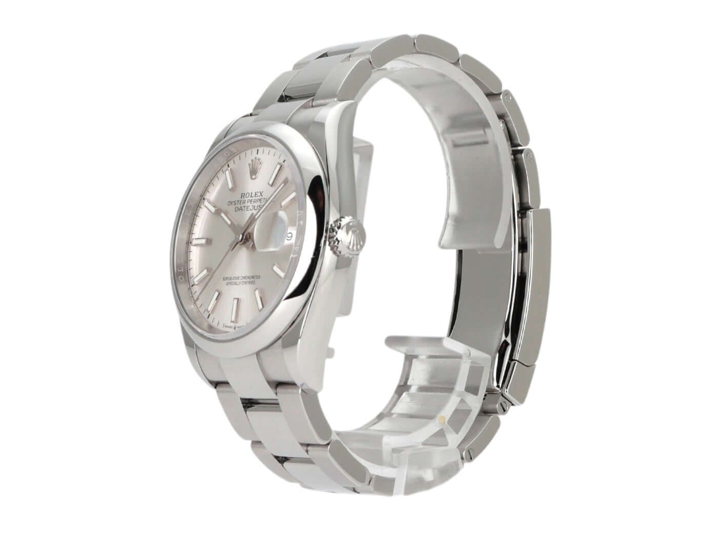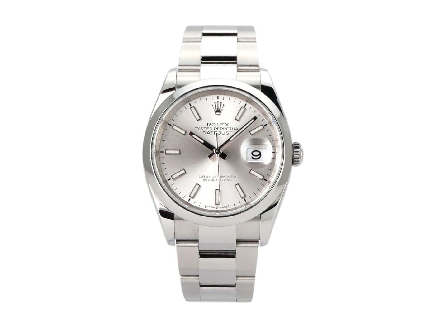 Rolex Datejust 36 Oystersteel Ref. 126200 Silver Case made of polished and satin-finished Oystersteel stainless steel, case diameter 36 mm, silver-colored dial with applied luminous indices, luminous hands, Oyster stainless steel bracelet with folding clasp, automatic, Rolex manufacture caliber 3235, 70-hour power reserve, date display, chronometer, sapphire crystal, screw-down crown, screwed stainless steel back, water-resistant up to 10 bar.
