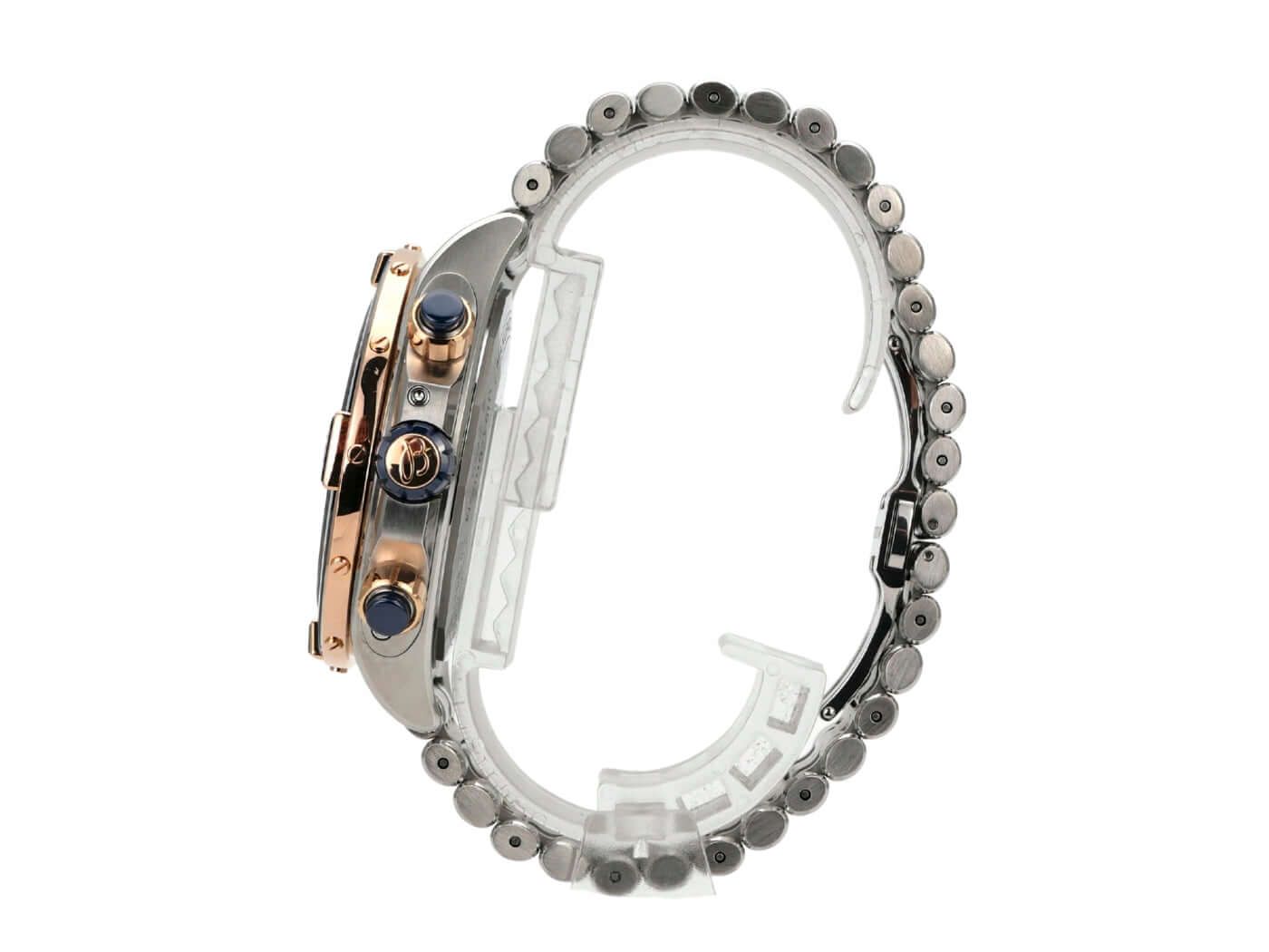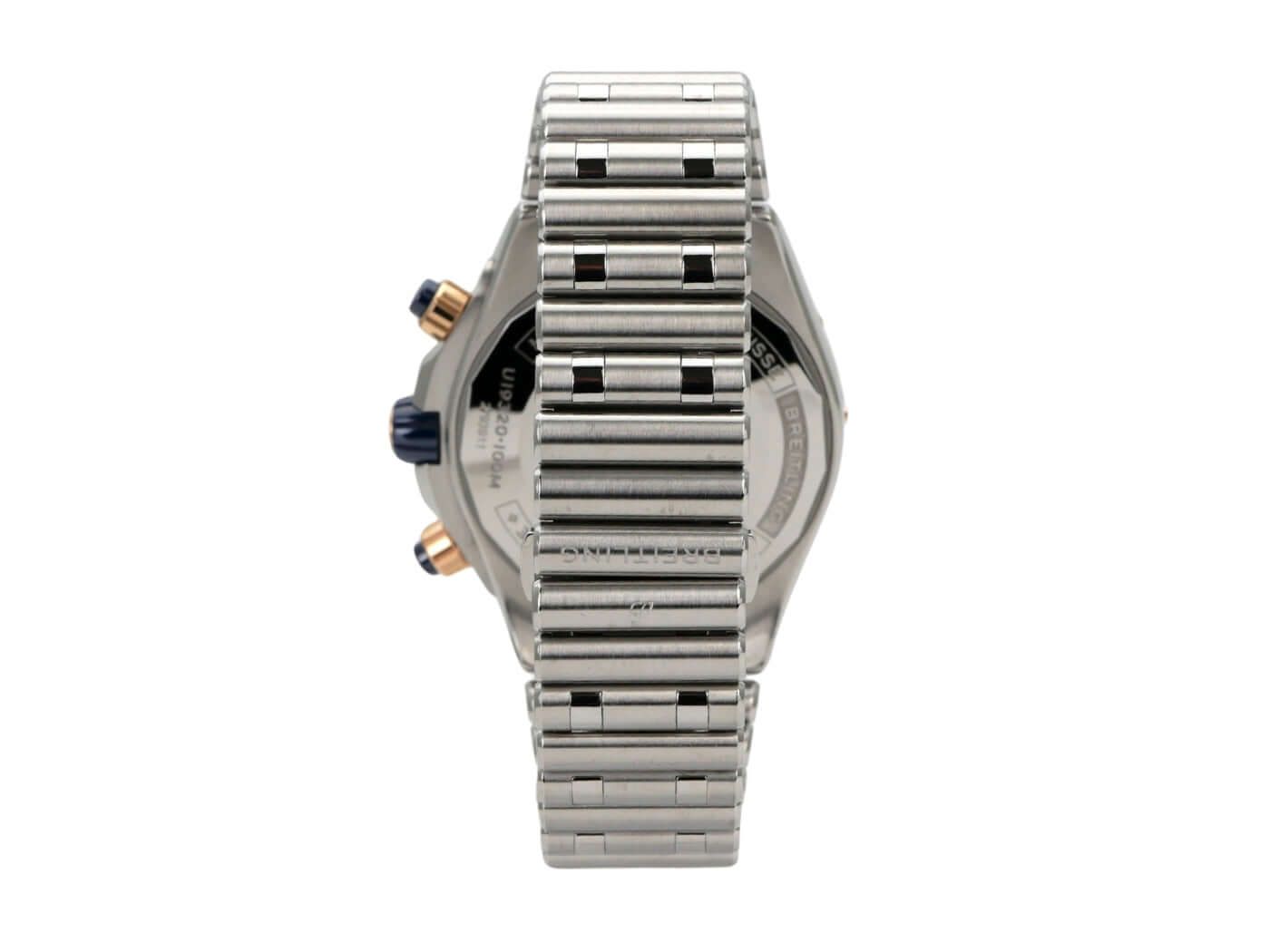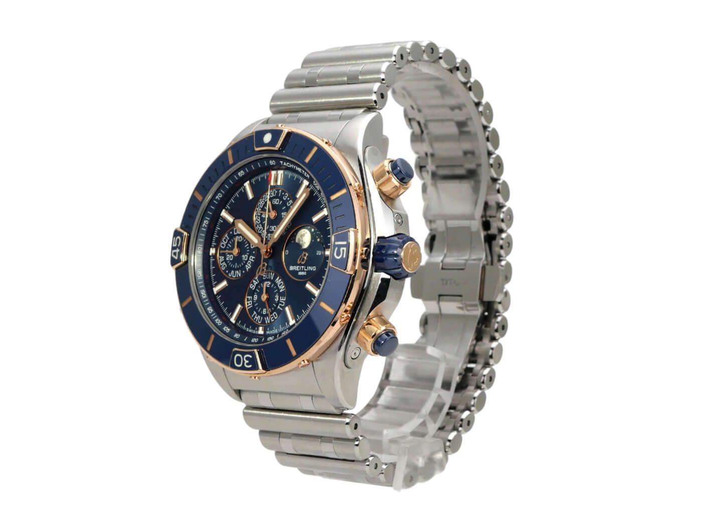 Cassa in acciaio inossidabile lucido e satinato, diametro cassa 44 mm, altezza cassa 14,50 mm, lunetta in oro rosa 18 kt con inserto in ceramica blu, rotazione unidirezionale, spallette in oro rosa 18 kt, bracciale in acciaio inossidabile / oro rosa con chiusura pieghevole, quadrante blu con indici luminescenti, lancette luminescenti, totalizzatori blu, movimento automatico, Breitling 19 con 47 rubini, 28.800 A/h, riserva di carica di circa 42 ore, cronografo, indicazione della data, giorno della settimana, mese, fase lunare, cronometro, vetro zaffiro con doppio trattamento anti-riflesso, fondo in acciaio inossidabile, impermeabile fino a 10 bar.