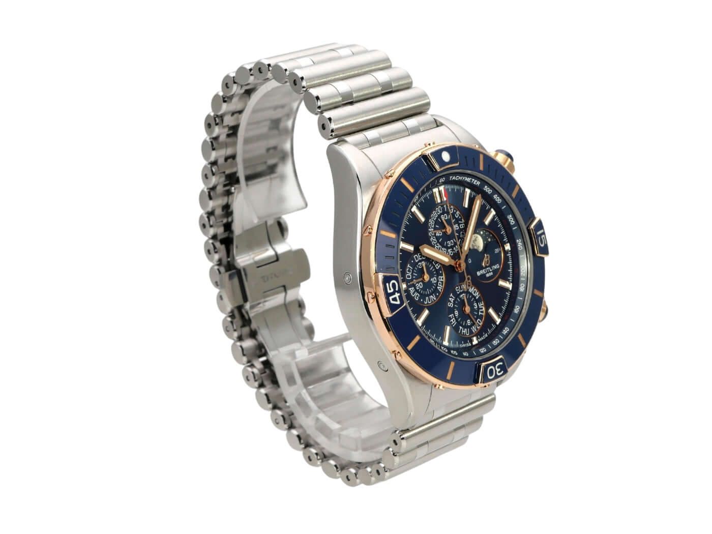 Breitling Super Chronomat 44 Four-Year Calendar U19320161C1U1Case made of polished and satin-finished stainless steel, case diameter 44 mm, case height 14.50 mm, 18 kt rose gold bezel with blue ceramic inlay, unidirectional rotating, riders made of 18 kt rose gold, stainless steel / rose gold bracelet with folding clasp, blue dial with luminous indices, luminous hands, blue totalizers, automatic movement, Breitling 19 with 47 jewels, 28,800 A/h, power reserve approx. 42 hours, chronograph, date display, day of the week, month, moon phase, chronometer, sapphire crystal double anti-reflective coating, stainless steel back, water resistant up to 10 bar.Used watch, very good condition, complete with box and papers, delivery from 2020, additional rubber strap included.