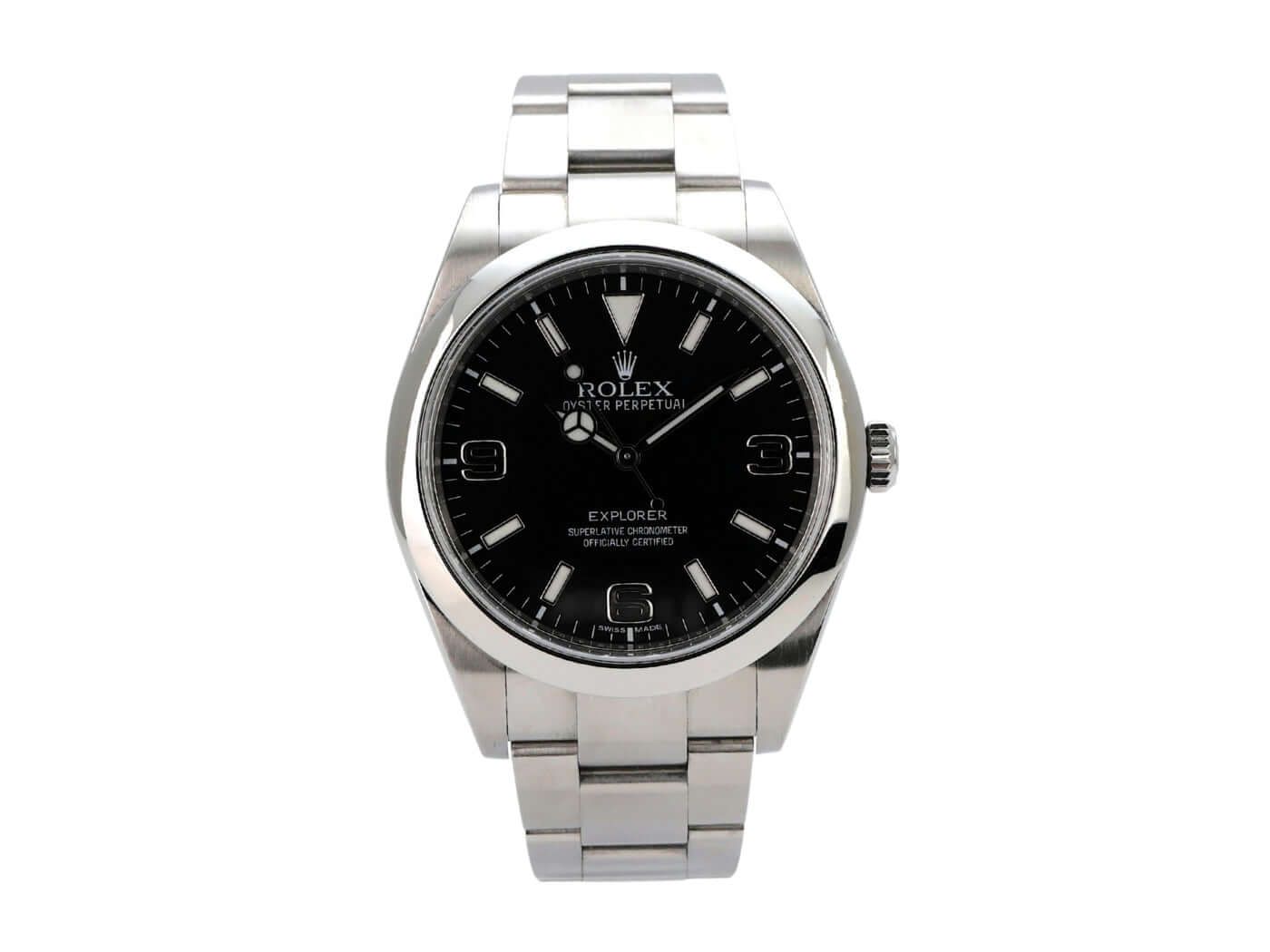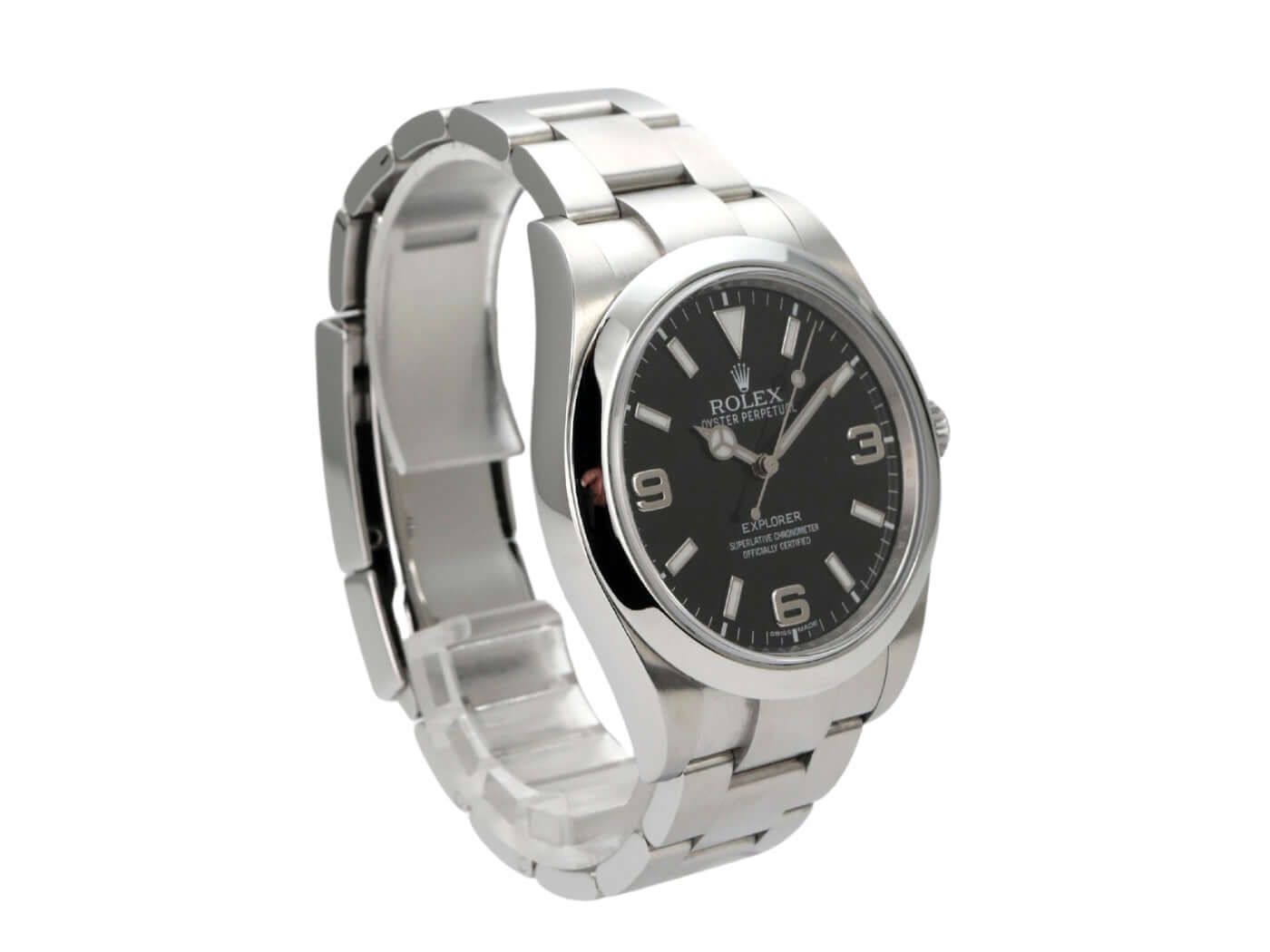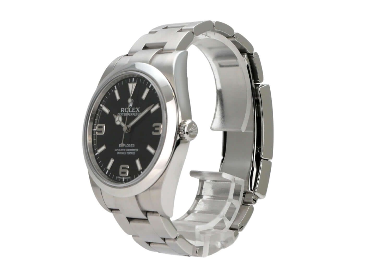 Rolex Explorer I Stainless Steel Ref. 214270 from 2015Case made of polished and satin-finished stainless steel, case diameter 39 mm, case height 11.4 mm, polished stainless steel bezel, Oyster stainless steel bracelet polished and satin-finished with folding clasp, black dial with applied Arabic numerals and luminous indices, automatic movement, Rolex manufacture caliber 3132 with 31 jewels, frequency 28,800 A/h, chronometer, scratch-resistant sapphire crystal, screw-down crown, screwed stainless steel case back, water-resistant up to 10 bar.