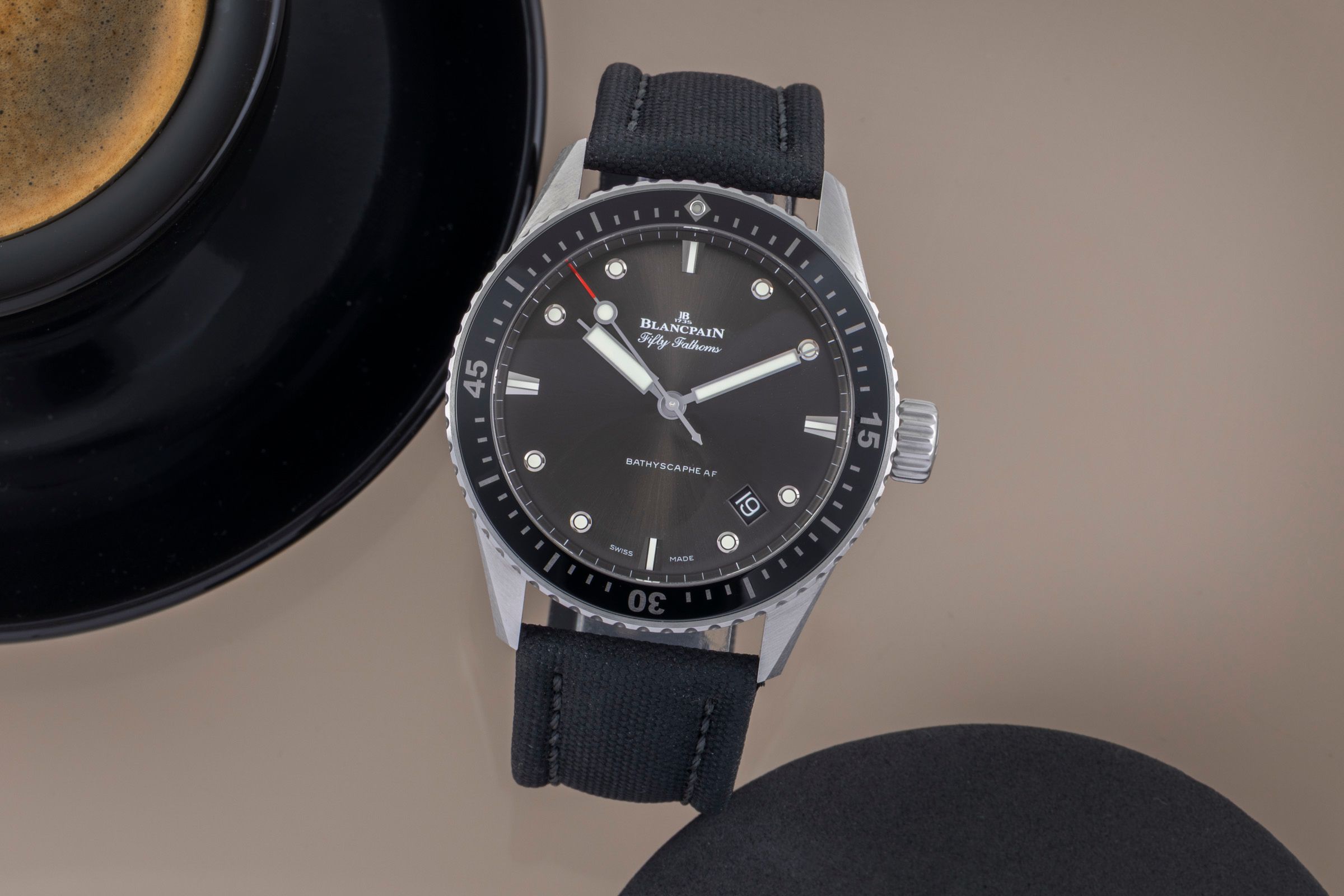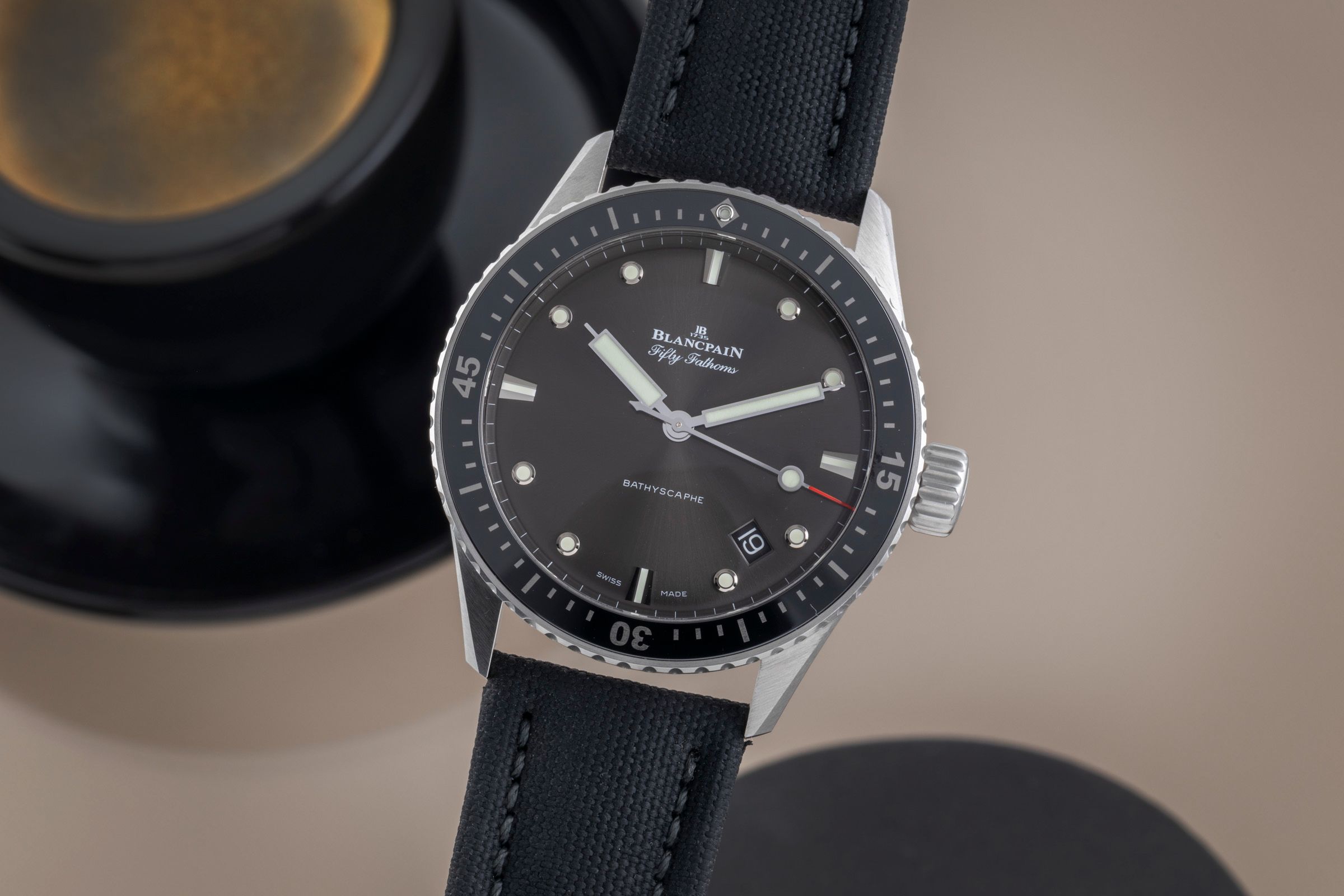 Alternative title: Blancpain 5000-1110-B52A Fifty Fathoms Bathyscaphe ; Blancpain Fifty Fathoms Bathyscaphe Stahl Ref. 5000 1110 B52A NP: 12050 € [2507523]
