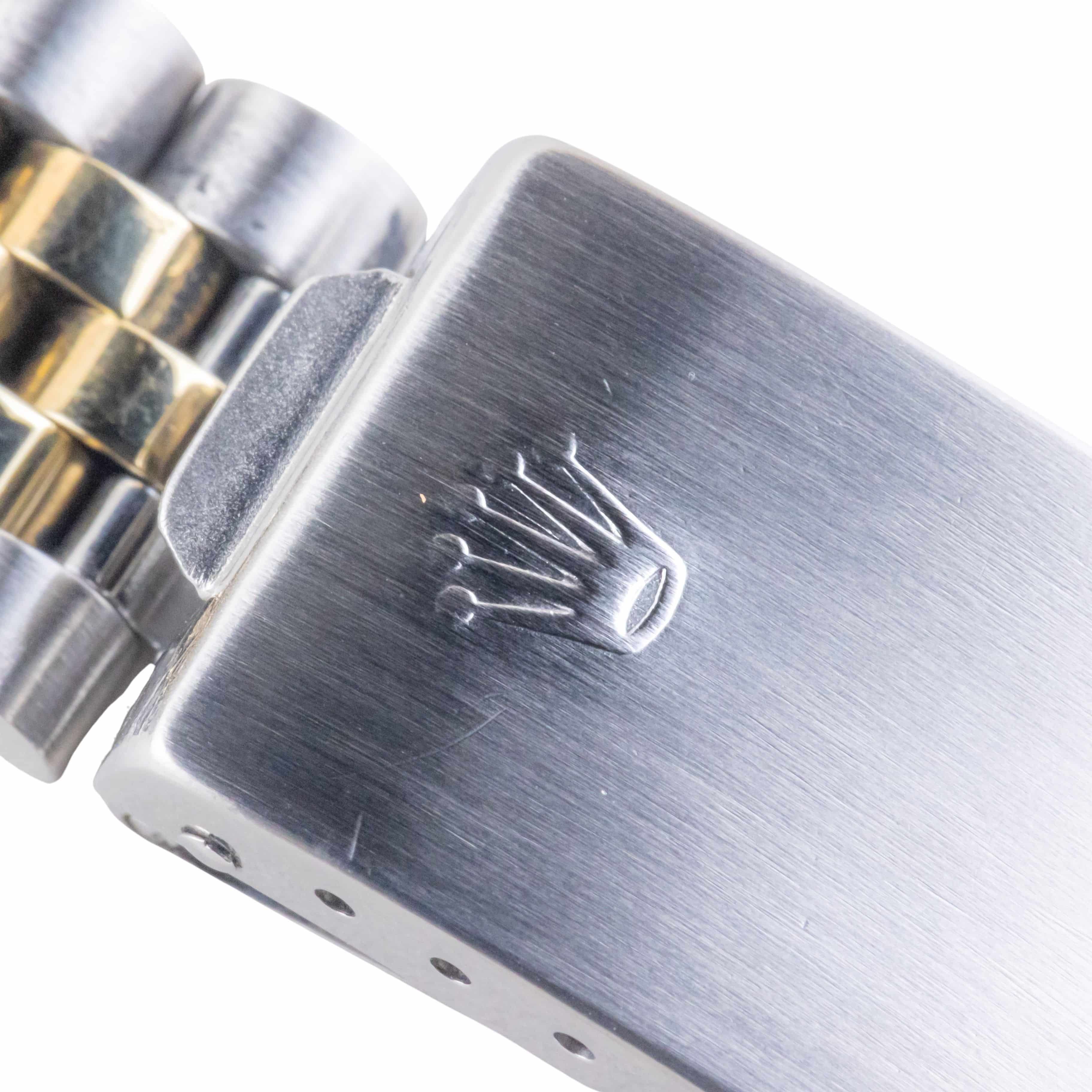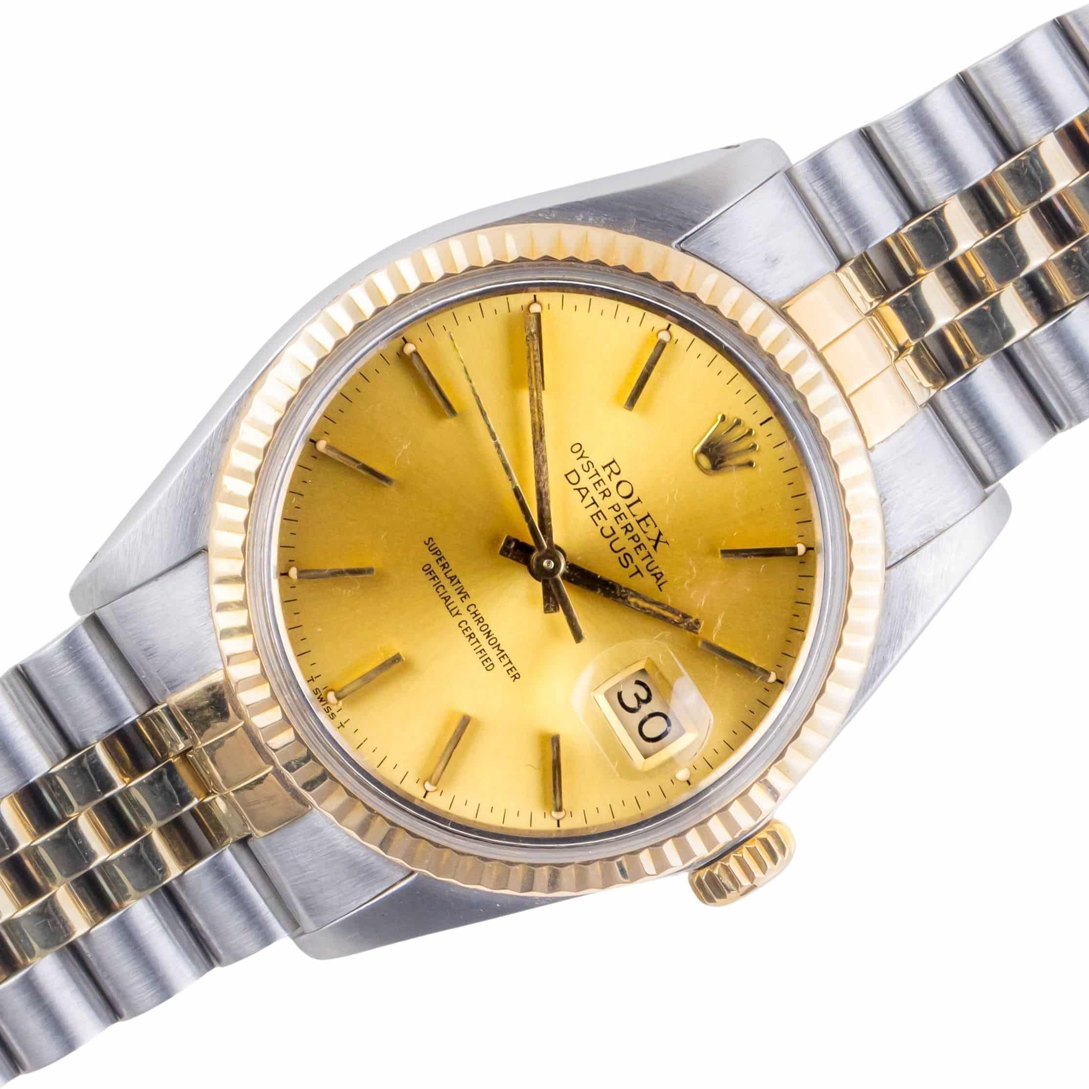 Rolex Oyster Perpetual Datejust riferimento 16013 del 1982. Il Datejust 16013 misura una cassa in oro e acciaio inossidabile da 36 mm, un bracciale Jubilee bicolore e una lunetta scanalata in oro 18k. Questo Datejust 16013 presenta un movimento automatico calibro 3035 con funzione di data rapida, un vetro plexi e un quadrante color champagne con indici a bastone.