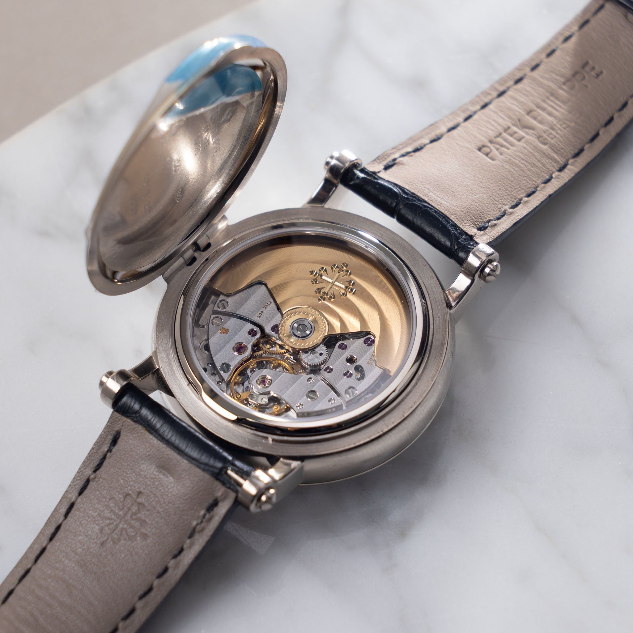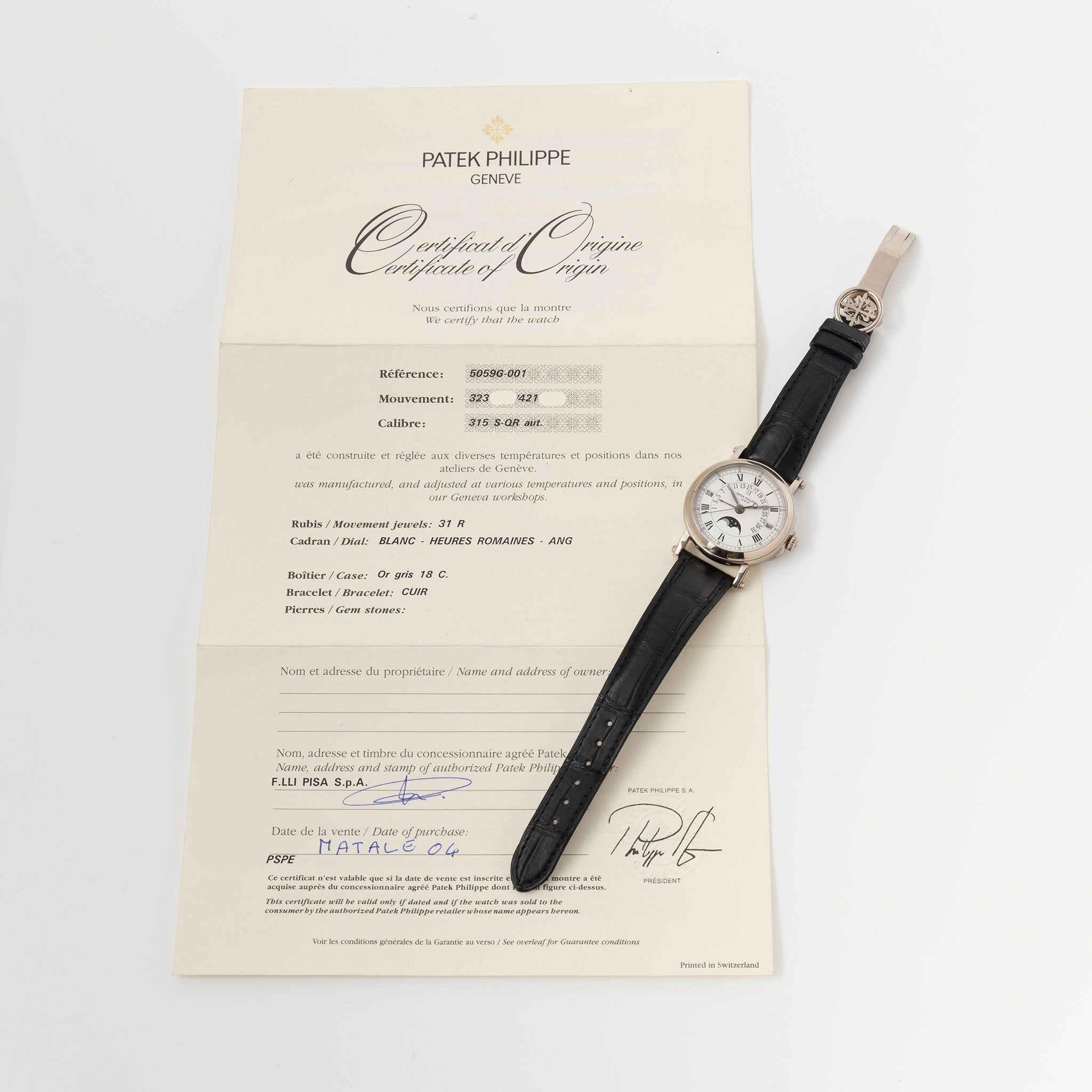 Introduced in 1998, Reference 5059 was the first serially produced perpetual calendar wristwatch with a retrograde date ever made by Patek Philippe. It was also the first perpetual calendar model since the legendary References 2497 and 2438-1 to feature a sweep centre-seconds hand. The watch is distinguished by its 36 mm officier-style case, with elongated lugs secured by screwed bars, as well as a hinged case back incorporating a display window and correctors for the moon-phase and calendar functions. Powering the watch is the automatic Calibre 315, fitted with a 21-carat gold rotor. The white dial features black Roman numerals as hour markers, cut-outs for the perpetual calendar and moon-phase displays, and is topped with four elegant blackened hands. The captivating retrograde date is fully integrated into the perpetual calendar mechanism, with the date hand instantly “flying” back to 1 at the end of each month. This fine complication is fitted with an original Patek Philippe leather strap and an 18K white-gold Calatrava style folding clasp. Furthermore the watch is accompanied by its original certificate of origin, stating a sale in 2004, as well as a 2025 service invoice from an authorized Patek Philippe dealer. As a result, the watch remains under Patek Philippe warranty. Total production of the Ref. 5059 remained under 1,400 pieces, spanning 18K yellow, white, and rose gold, along with platinum. Notably, fewer than 400 white-gold examples were produced throughout its eight-year lifespan.. Retrograde, rare, conversation starter and ridiculously charming—just like you! Specifications: Patek Philippe Perpetual Calendar reference 5059G 36mm 18k white gold case with display/ hinged case-back Perpetual Calendar retrograde layout with moon phase, English language Automatic movement Cal.315 with 21k gold-rotor Movement no 323xxxx case no 421xxxx dating to the early 2000’s Patek Philippe leather strap with original Patek Philippe 18k white gold folding buckle Patek Philippe certificate of origin stating sale in 2004 2025 Patek AD service invoice Still under Patek' warranty Free worldwide FedEx Priority shipping