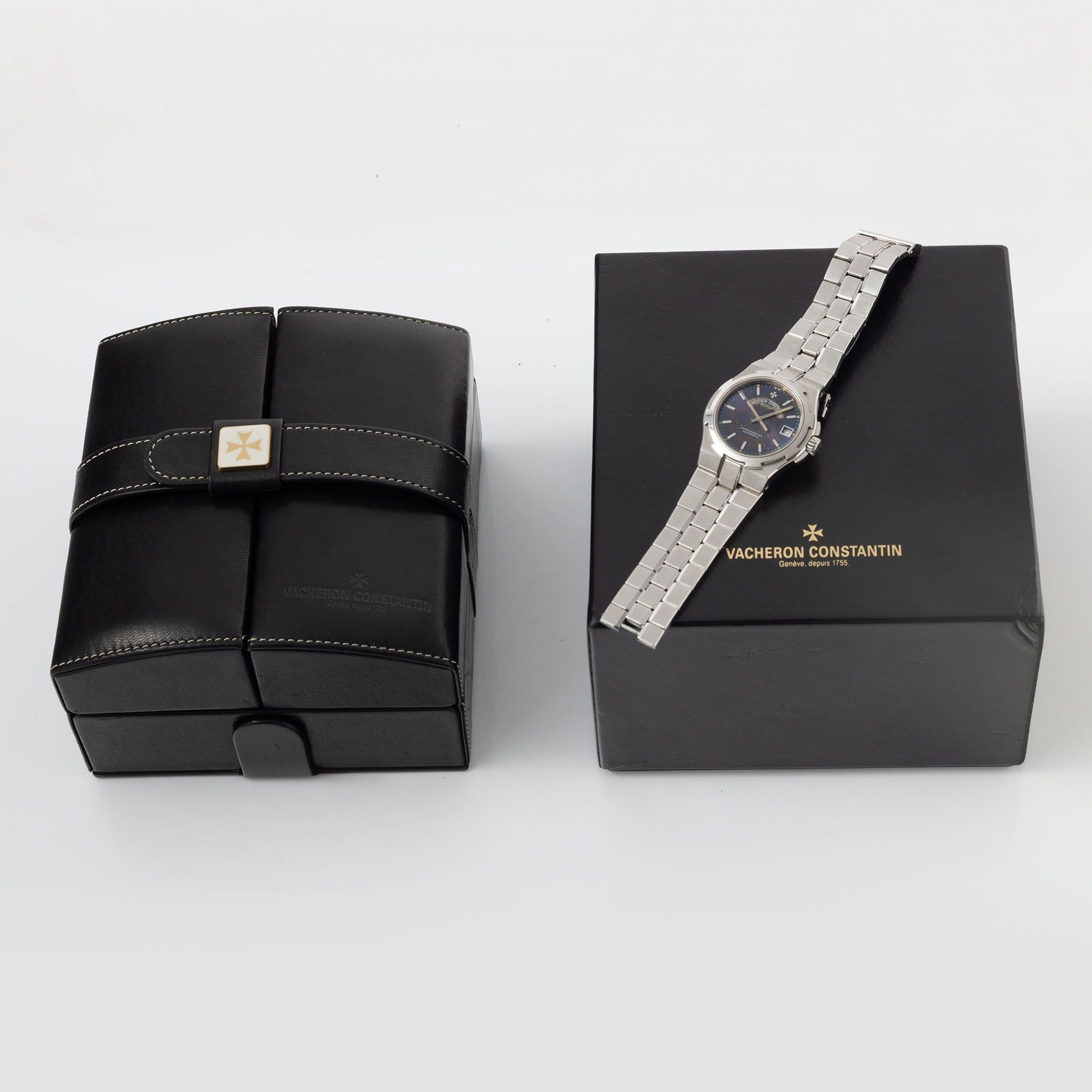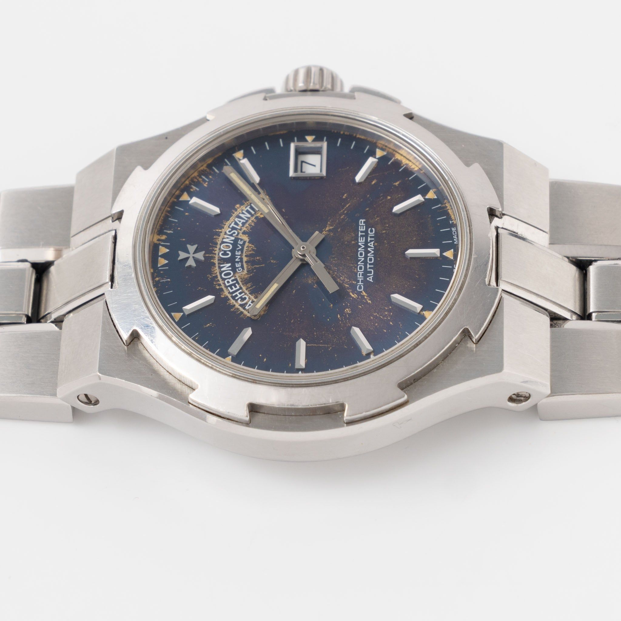 Presented in 1972, the Audemars Piguet Royal Oak completely transformed the high-end Swiss watch industry. Gérald Genta’s avant-garde creation was a sporty yet elegant steel wristwatch with a bold octagonal bezel and an integrated bracelet—one continuous architectural form rather than separate case and strap. Despite early criticism, Genta’s revolutionary idea became an international success, effectively creating an entirely new category of luxury timepieces. The Royal Oak’s impact inspired several other iconic steel sports watches with integrated bracelets, including the Patek Philippe Nautilus and the IWC Ingenieur—both also penned by Genta. Not to be outdone, Vacheron Constantin—the world’s oldest continuously operating watchmaker, now 270 years old—introduced its own interpretation of the luxury sports watch. To celebrate its 222nd anniversary, Vacheron unveiled the “222,” designed by a young Jörg Hysek. While the 222 echoed some of Genta’s design cues, it carried its own identity: a slim, barrel-shaped case, a notched round bezel, and a Maltese cross inset at 5 o’clock. The 222 would be followed by the octagonal 333 and the round-cased Phidias, both featuring integrated bracelets. Vacheron’s true breakthrough came in 1996 with the launch of the Overseas—the direct spiritual successor to the 222. Like its predecessor, the Overseas features a tonneau-shaped case and a fluted bezel inspired by the Maltese cross, extended by a sculptural, integrated bracelet that blends elegance and sportiness to perfection. And that brings us to what we’re excited to offer you today: a Vacheron Constantin Overseas reference 42040, housed in a perfectly sized 37 mm steel case. The iconic case is in excellent condition, as is the integrated bracelet, which fits wrists up to 18.5 cm. The dial—originally blue—has aged into a rich purple tropical tone, with subtle hints of underlying copper peeking through. It features a date window, crisp white printing, and charming small triangular tritium markers that have aged to a warm beige patina. This unexpected, almost utilitarian twist gives the watch a bold edge—adding character rarely seen on an Overseas. This tropical 42040 comes complete with its original inner and outer boxes, booklets, and its Certificate of Origin and Warranty, indicating a 1998 sale.This fine VC is powered by automatic cal.1310 and has been fully serviced by our watchmaker. A rare, characterful, early Overseas—ready for the next chapter in its journey ! Specifications: Vacheron Constantin Overseas reference 42040 /423A 37mm steel case Overseas signature bezel Serial 688xxx dates to the 1990's Original blue dial discoloured to tropical purple and copper tones Sailing boat case back engraving Calibre VC1310 automatic chronometer movement Integrated steel bracelet Inner and outer boxes Booklets and Certificate of Origin stating a sale in 1998 Fully serviced by our watchmaker One-year mechanical warranty Free worldwide Fedex Priority shipping