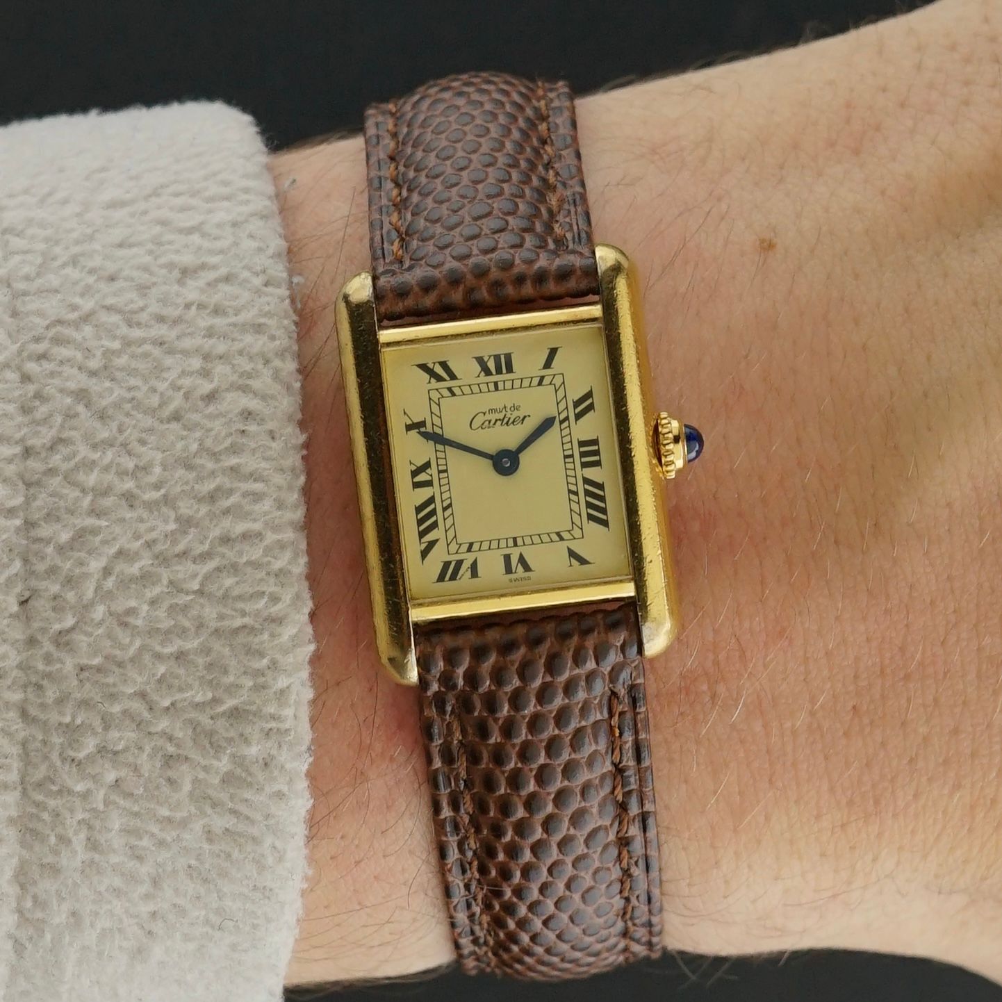 This beautiful vintage Cartier Tank from the 1990s is the SM size, featuring a 20,5mm case width. The case is crafted from silver with gold plating, which remains in good condition throughout, an important detail. The champagne dial shows a natural spider effect from lacquer cracking over time, adding genuine vintage character. It features Roman numerals, blue hands, and a blue ruby cabochon crown.Inside is a Cartier quartz movement, overhauled in January 2026 and currently running and functioning excellently. We have paired the watch with a brown leather strap with a lizard grain motif, and it also includes the original Cartier Bordeaux red leather strap and Cartier buckle. In great overall condition, this piece makes an excellent dress watch.