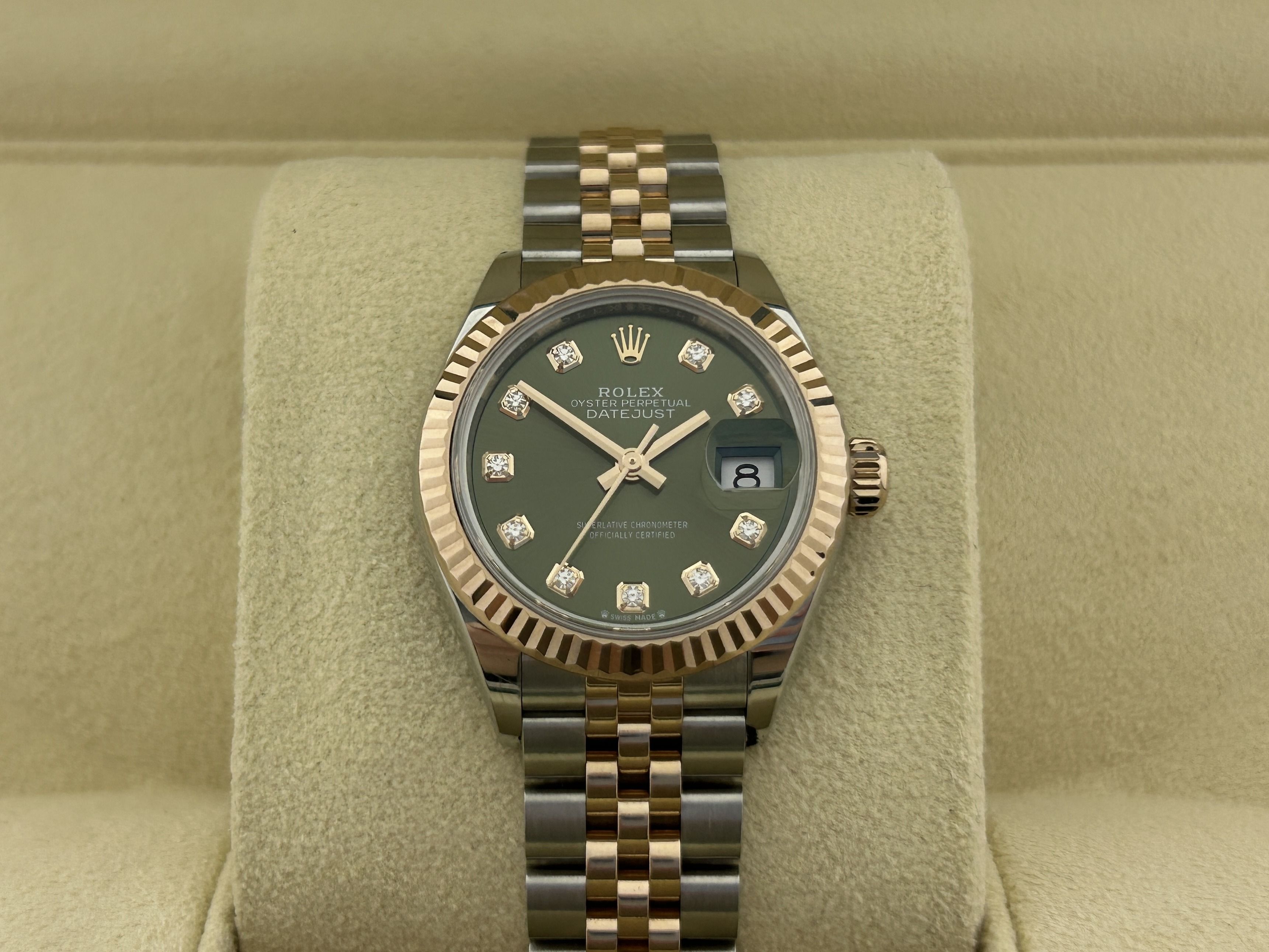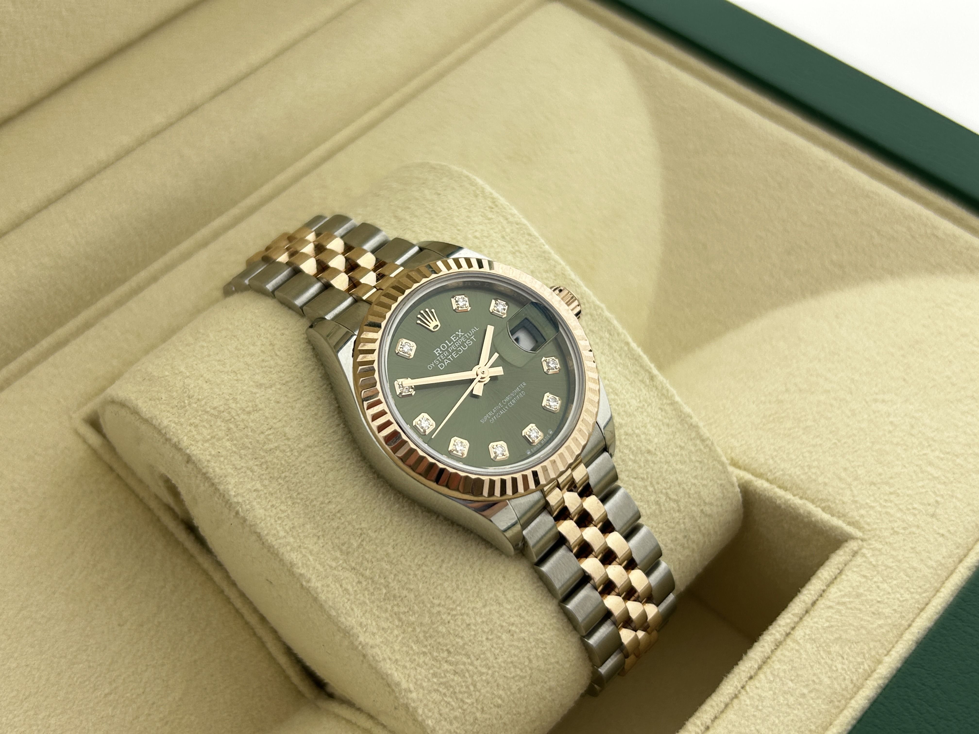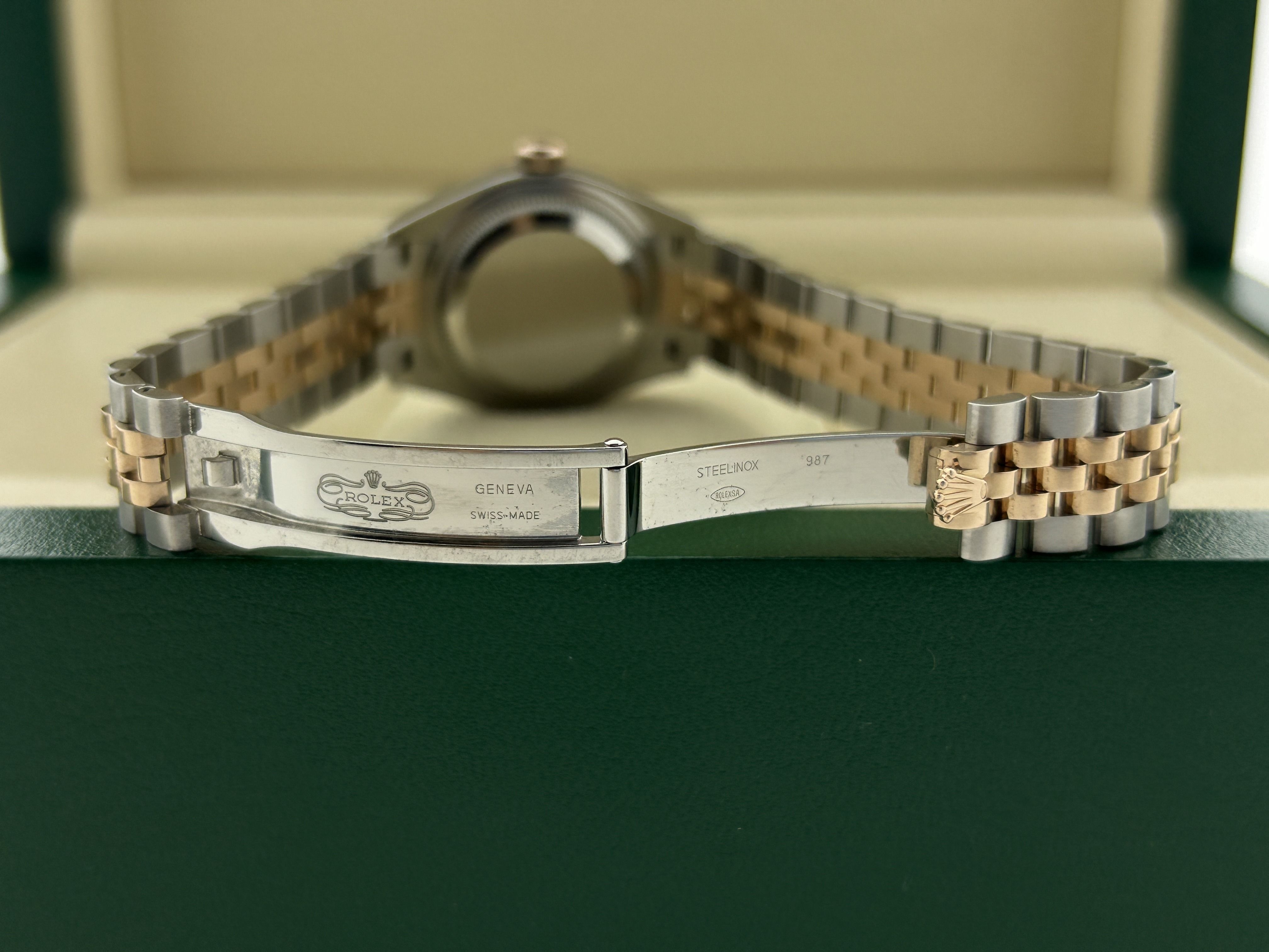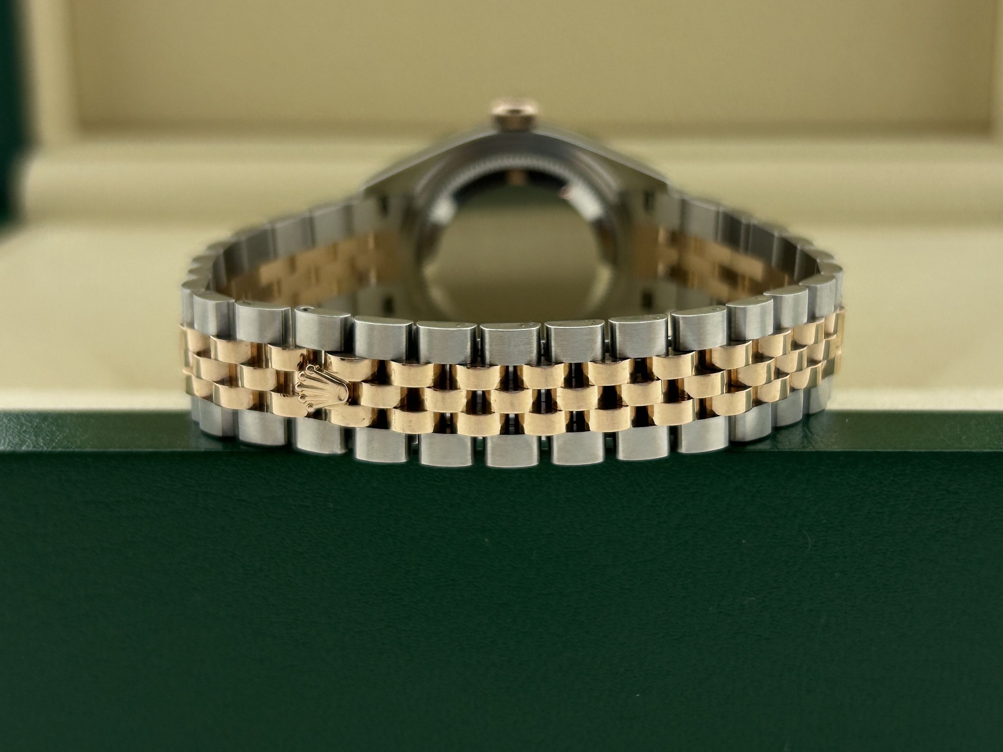 The Rolex comes with international Rolex warranty.A rosegold/steel Rolex Lady-Datejust 28, ref. 279171, fullset, from 2024. The Rolex has a 28mm steel case with a fluted rosegold bezel and a rosegold/steel Jubilee-bracelet. The bracelet has an invisible clasp with a rosegold Rolex crown. The watch has a green dial with diamond hour markers and a date-window at 3 o'clock. The Rolex is from 2024 and is complete with the original box and certificate. The watch is in a great condition.