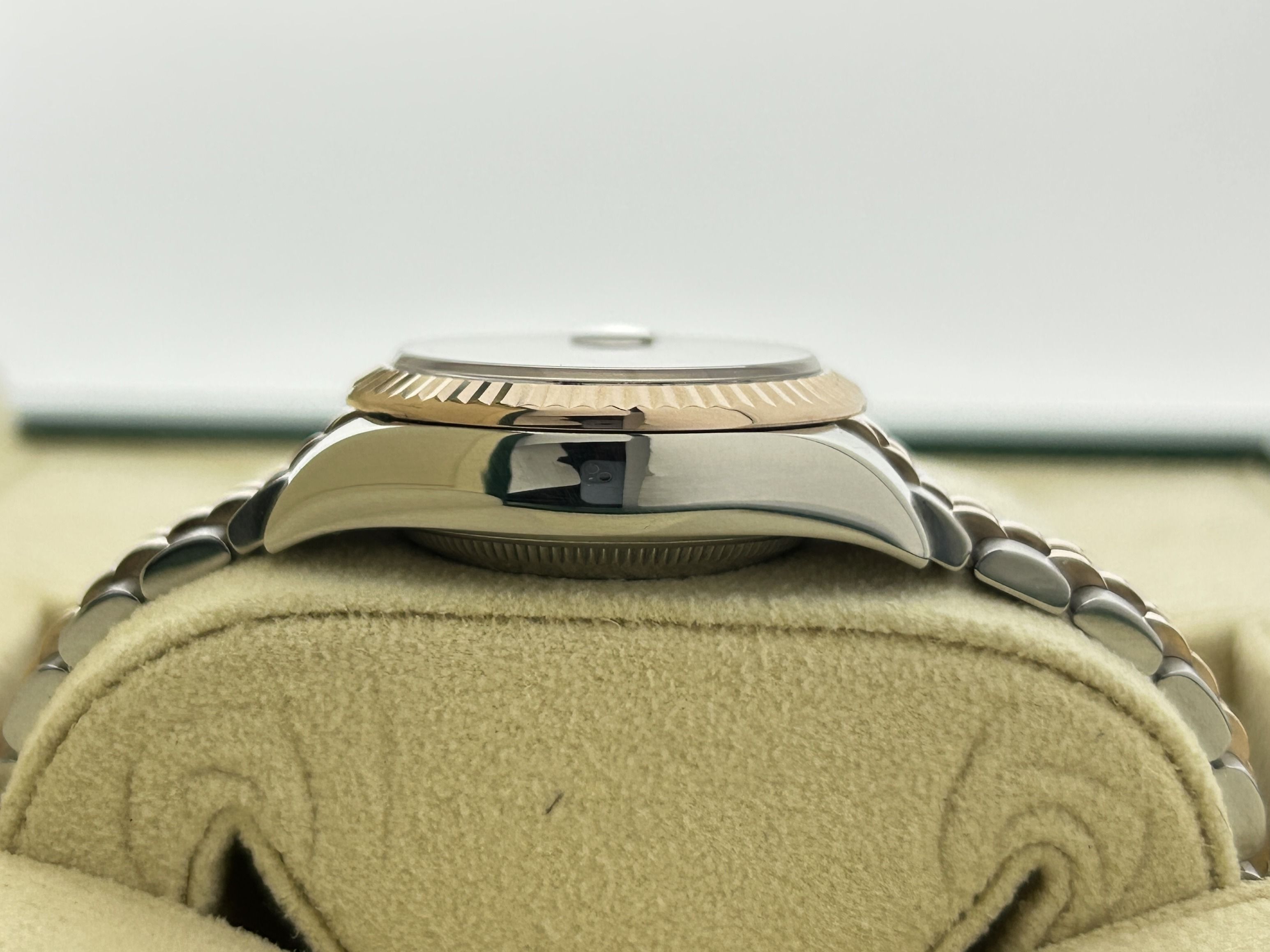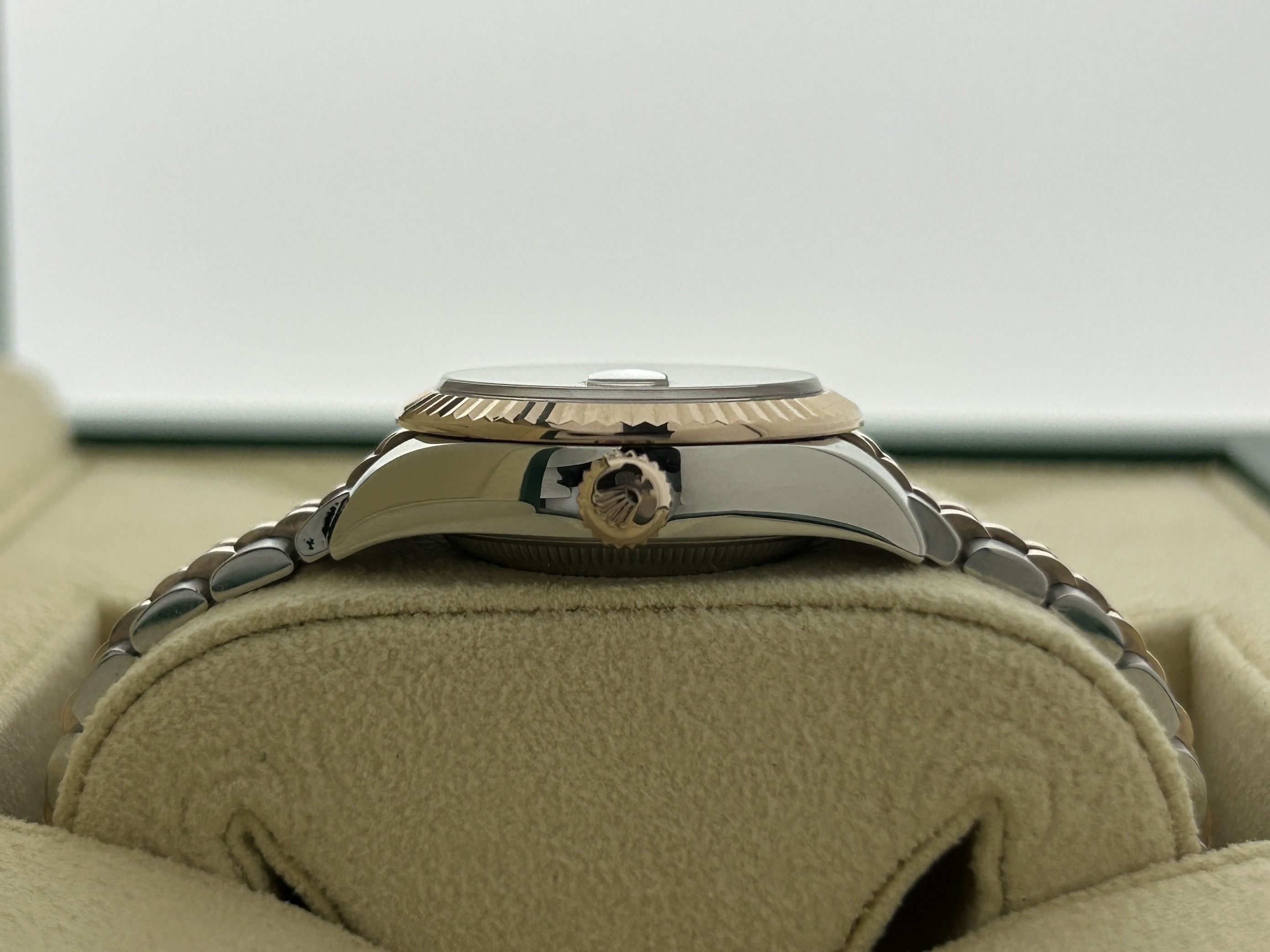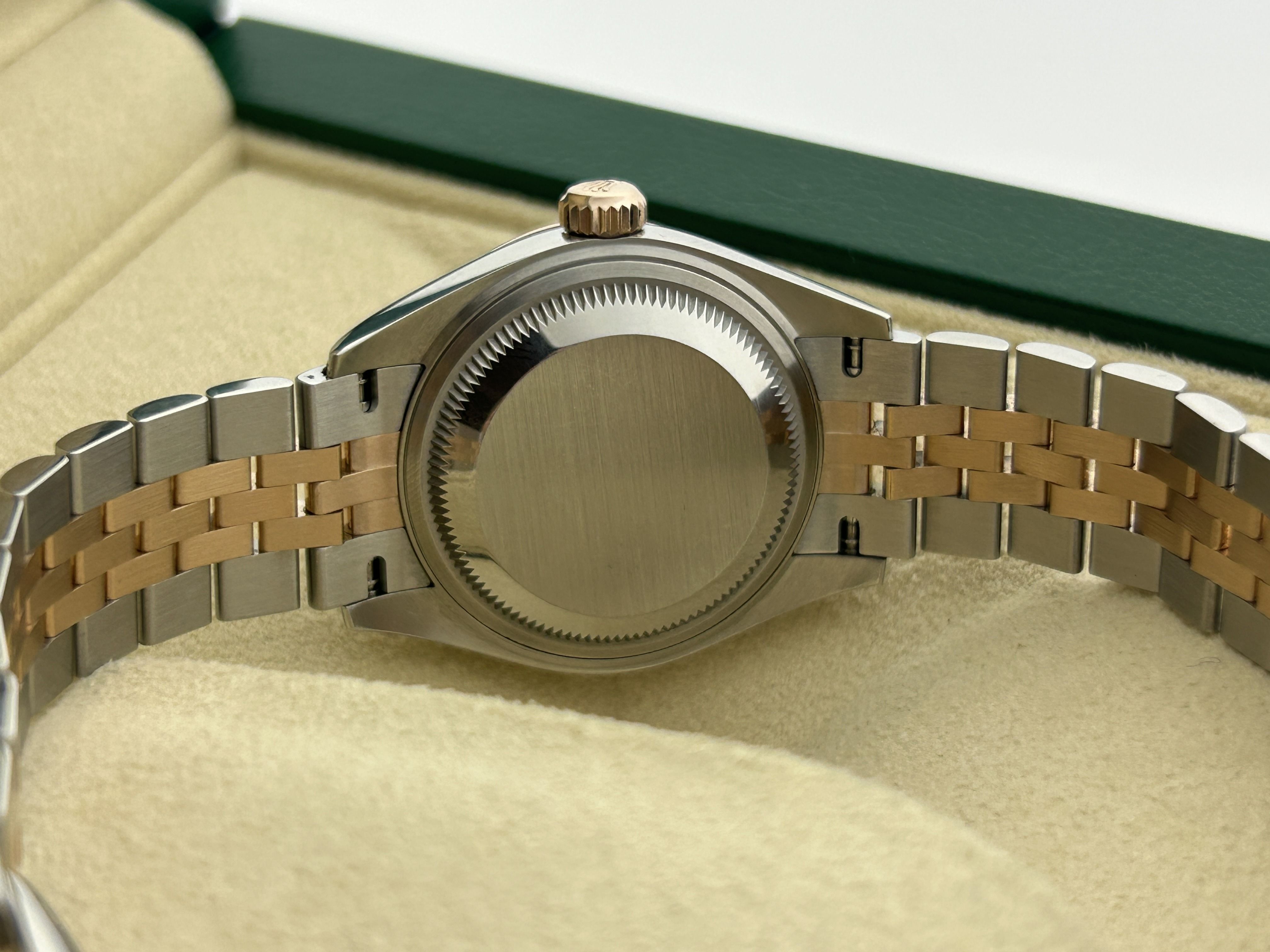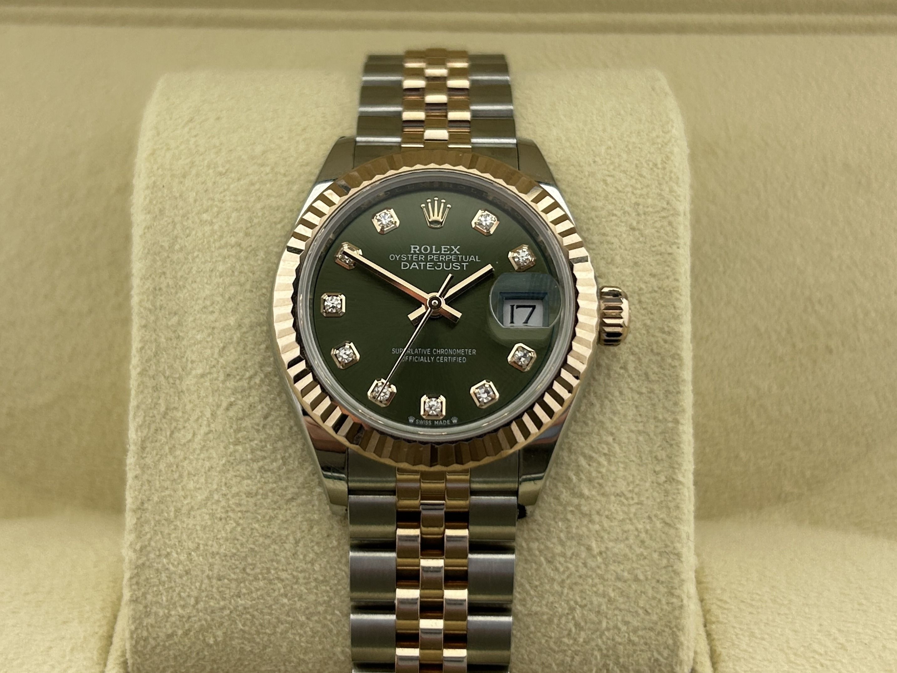 The Rolex comes with international Rolex warranty.A rosegold/steel Rolex Lady-Datejust 28, ref. 279171, fullset, from 2024. The Rolex has a 28mm steel case with a fluted rosegold bezel and a rosegold/steel Jubilee-bracelet. The bracelet has an invisible clasp with a rosegold Rolex crown. The watch has a green dial with diamond hour markers and a date-window at 3 o'clock. The Rolex is from 2024 and is complete with the original box and certificate. The watch is in a great condition.