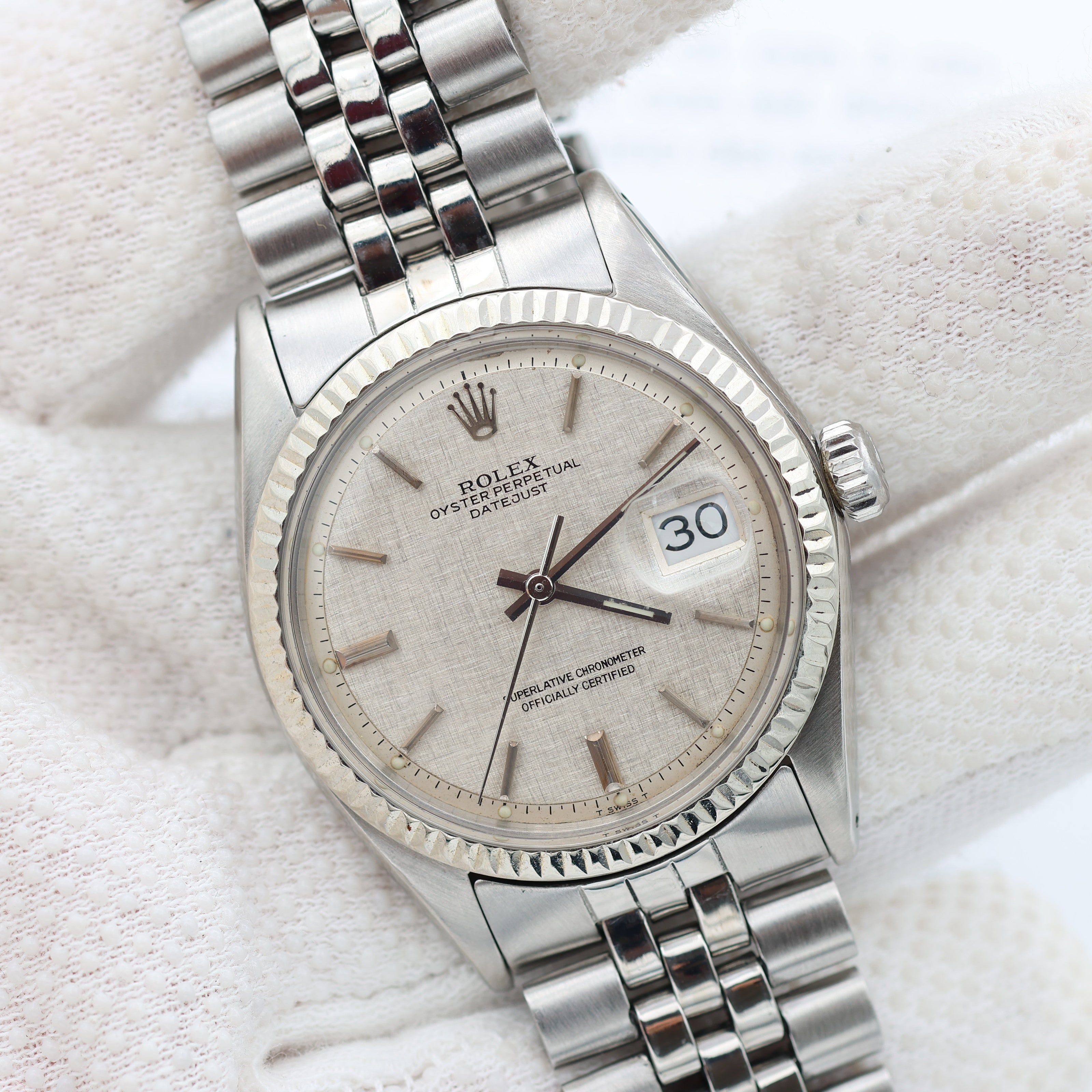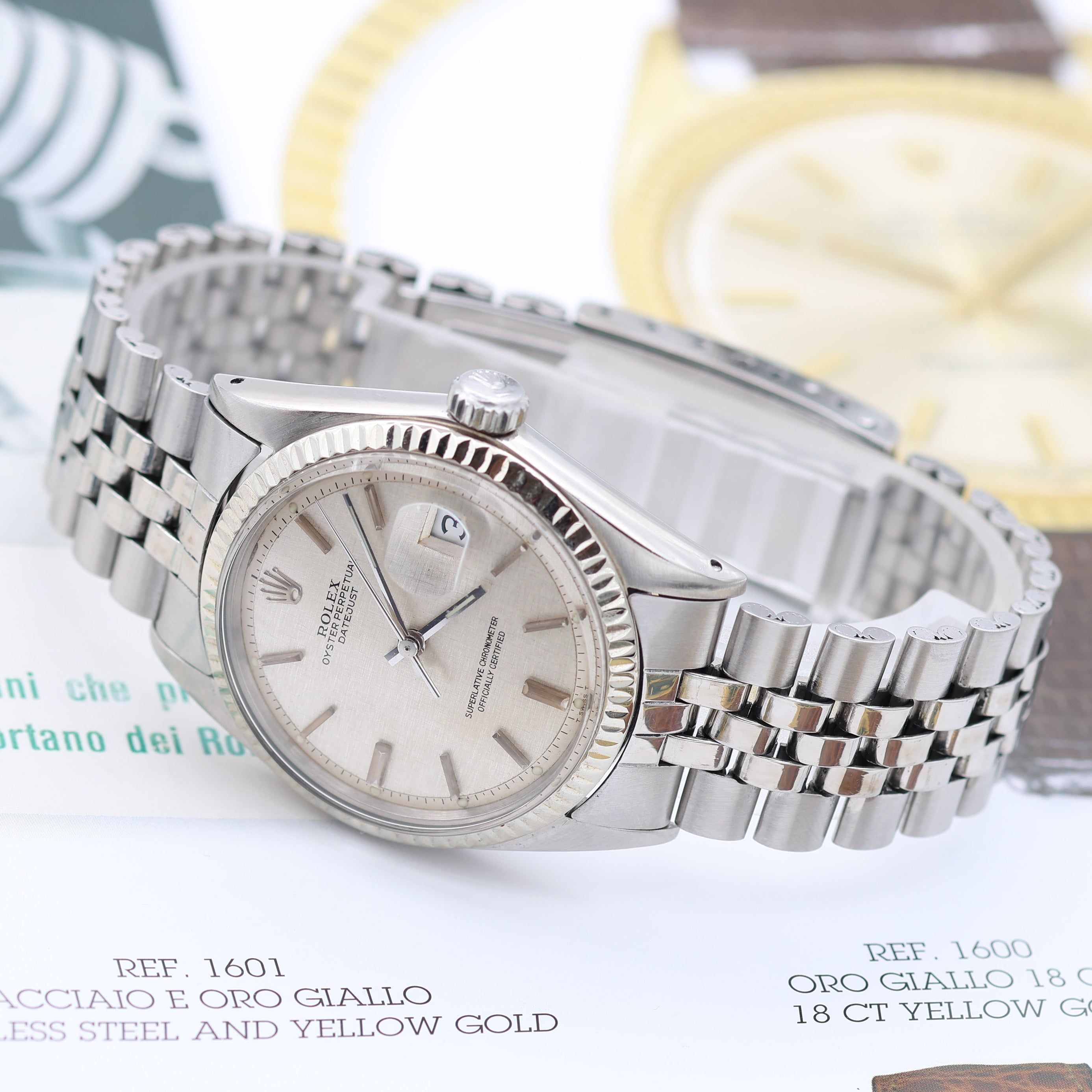 For sale at Debonar Watches: pre-owned Rolex Datejust ref. 1601 in steel and white gold, with a rare and bright linen dial, and a Jubilee bracelet.The Rolex Datejust is considered the definitive “watch”: its design has barely changed in 60 years and is a familiar sight even to non-enthusiasts. This Rolex has all the signature aesthetics of a Datejust, which include a fluted bezel, baton hour markers, and the Cyclops magnifying bubble over the date window. BRAND ROLEX MODEL DATEJUST REFERENCE 1601 CASE MATERIAL STEEL MOVEMENT AUTOMATIC DIMENSION 36 MM DIAL LINEN BEZEL WHITE GOLD CRYSTAL PLEXIGLASS BRACELET TYPE BRACELET BRACELET MATERIAL JUBILEE BRACELET LENGHT 17 CM ORIGINAL BOX NO ORIGINAL PAPERS NO YEAR APPROX. THE '70s CONDITION VERY GOOD