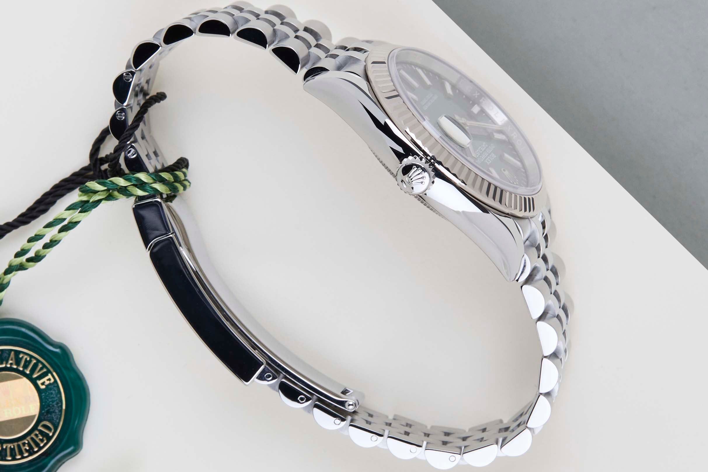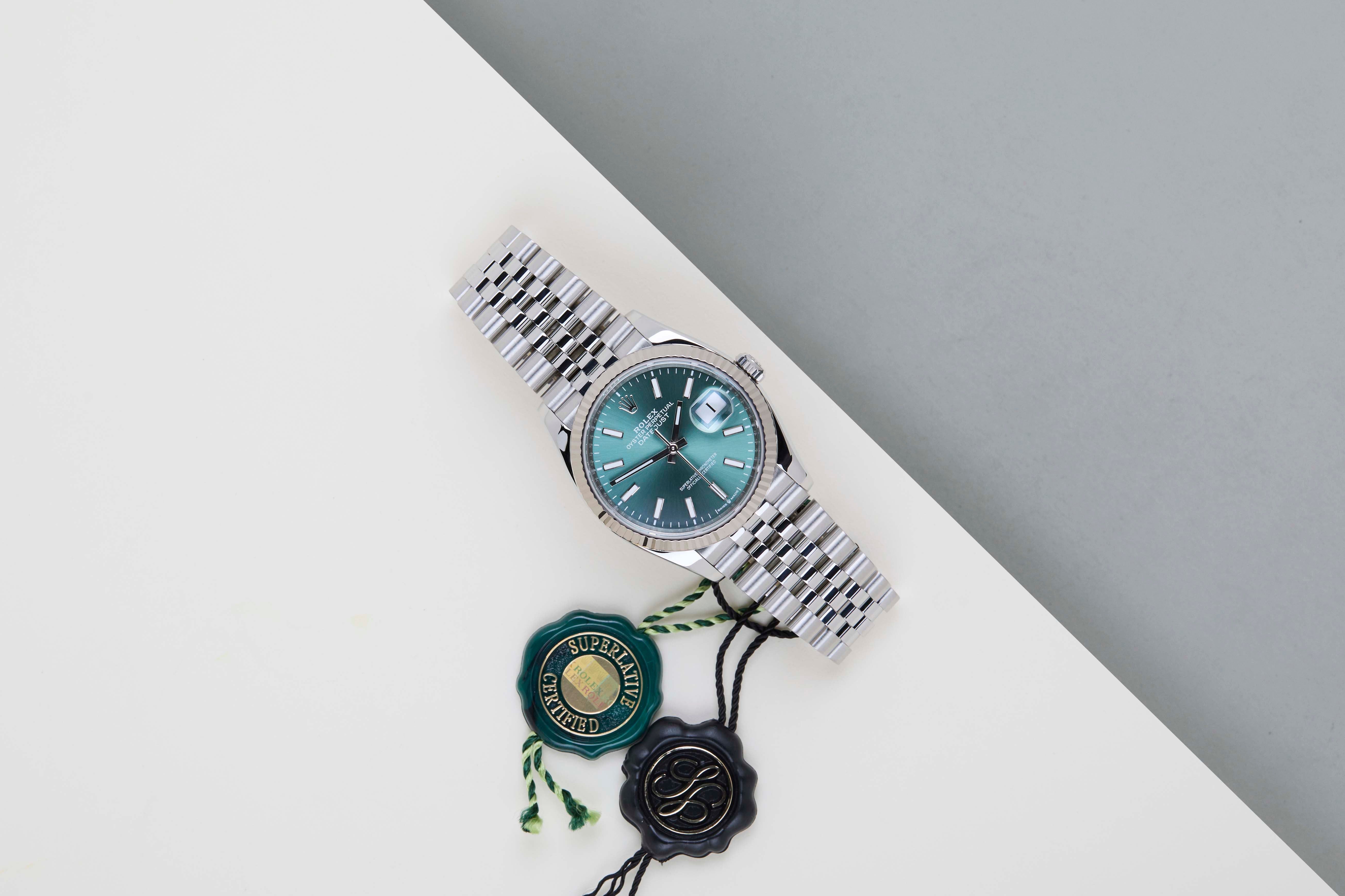 Full Set | International Rolex Warranty Until July 2027Rolex introduced the original Datejust in 1945 to celebrate the company's 40th anniversary. Due to the various case sizes and materials, the Datejust has been ingrained in Rolex's history and remains incredibly popular for nearly 80 years.This Rolex Datejust 'Mint Green Dial - Jubilee' was sold for the first time in July 2022.This Datejust is made of a combination of 18k White Gold and stainless steel and is fitted with an Jubilee bracelet which is equipped with the Easylink. This extension, allows the wearer to either extend or shorten the bracelet by 5 millimeters, improving the wearability and usability of the watch.This Rolex Datejust 36 is in Mint condition and comes with the original Rolex Warranty Card and box. Furthermore, the watch still has International Rolex Warranty until July 2027.
