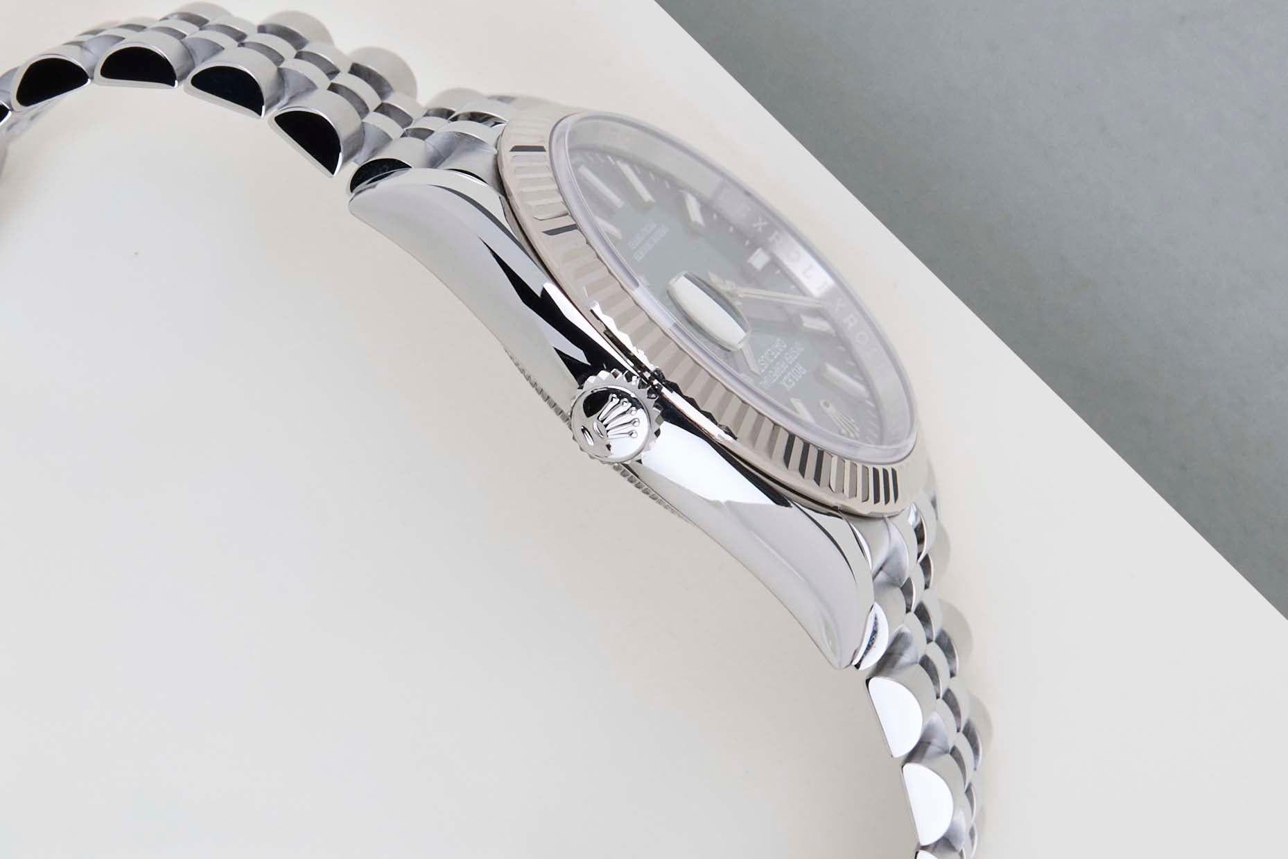 Questo Datejust è realizzato in una combinazione di oro bianco 18k e acciaio inossidabile ed è dotato di un bracciale Jubilee equipaggiato con l'Easylink. Questa estensione consente all'indossatore di allungare o accorciare il bracciale di 5 millimetri, migliorando la vestibilità e l'usabilità dell'orologio.