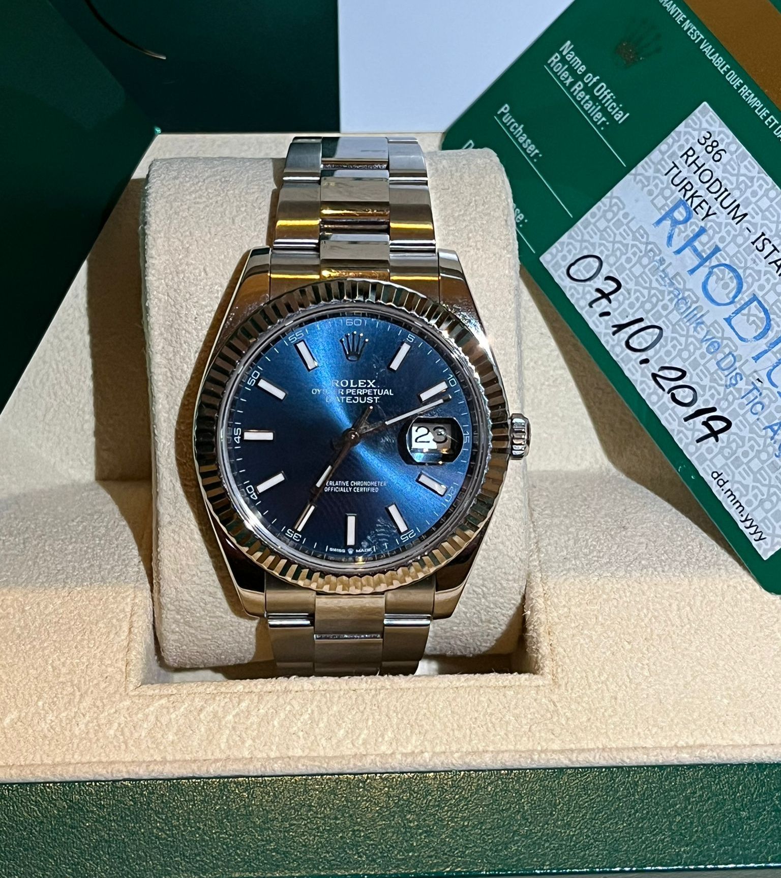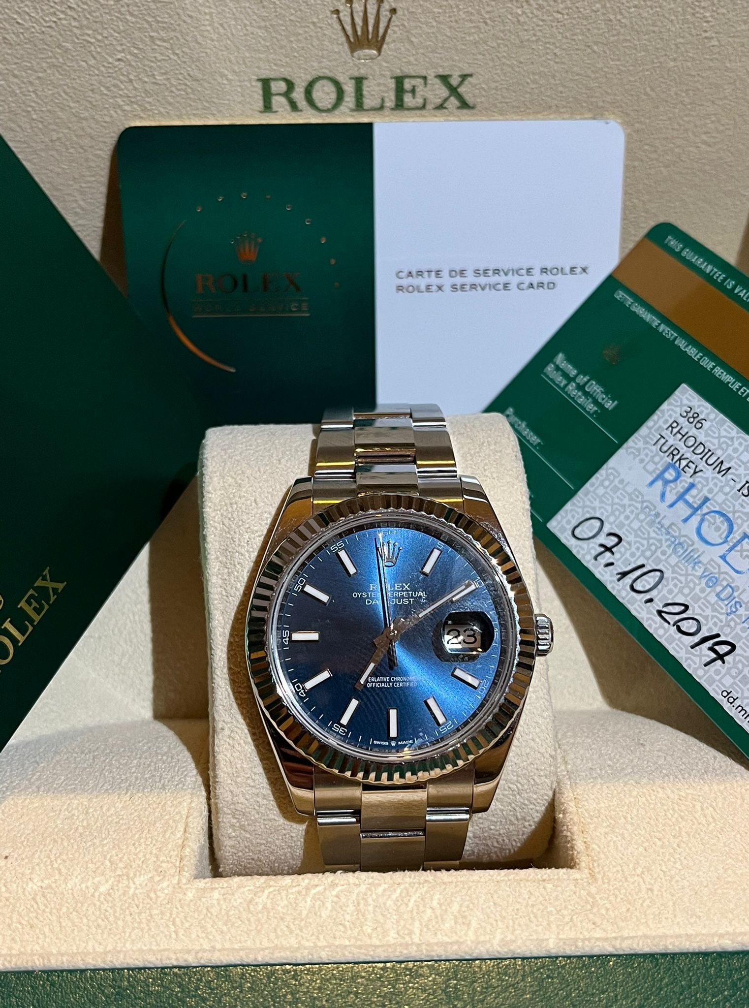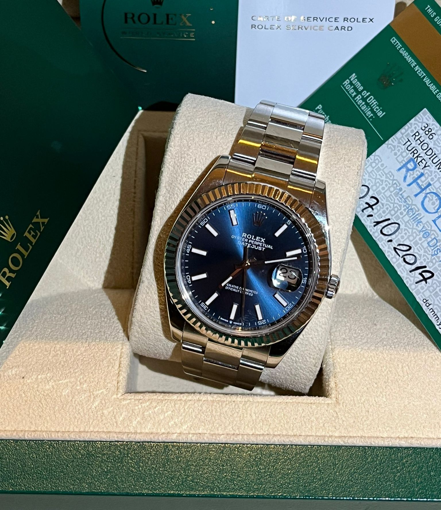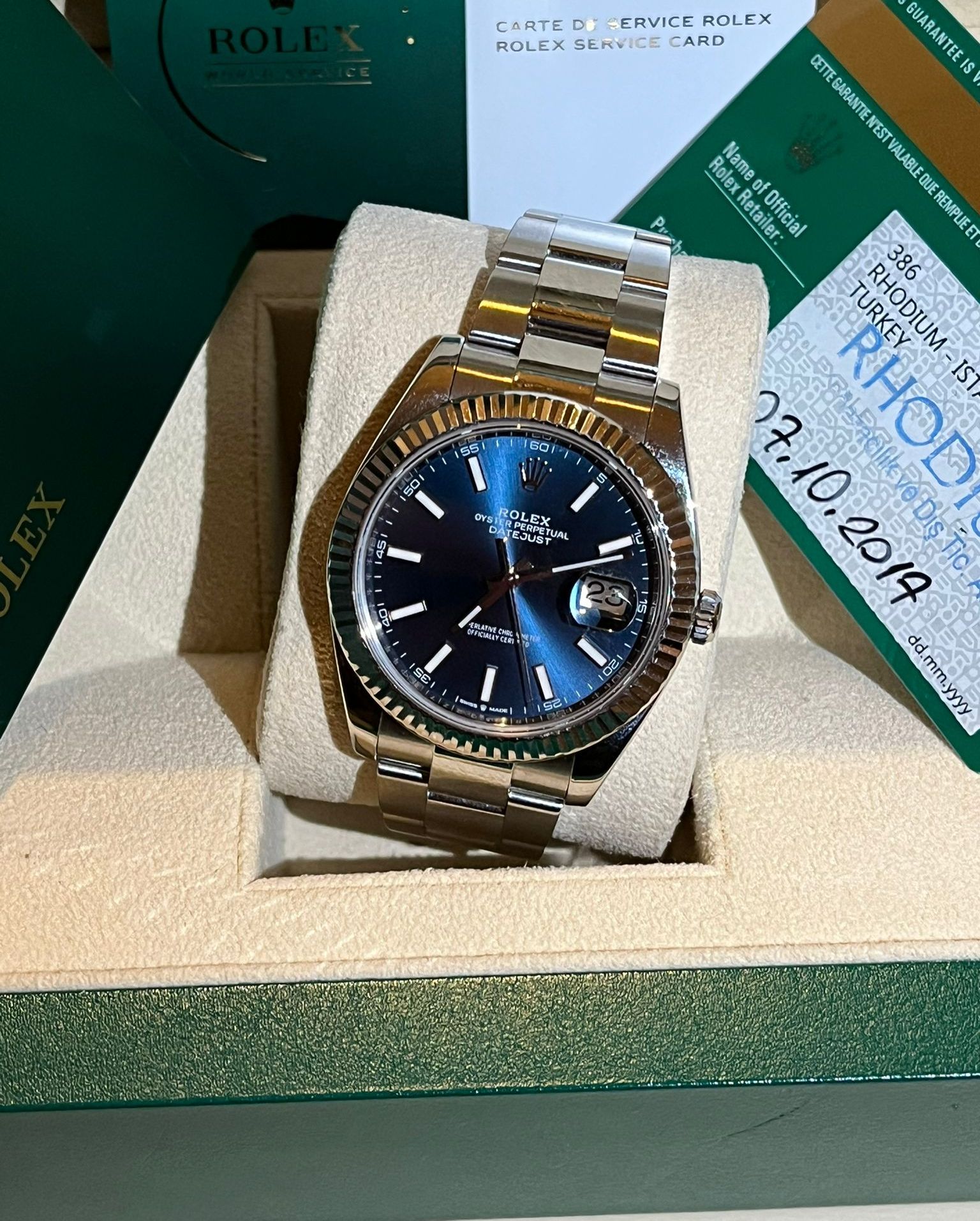 Questo straordinario Rolex Datejust ref. 126334 è presentato con l'iconica quadrante blu—una delle configurazioni più eleganti e senza tempo della collezione Datejust. Il profondo quadrante blu soleil, combinato con la caratteristica lunetta scanalata in oro bianco e il bracciale Oyster in acciaio inossidabile, crea un perfetto equilibrio tra lusso classico e versatilità quotidiana.