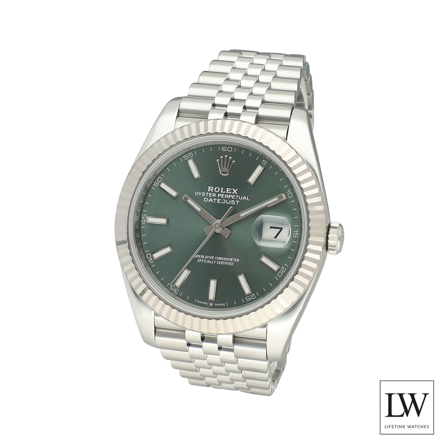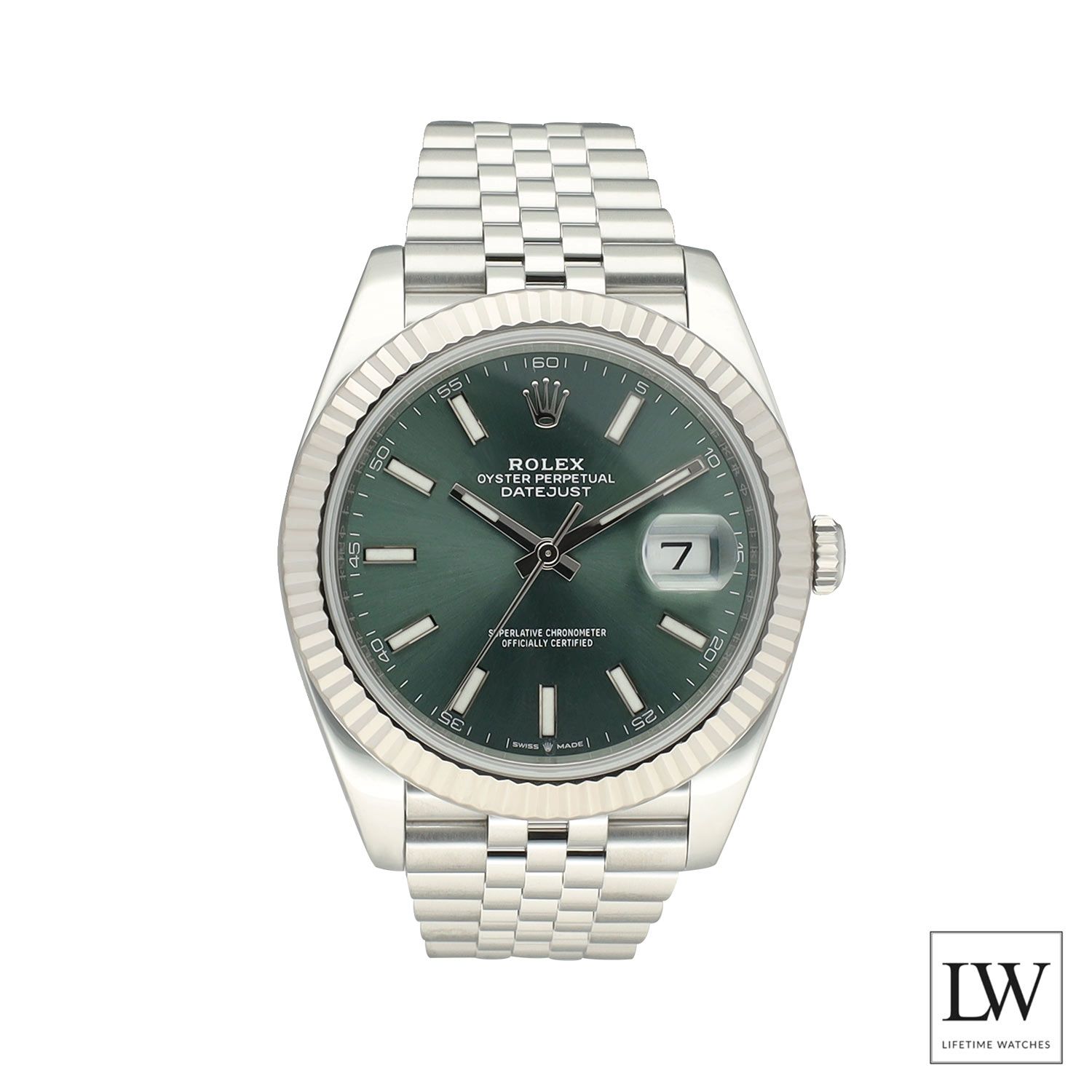 The 41 mm case is crafted from durable Oystersteel and finished with an 18-carat white gold fluted bezel. Paired with the iconic Jubilee bracelet, originally designed for the Datejust, this watch offers exceptional comfort and timeless elegance.