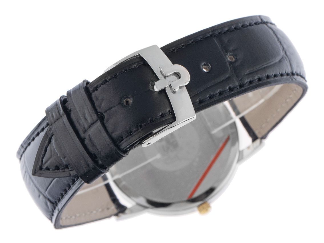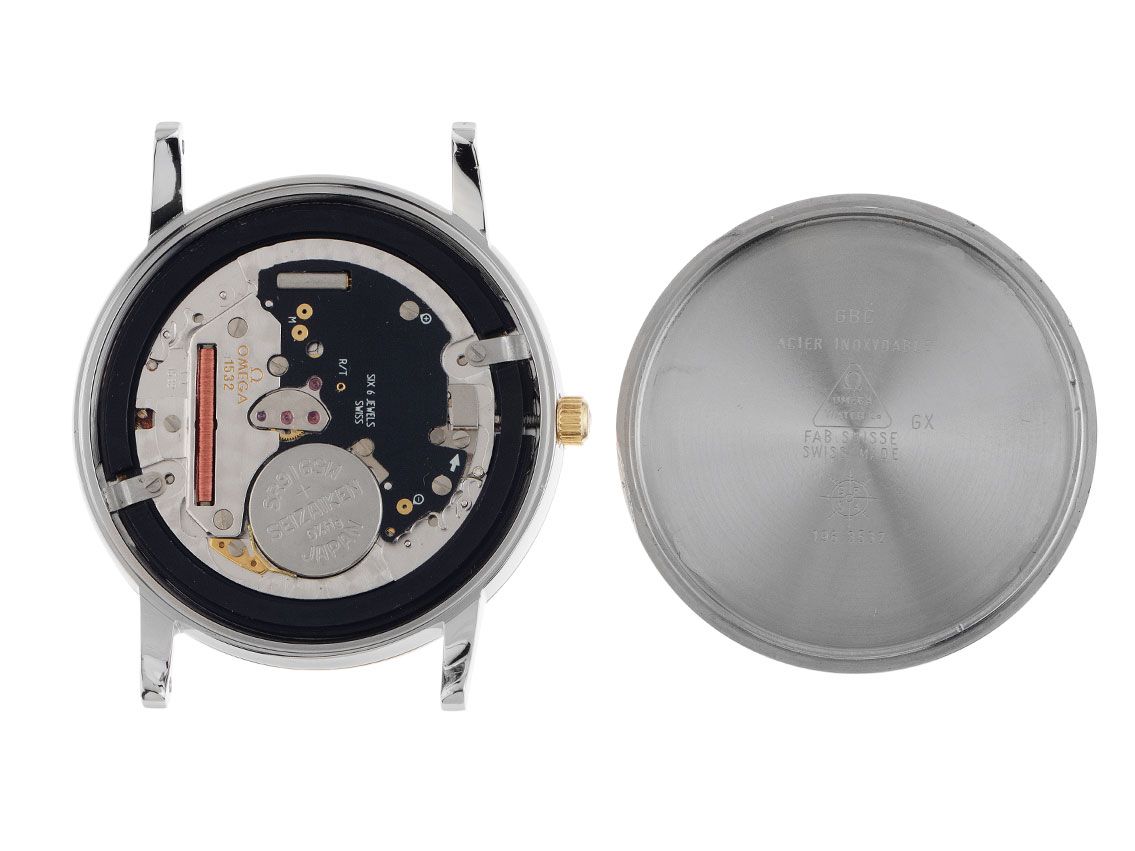 Cassa in acciaio lucido, diametro della cassa senza corona 35mm, altezza della cassa 5,9mm. Lunetta in oro giallo liscia e lucida. Cinturino in pelle nera con cucitura decorativa, larghezza dell'ansa 19mm, fibbia ad ardiglione in acciaio con logo del produttore. Quadrante color argento con numeri romani e indici in oro giallo applicati, oltre a lancette in oro giallo. Movimento al quarzo, calibro Omega 1532 con 6 pietre preziose. Indicazione di ore, minuti e secondi tramite lancette centrali con fermo dei secondi per la regolazione precisa dell'ora, indicazione della data con regolazione rapida a ore 3. Vetro zaffiro antigraffio. Corona zigrinata con logo del produttore. Fondello in acciaio inciso. Peso dell'orologio incluso il cinturino 33g. Numero di riferimento: 7724, numero di cassa: 56821XXX, anno di costruzione: 1997, ID: P076312000325H-3200, numero articolo: 10000079495. Con controllo del movimento, nuova batteria e completa revisione estetica di marzo 2025. Scatola originale Omega e descrizione, oltre a estratto dal Watch Register di marzo 2025, certificato The Watch Register / senza registrazione (database internazionale per orologi smarriti o rubati). Super affare, pezzo da collezione molto raro, quasi mai indossato. Ottime condizioni. Tempi di consegna immediati.