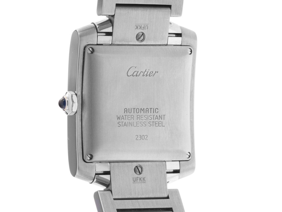 Cassa in acciaio inox lucido e satinato, dimensioni della cassa senza corona (L x P x A) 32 x 28 x 7,5 mm. Bracciale in acciaio inox lucido e satinato, chiusura pieghevole doppia nascosta in acciaio inox. Quadrante color crema con numeri romani neri e lancette blu. Movimento automatico, calibro Cartier 120 con 20 pietre preziose. Indicazione di ore, minuti e secondi tramite lancette centrali, indicazione della data con regolazione rapida a ore 6. Vetro zaffiro antigraffio. Corona con cabochon in zaffiro. Fondello in acciaio inox avvitato quattro volte e inciso. Peso dell'orologio incluso il bracciale 97 g, lunghezza del bracciale incluso la cassa 180 mm. Numero di riferimento: 2302, numero di cassa: 39245XXX, anno di costruzione: 2004, ID: P236746180126H-5400, numero articolo: 10000084466. Con controllo del movimento e completa revisione esterna di gennaio 2026. Scatola originale Cartier e descrizione, estratto dal Watch Register di gennaio 2026, certificato The Watch Register / senza registrazione (database internazionale per orologi smarriti o rubati). Super affare. Ottime condizioni. Tempi di consegna immediati.