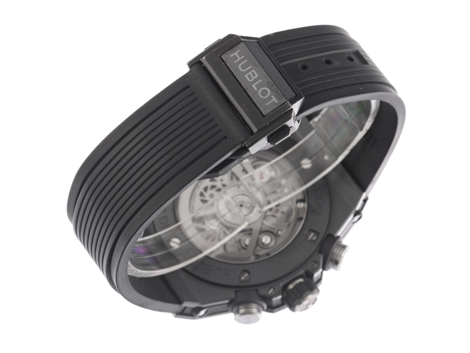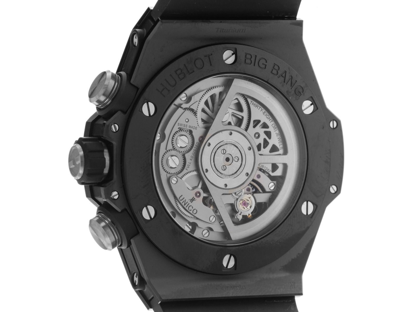 Cassa in ceramica satinata, diametro della cassa senza corona 44mm, altezza della cassa 15,7mm. Lunetta in ceramica nera, avvitata 6 volte. Cinturino in caucciù nero, chiusura di sicurezza in titanio con inserto in ceramica e logo del produttore. Quadrante scheletrato con numeri arabi applicati e indici, oltre a lancette in acciaio inossidabile. Movimento automatico, cronografo, calibro HUB1242 con 38 pietre preziose. Indicazione di ore e minuti tramite lancette centrali, piccolo secondo con stop dei secondi per la regolazione precisa dell'ora a 9 ore, indicazione della data con regolazione rapida a 3 ore. Vetro zaffiro antigraffio. Corona avvitabile con rivestimento in caucciù. Fondello in titanio avvitato 6 volte e inciso con finestra in vetro zaffiro. Peso dell'orologio incluso il cinturino 142g. Numero di riferimento: 411.C1.1170.RX, numero della cassa: 1371XXX, ID: P2380127240126H-19600, numero articolo: 10000084502. Con controllo del movimento e completa rifinitura esterna di gennaio 2026. Scatola originale Hublot con imballaggio e documenti di garanzia di dicembre 2020, oltre a estratto dal Watchregister di gennaio 2026, certificato The Watch Register / senza registrazione (database internazionale per orologi smarriti o rubati), Full Set. Super affare, investimento con potenziale di apprezzamento, quasi mai indossato. Come nuovo. Tempi di consegna immediati.