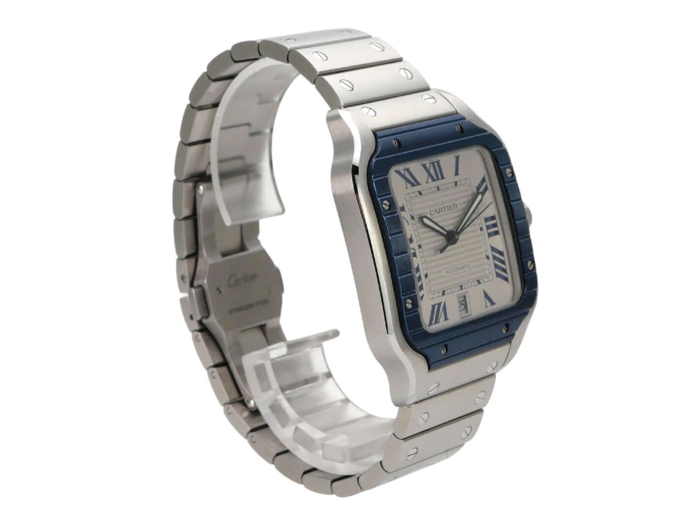 Cartier Santos de Cartier stainless steel large model Ref. WSSA0047Case made of polished and satin-finished stainless steel, case diameter 39.8 mm, case height 9.38 mm, stainless steel bezel with blue DLC coating, satin-finished stainless steel bracelet with double folding clasp, second strap made of blue rubber with Quickswitch, grey dial with blue Roman numerals, automatic movement, Cartier caliber 1847 MC, date, sapphire glass, crown with flank protection, screwed stainless steel back, water-resistant up to 10 bar.