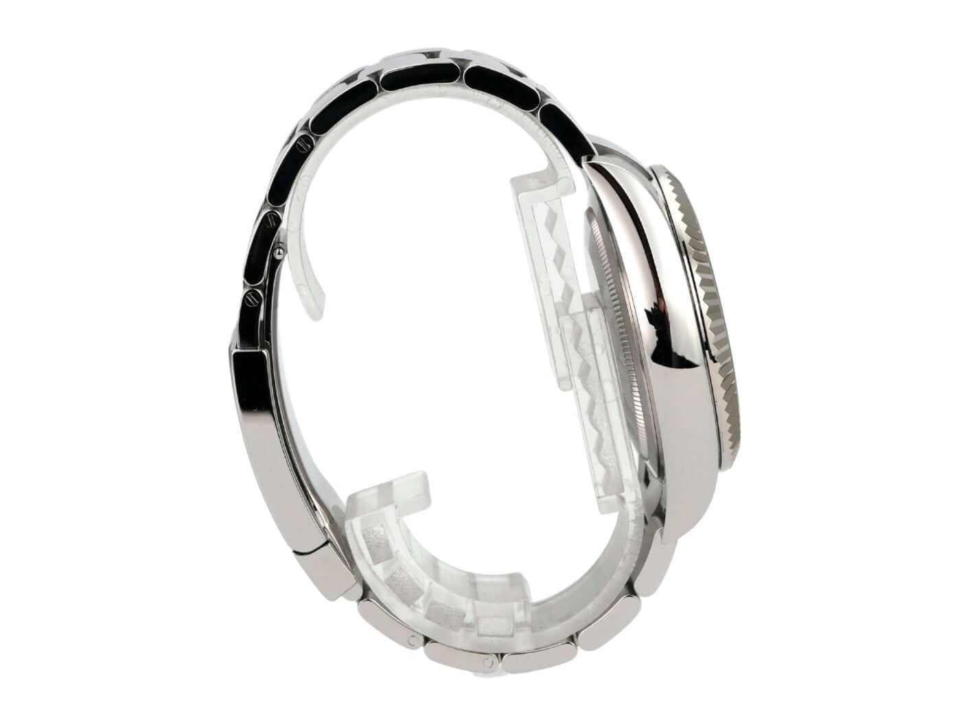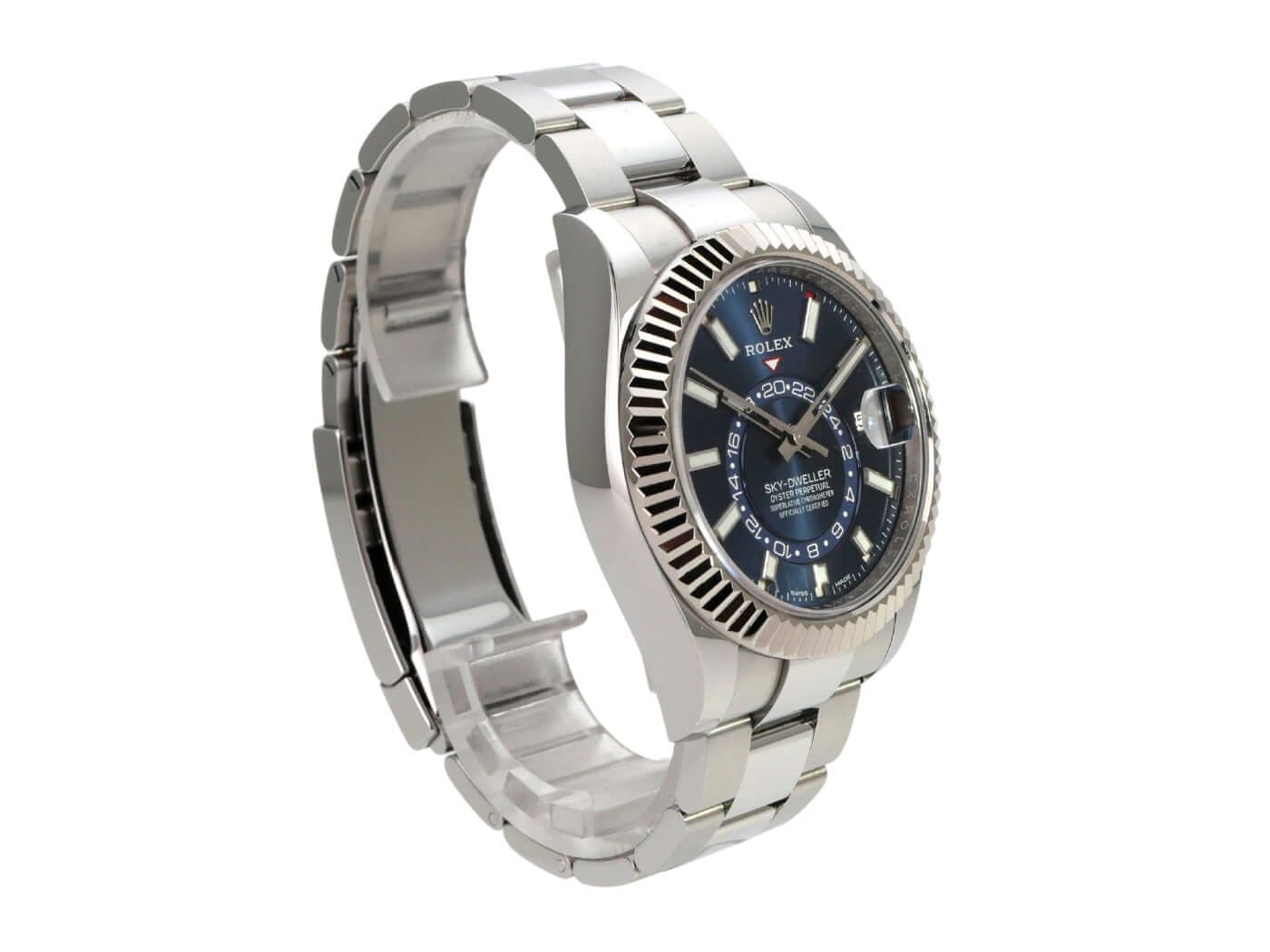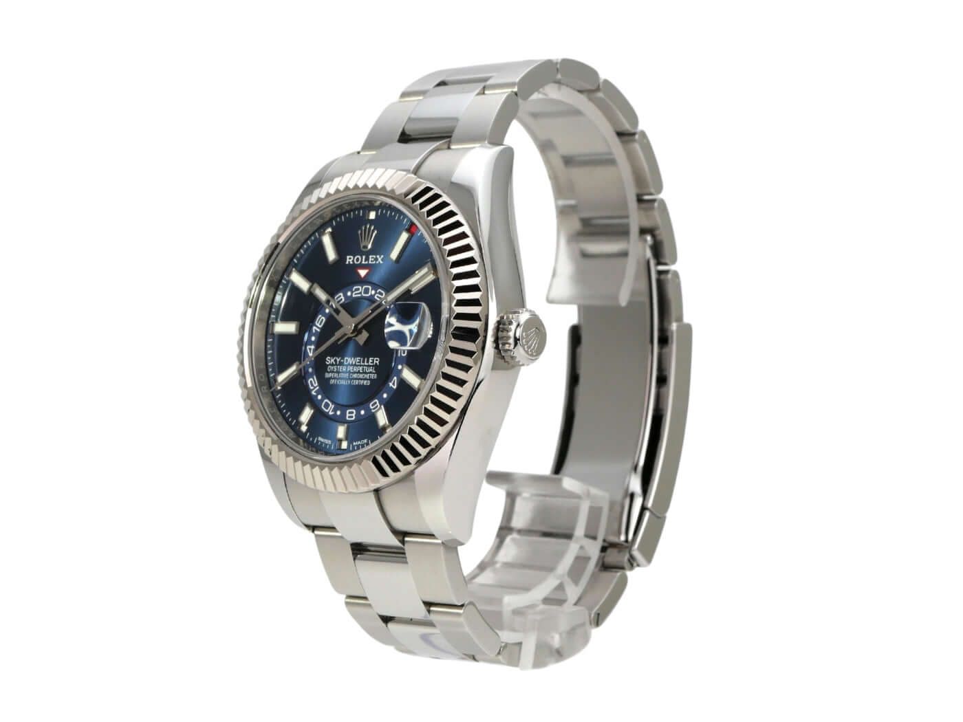 Rolex Sky-Dweller stainless steel / white gold Ref. 326934 blue from 2022Case made of polished and satin-finished stainless steel, case diameter 42 mm, case height 14 mm, bidirectional rotating Ring-Command bezel made of 18 kt white gold, Oyster bracelet made of polished and satin-finished stainless steel with Oysterclasp folding clasp, blue dial with applied luminous hour markers, luminous hands, self-winding movement, Rolex manufacture caliber 9001 with 40 jewels, frequency 28,800 vibrations per hour, power reserve of approximately 72 hours, SAROS annual calendar, month display in a window, chronometer, scratch-resistant sapphire crystal, screw-down crown, screwed stainless steel back, water-resistant up to 10 bar.