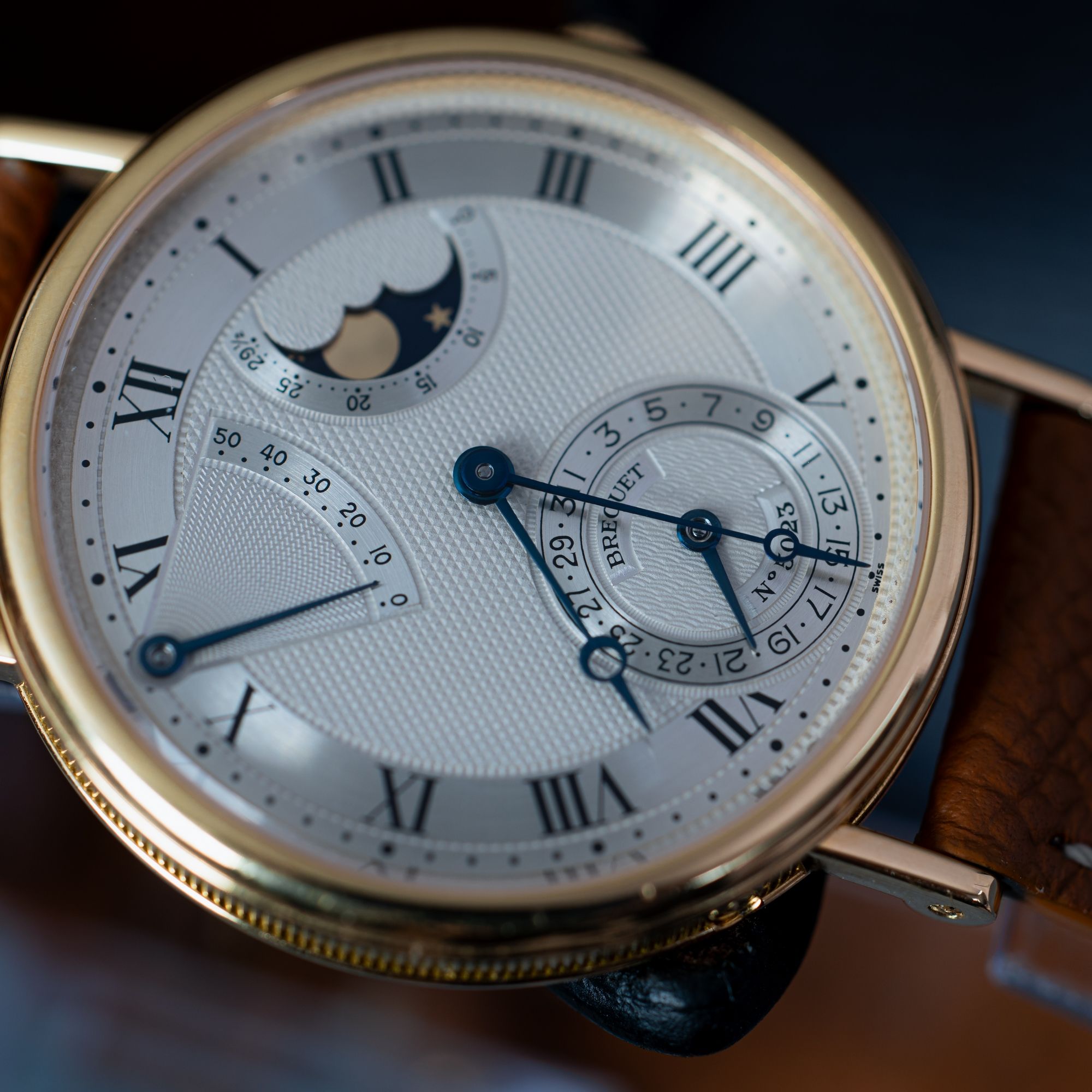 Il quadrante presenta squisite decorazioni guilloché e una finitura raffinata. Alle 1, un'apertura per la fase lunare aggiunge un tocco poetico — una delle complicazioni visivamente più affascinanti. È completata da un indicatore di riserva di carica e da una finestra per la data, creando un layout splendidamente bilanciato e altamente funzionale. Le lancette bluate a caldo completano l'estetica classica di Breguet.