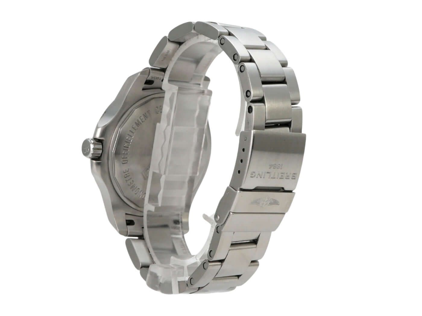 Cassa in acciaio inossidabile satinato, diametro cassa 41 mm, altezza cassa 12,4 mm, lunetta in acciaio inossidabile satinato con scala di 60 minuti, girevole unidirezionale con blocco, bracciale in acciaio inossidabile satinato da pilota con chiusura pieghevole, quadrante grigio con indici luminosi applicati, lancette luminose, movimento automatico, calibro Breitling 17, 25 rubini, 28.800 vibrazioni all'ora, riserva di carica di circa 40 ore, data, cronometro con certificato, vetro zaffiro con trattamento antiriflesso su entrambi i lati, corona a vite con protezione laterale, fondello in acciaio inossidabile avvitato, impermeabile fino a 20 bar.