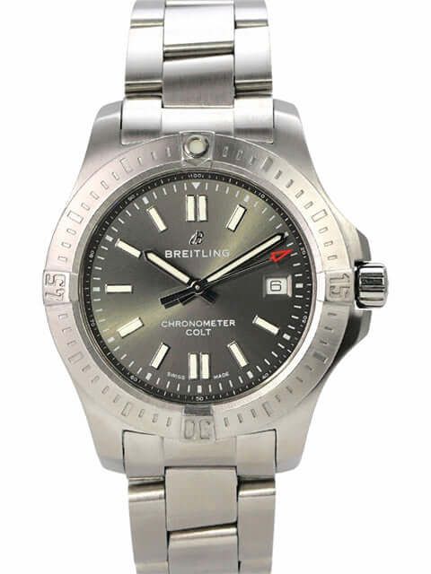 Breitling Chronomat Colt Automatic 41 Ref. A17313101F1A1Case made of satin-finished stainless steel, case diameter 41 mm, case height 12.4 mm, satin-finished stainless steel bezel with 60-minute scale, unidirectional rotating with lock, pilot satin-finished stainless steel bracelet with folding clasp, grey dial with applied luminous indices, luminous hands, automatic movement, caliber Breitling 17, 25 jewels, 28,800 vibrations per hour, power reserve approx. 40 hours, date, chronometer with certificate, sapphire crystal with anti-reflective coating on both sides, screw-down crown with flank protection, screwed stainless steel case back, water-resistant up to 20 bar.
