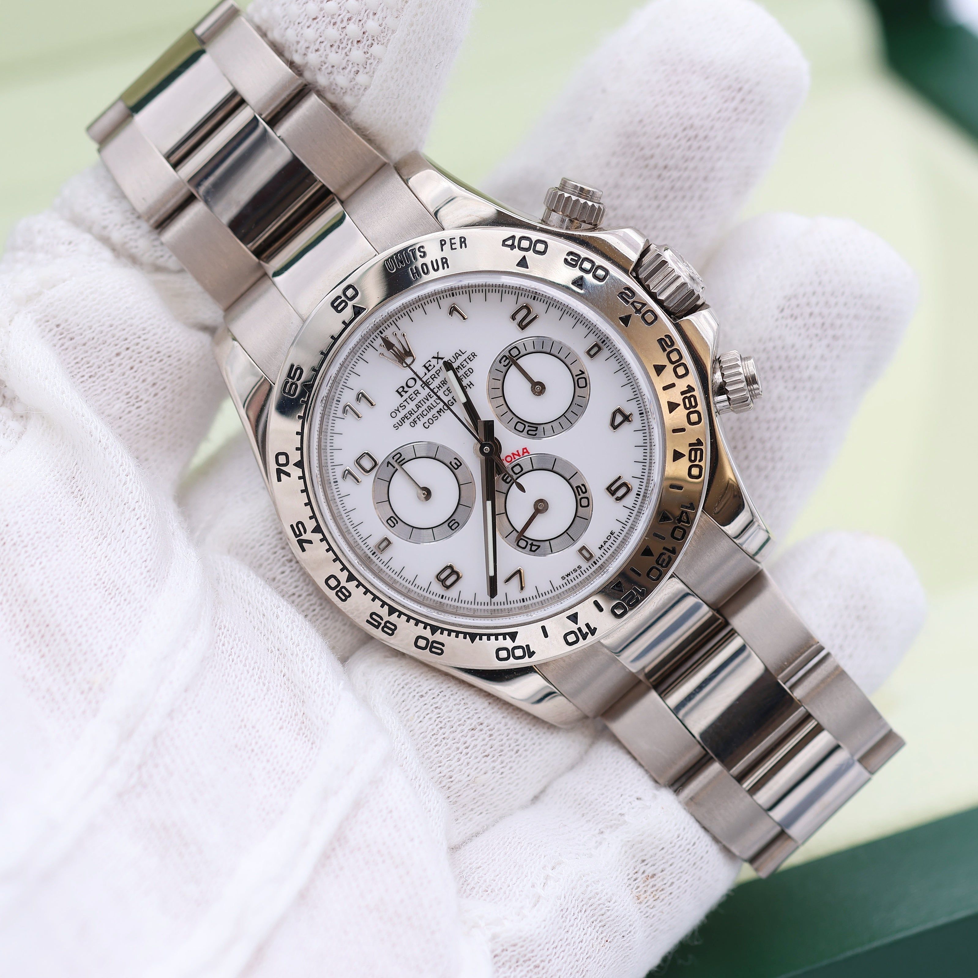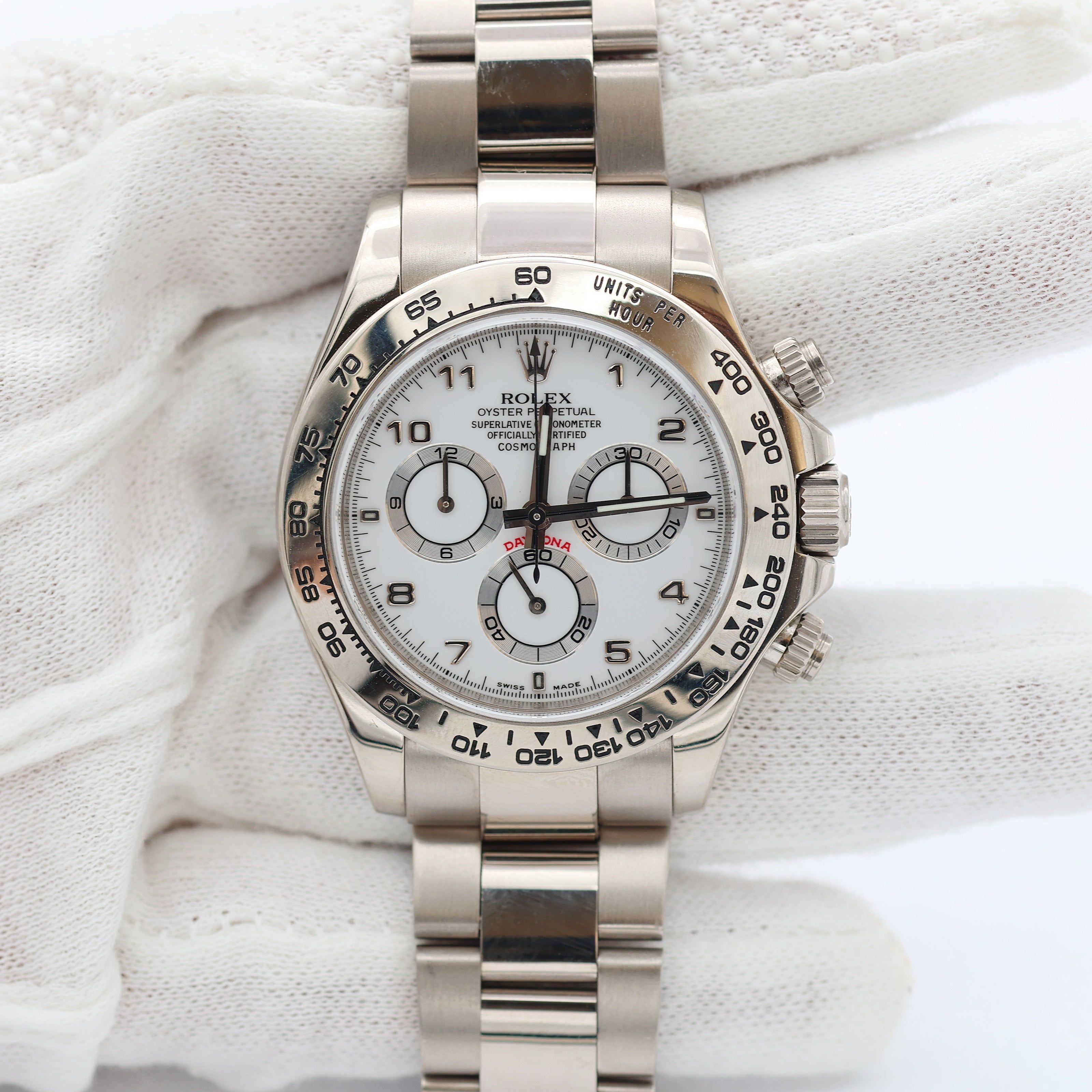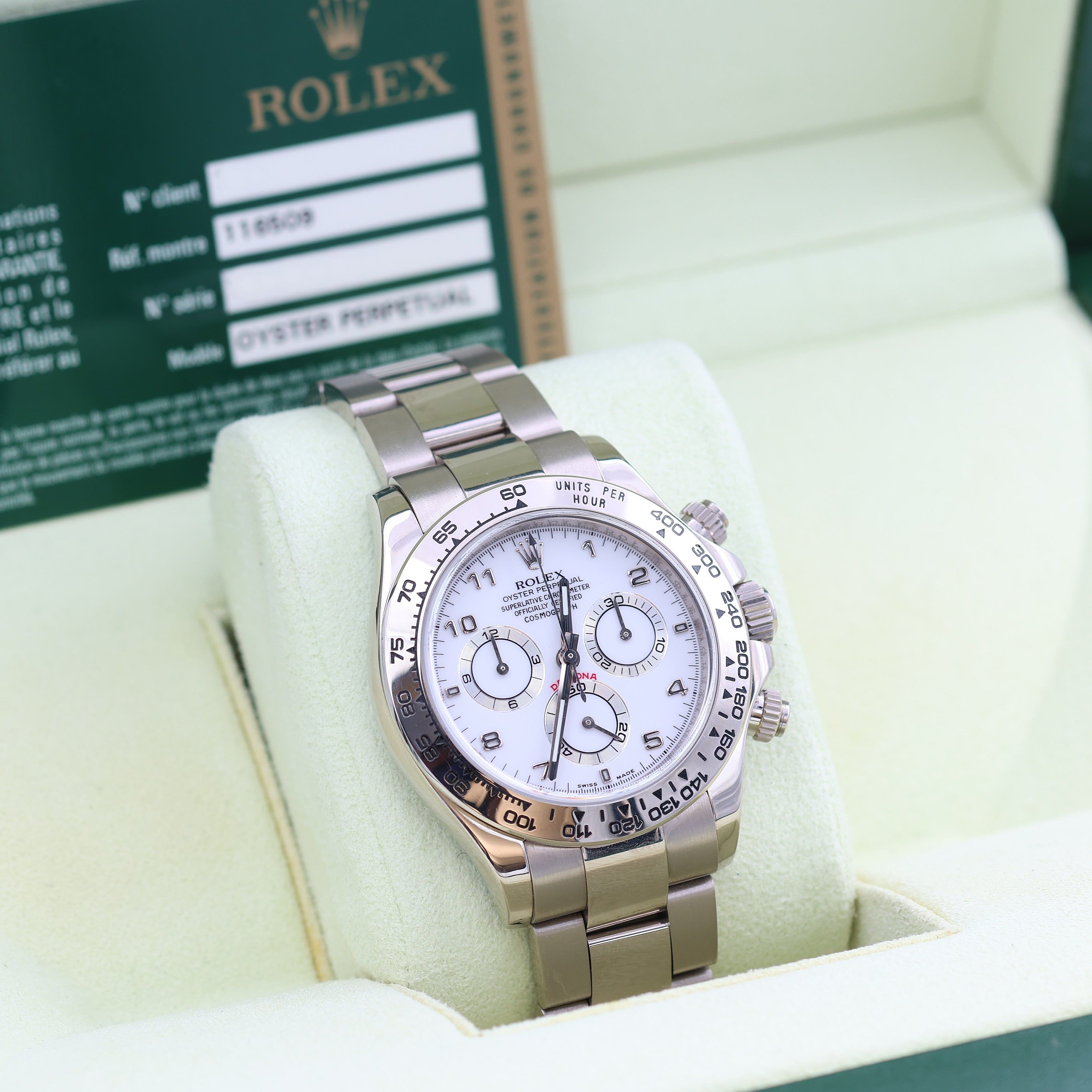 For sale at Debonar Watches: pre-owned Rolex Daytona 116509, full set, with a bright white dial with arabic numbers.Both the case and the bezel are made of 18ct white gold. A tachymetric scale is engraved into the bezel for timing speed over distance. This reference comes with the Oyster bracelet.Underneath its polished facade, the 116509 employs the Rolex Caliber 4130. Known for its precision and reliability, this self-winding chronograph movement showcases a 72-hour power reserve, ensuring that the watch seamlessly melds form and function.Its story starts all the way back to the year 1963, when the first Cosmograph chronograph was introduced. The first Cosmograph, the ref. 6239, wasn't a hit straight out of the gate for Rolex – in fact, it sold sluggishly at first.The six-digit reference Daytona watches made their debut at Baselworld in 2000 where the previous Zenith El Primo movements were replaced with Rolex’s in-house Caliber 4130. The COSC-certified Caliber 4130 automatic chronograph movement has several advantages including fewer components for improved reliability, the Parachrom hairspring for increased resistance to external elements, and 72 hours of power reserve. Shortly after the release of the first batch of Daytona watches with in-house movements, Rolex added the full white gold Daytona 116509 to the range in 2004, complete with a white gold Oyster bracelet. BRAND ROLEX MODEL DAYTONA REFERENCE 116509 CASE MATERIAL GOLD MOVEMENT AUTOMATIC DIMENSION 40 MM DIAL WHITE ARABIC BEZEL GOLD CRYSTAL SAPPHIRE BRACELET TYPE OYSTER BRACELET MATERIAL GOLD BRACELET LENGHT 18 CM ORIGINAL BOX YES ORIGINAL PAPERS YES YEAR 2010-20 CONDITION EXCELLENT