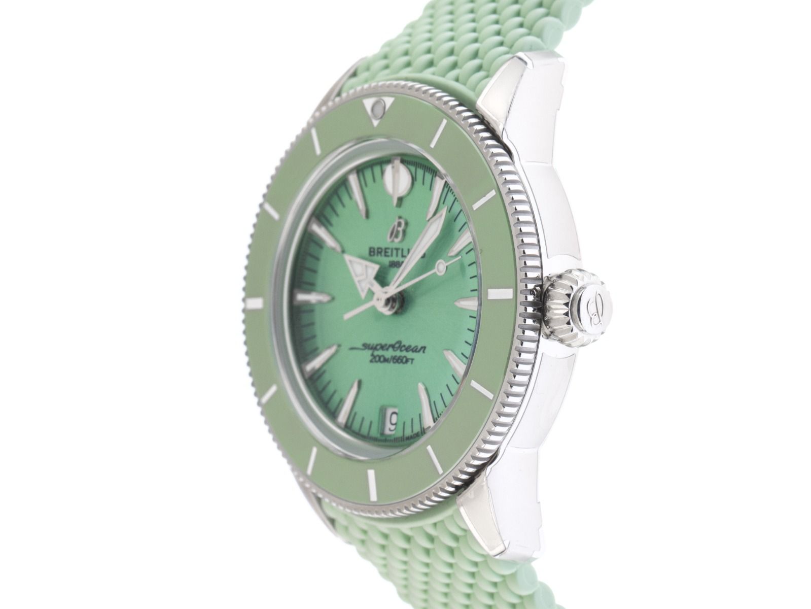 Breitling Superocean Stahl Automatik Chronometer Armband Kautschuk FaltschließeGehäuse Edelstahl poliert und satiniert, Gehäusedurchmesser ohne Krone 36mm, Gehäusehöhe 12,2mm. Lünette Edelstahl geriffelt mit grünem Inlay und 60-Minuten Skala, einseitig drehbar. Armband Kautschuk grün, Anstoßbreite 18mm, Sicherheitsfaltschließe Edelstahl mit Hersteller-Logo. Zifferblatt grün mit Edelstahl Leuchtindexen und Edelstahl Leuchtzeigern. Uhrwerk Automatik, Chronometer mit Zeugnis, Kaliber Breitling 10 mit 25 Edelsteinen, Gangreserve ca. 42 Stunden. Anzeige von Stunde, Minute und Sekunde über Zeiger aus der Mitte mit Sekundenstopp zur sekundengenauen Einstellung der Uhrzeit, Datumsanzeige mit Schnellverstellung bei 6 Uhr. Saphirglas kratzfest, doppelseitig entspiegelt und bombiert. Krone verschraubbar mit Hersteller-Logo. Boden Edelstahl verschraubt und graviert. Gewicht der Uhr inklusive Armband 80g. Wasserdicht bis 20 ATM. Referenznummer: A10390361L1S1, ID: ST116072480226H-5350, Artikelnummer: 10000084669. Original Breitling Box und Garantie Papiere von 2026, Full Set. Ungetragen. Lieferzeit sofort.